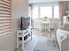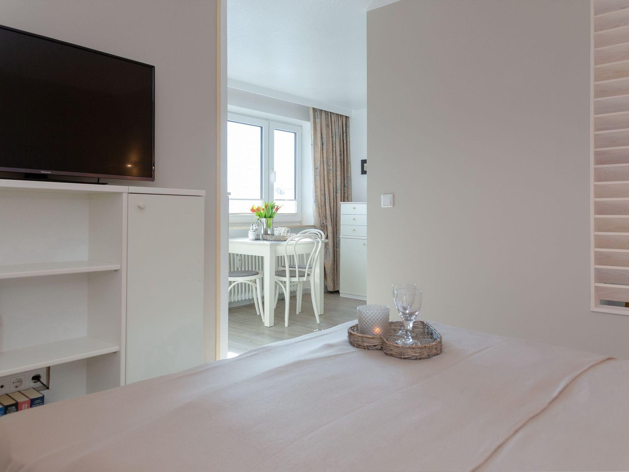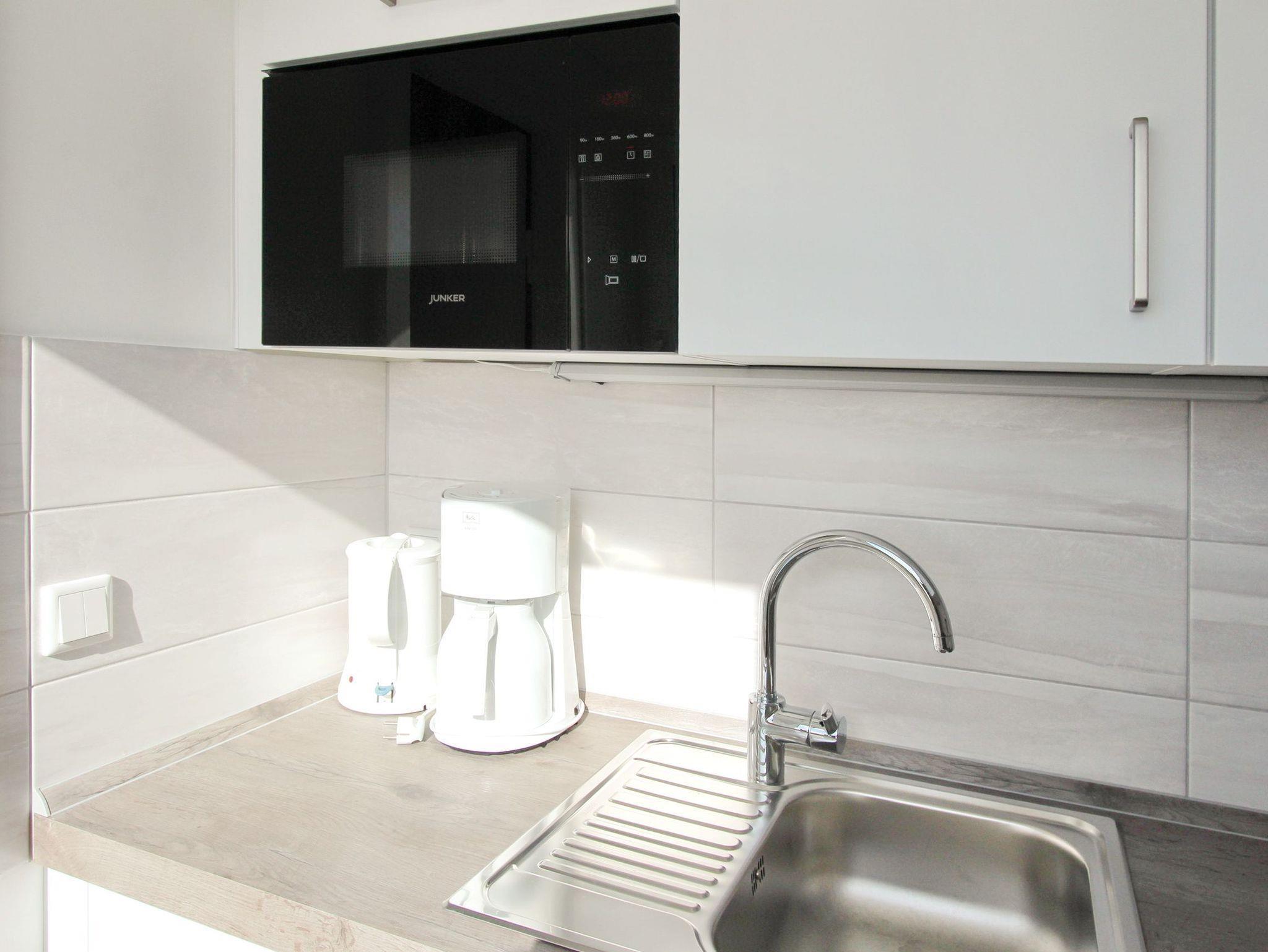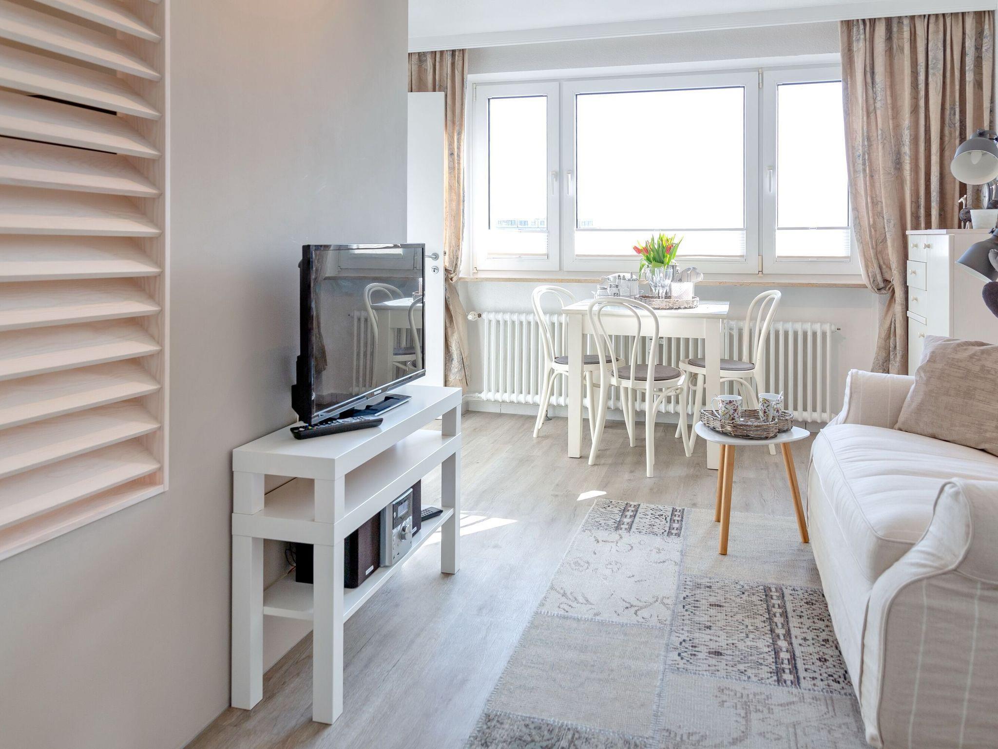 Kleine Wohlfühloase in direkter Strandnähe. Diese hell und freundlich eingerichtete Einzimmerwohnung in der 4. Etage im Beach House Stil verfügt über einen kombinierten Wohn-/Schlafraum mit einem feststehenden Bett, einen Essplatz für 2 Personen am Fenster und eine bequemen Couch mit Stoffbezug. Der Laminatboden macht den Raum hell und verleiht ihm ein angenehmes Wohnklima. In der kleinen, modernen Küche mit Geschirrspüler, 4 Platten-Ceranfeld und Mikrowelle können sie sich selbst versorgen. Die Küche hat ein Fenster zur Ostseite und ist somit gut zu belüften. Badezimmer mit Luxus-Komfort-Duschtempel, Fön, Handtuchtrockner und Kosmetikspiegel. Zur technischen Ausstattung gehört: ein Smart-Flachbildfernseher und eine Stereoanlage mit CD Player. Der Eigentümer bittet Sie darum, in dieser Wohnung nicht zu rauchen. Ein kostenfreier Hotspot im Haus, der ihnen kabellosen Zugang ins Internet ermöglicht, ist vorhanden (WEG-AD3 - Passwortfrei - ohne Gewähr). Die Größe dieser Nichtraucherwohnung beträgt: ca. 35 m². Vierbeinige Begleiter sind ausdrücklich erlaubt.