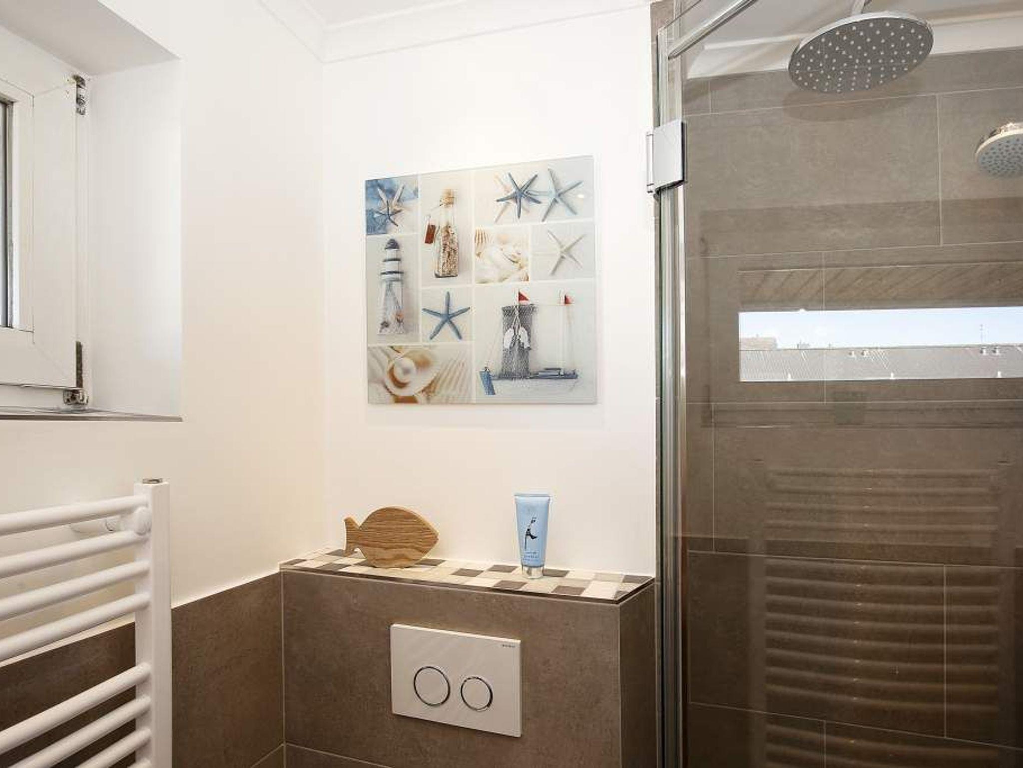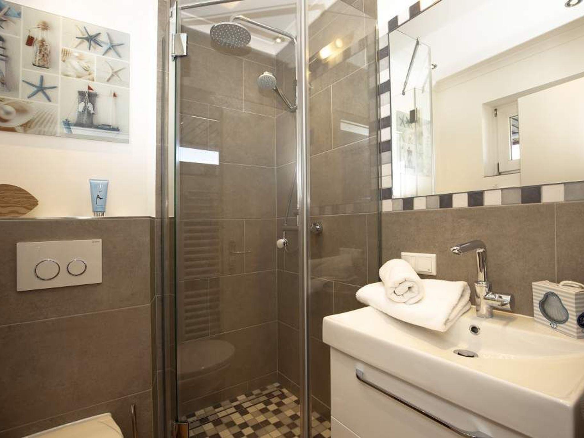 Vom geräumigen Vorflur aus gelangen Sie direkt in das moderne Duschbad mit extraflachem Einstieg, Handtuchtrockner, Waschtisch und Föhn. Die stilvolle Küche mit Theke ist voll ausgestattet und bietet unter anderem ein 4-Platten-Ceranfeld, eine Backofen-/Mikrowellenkombination, Kaffee- und Espressomaschine, Eierkocher und Toaster ? perfekt für genussvolle Urlaubstage.
