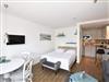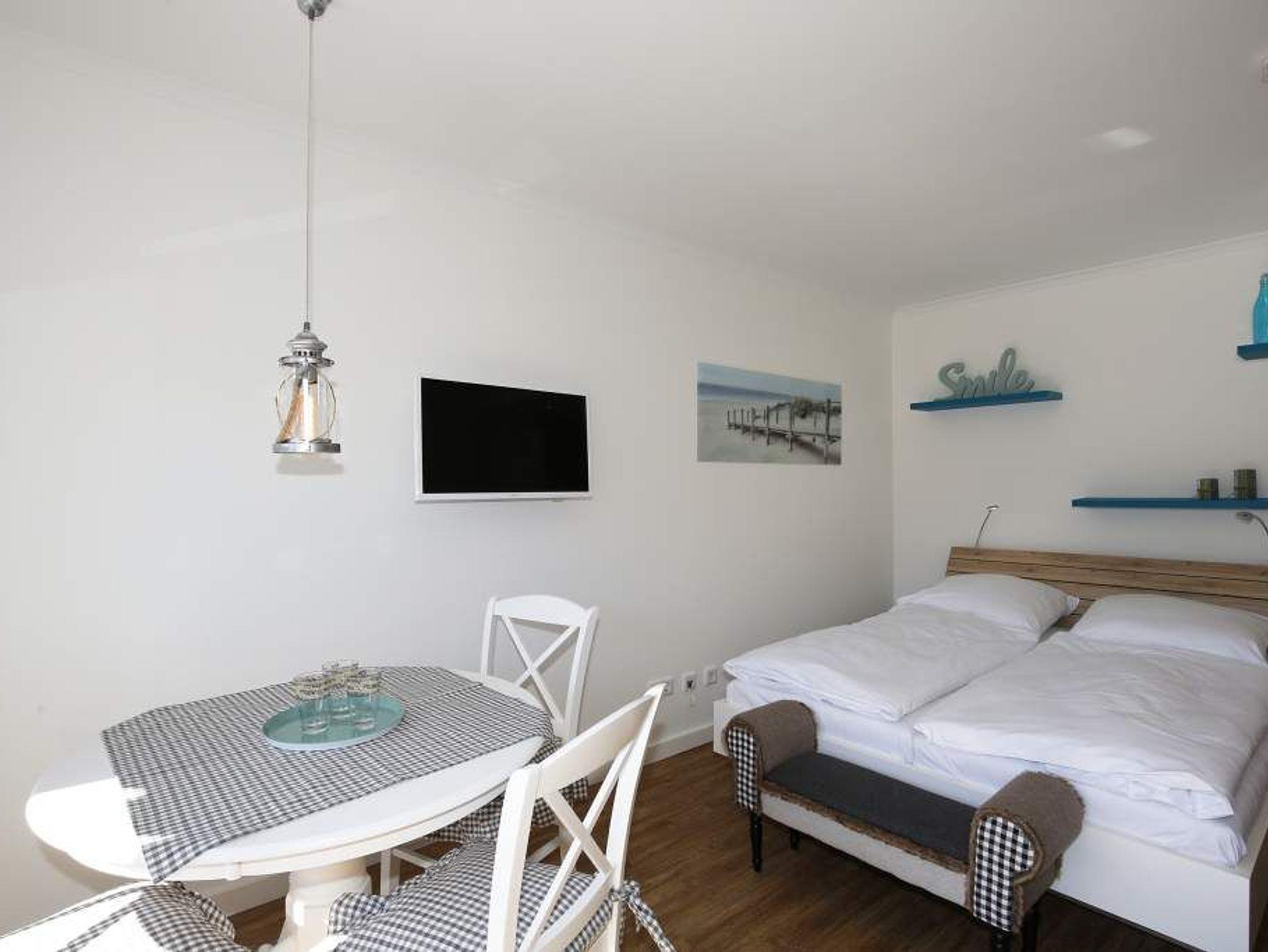 Der lichtdurchflutete Wohn-/Schlafbereich mit breiter Südfensterfront ist geschmackvoll eingerichtet: ein bequemes Doppelbett mit zwei Einzelmatratzen (je 0,80 x 2,00 m), eine gemütliche Essecke sowie ein Sofa mit Blick auf den Flachbild-Kabel-TV laden zum Verweilen ein. Eine moderne Radio-/CD-Anlage sowie eine schnelle WLAN-Verbindung (ohne Gewähr) runden das Angebot ab.