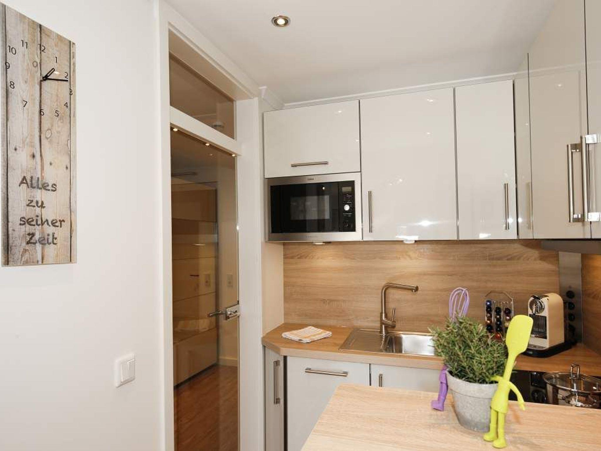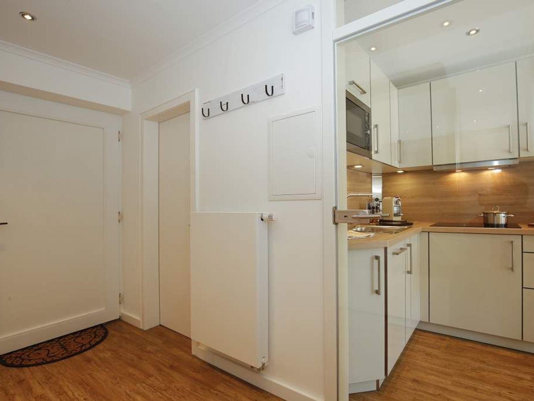 Vom geräumigen Vorflur aus gelangen Sie direkt in das moderne Duschbad mit extraflachem Einstieg, Handtuchtrockner, Waschtisch und Föhn. Die stilvolle Küche mit Theke ist voll ausgestattet und bietet unter anderem ein 4-Platten-Ceranfeld, eine Backofen-/Mikrowellenkombination, Kaffee- und Espressomaschine, Eierkocher und Toaster perfekt für genussvolle Urlaubstage.