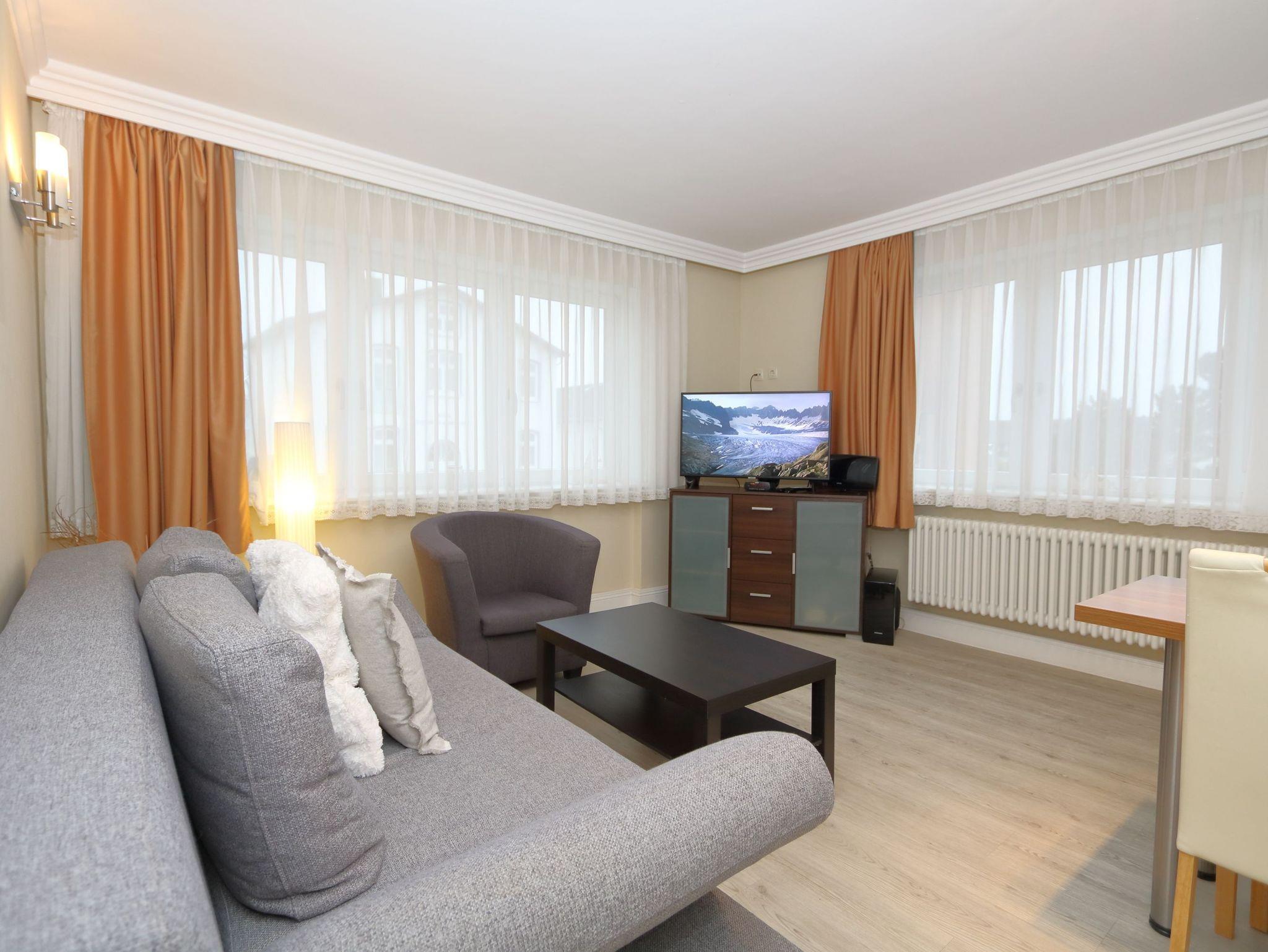 Im Wohnzimmer ist eine bequeme Schlaf-Couchgarnitur mit Clubtisch und Sessel. Eine kleine Eßecke für 4 Personen schließt sich daran an.