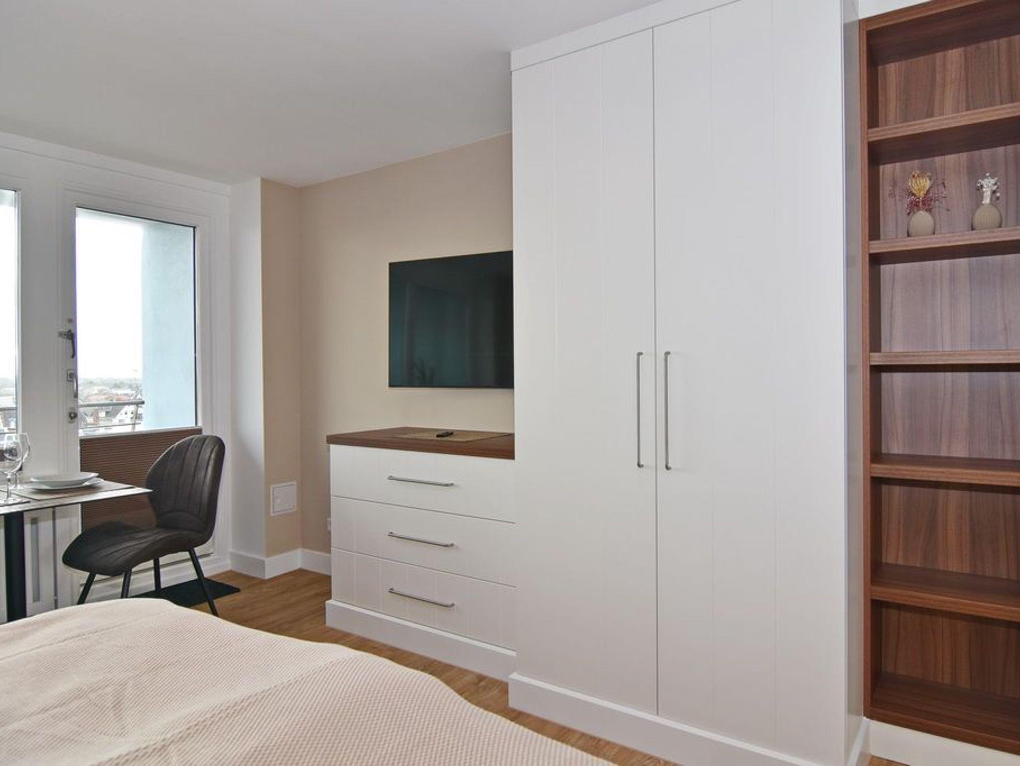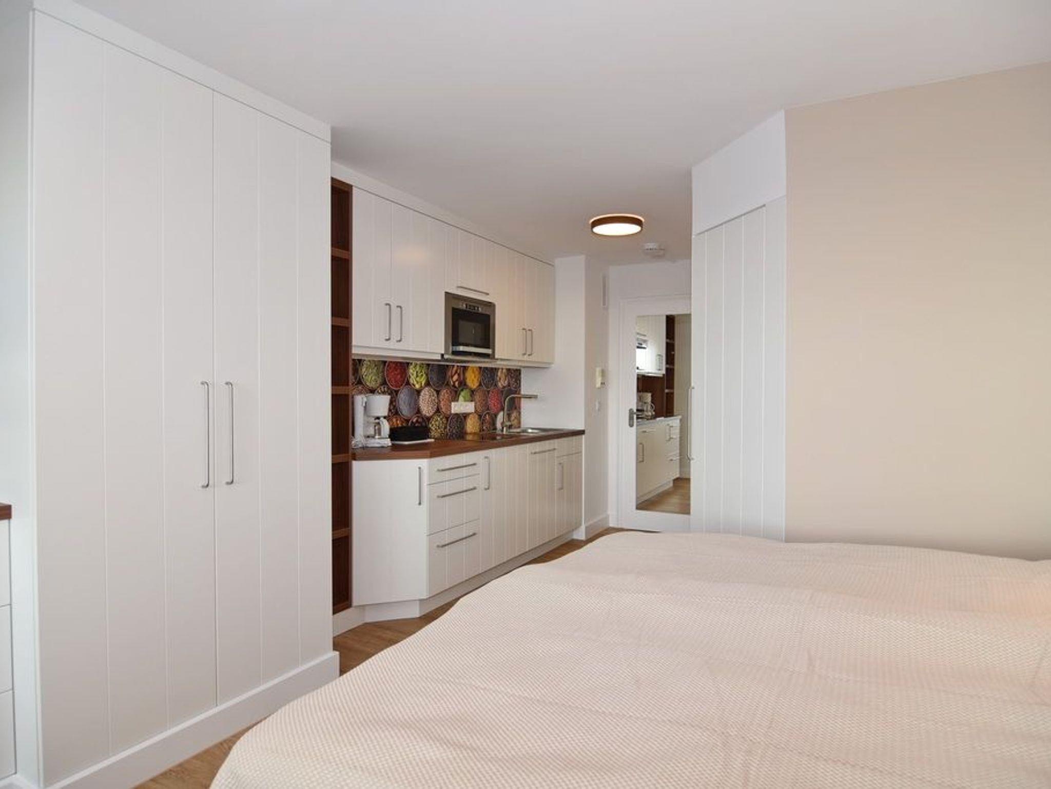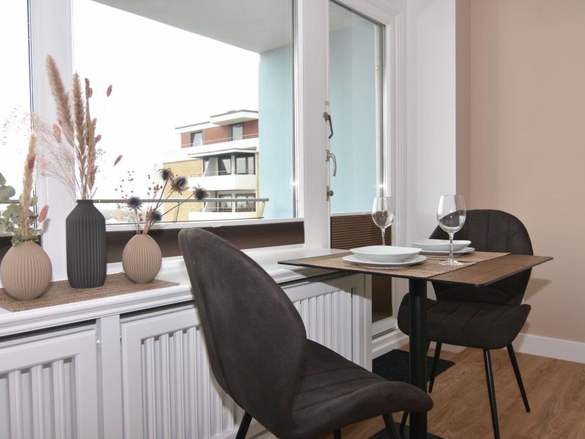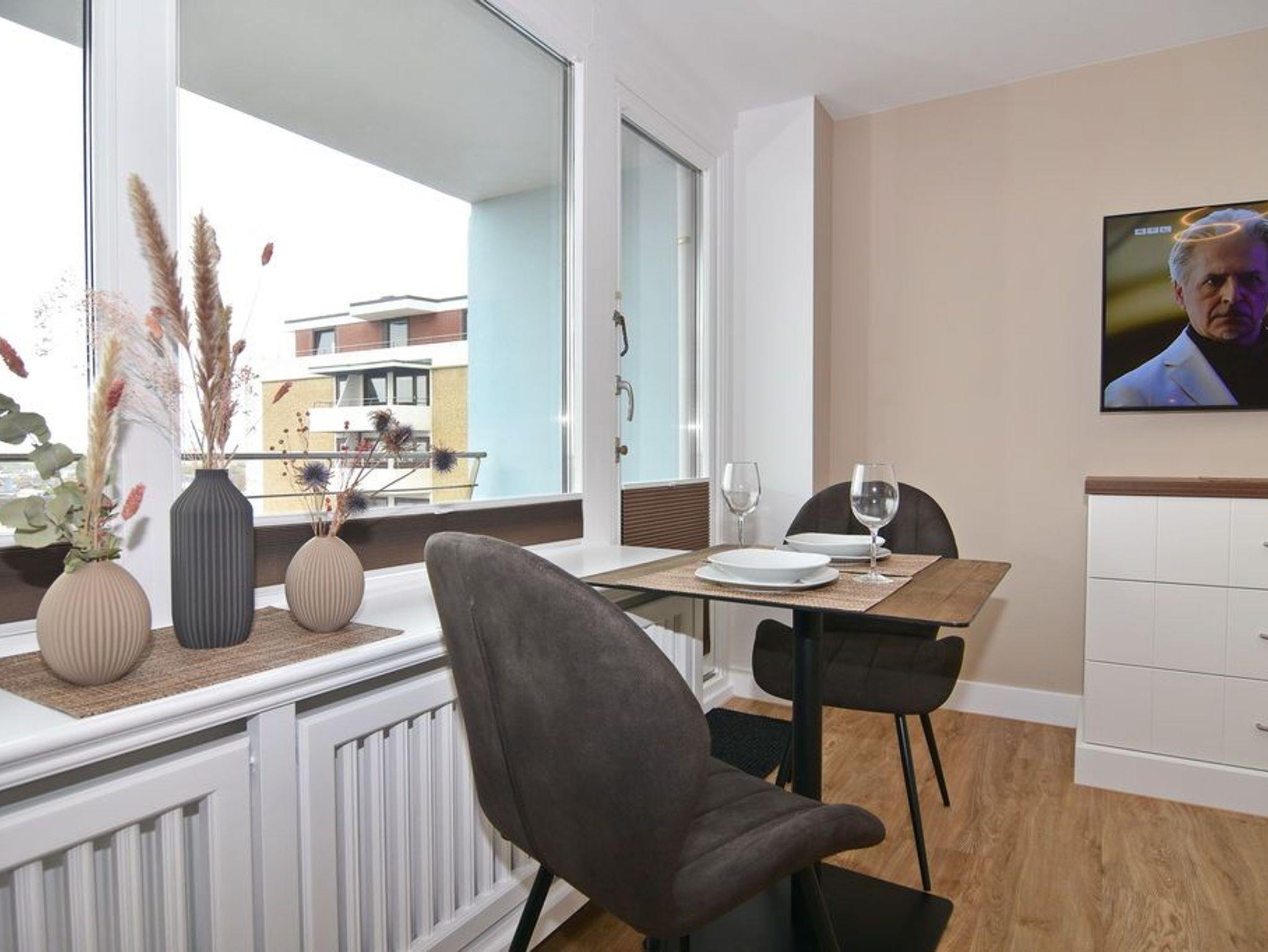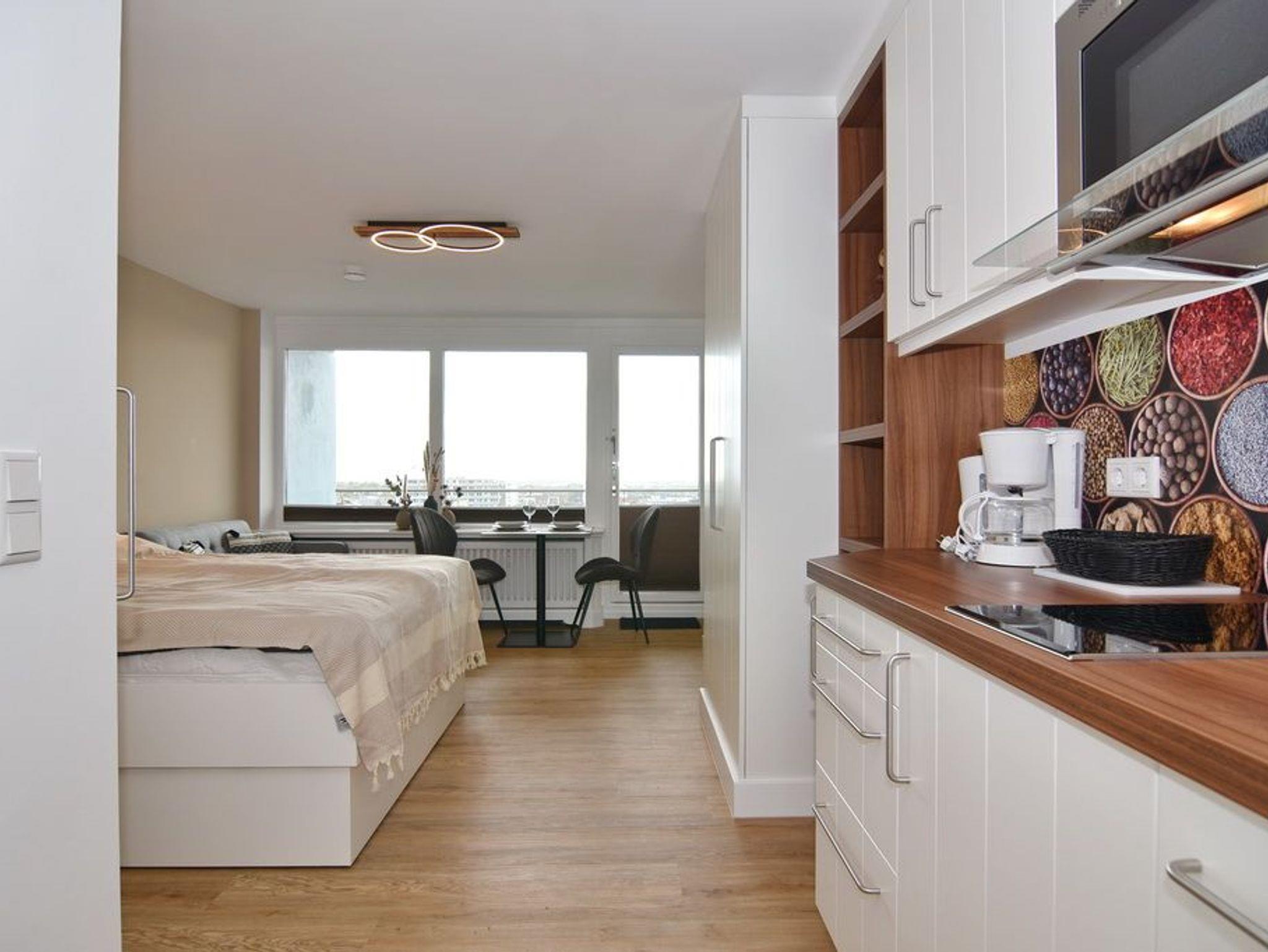 Modernes 1-Zimmer-Apartment im Haus Metropol im 6. OG zur Landseite. Ca. 30 m² mit Ostbalkon und Balkonmöbeln, Nichtraucher-Apartment. Wohn-/Schlafraum mit Doppelbett (160x200 - 2 Matratzen ) und Essplatz am Fenster, Sofa, Flat-TV, Radio und W-LAN (ohne Gewähr), Küchenzeile mit Mikrowelle, Geschirrspüler und 2 Platten-Ceranfeld, Duschbad/WC. Tierhaltung ist nicht gestattet. Bettwäsche und Handtücher sind zur Anreise aufgezogen. Ein PKW-Stellplatz kann kostenpflichtig zugebucht werden.