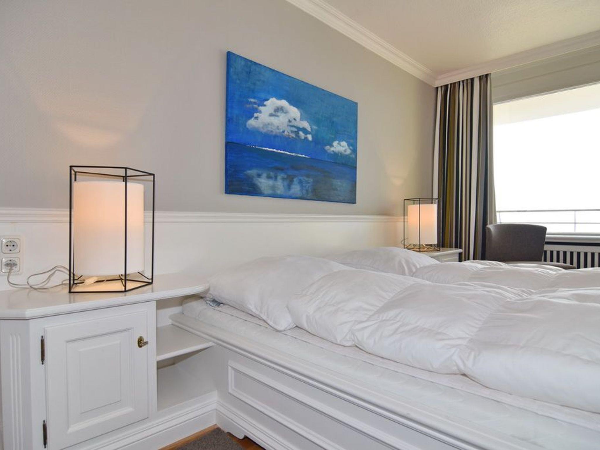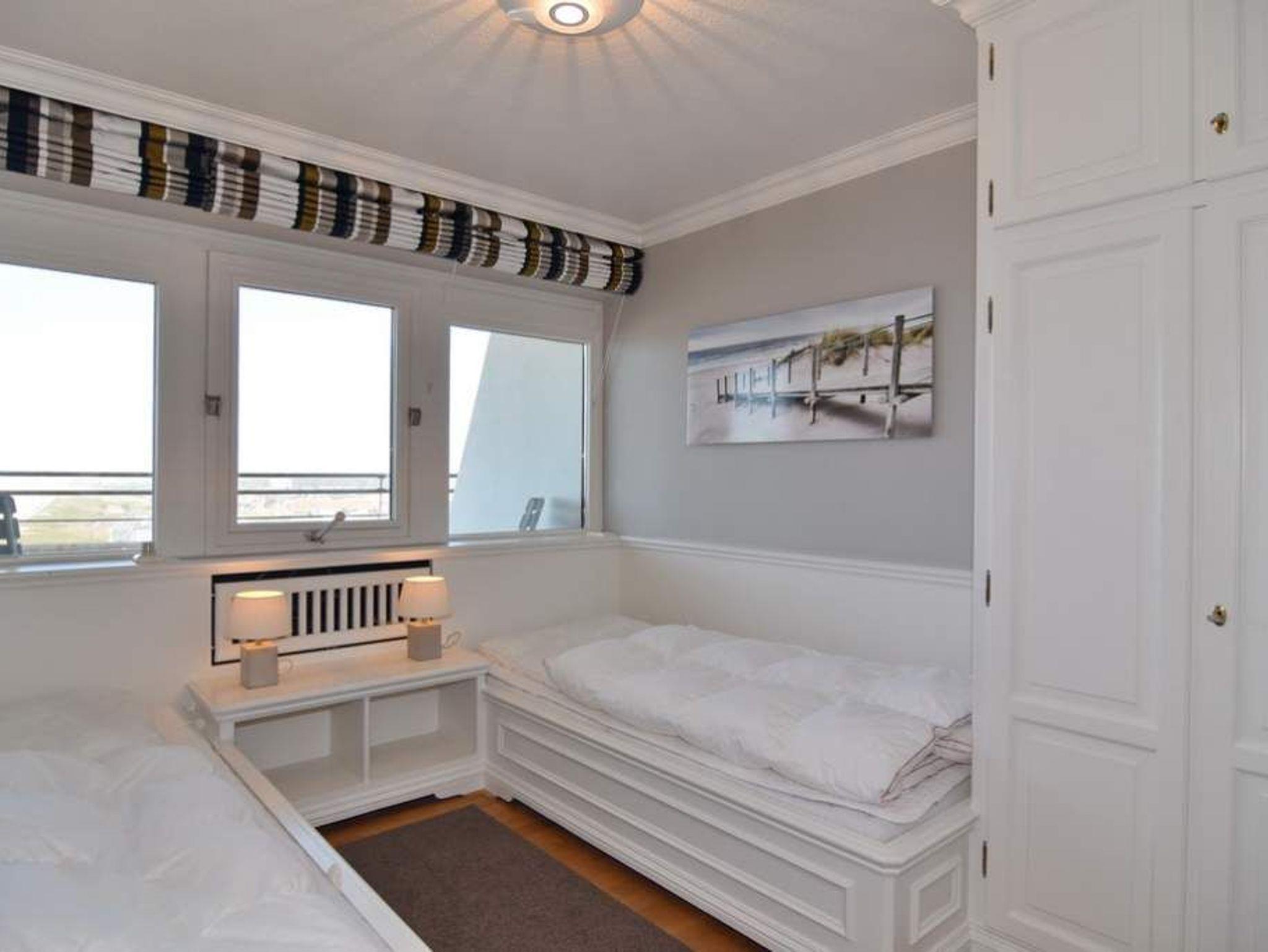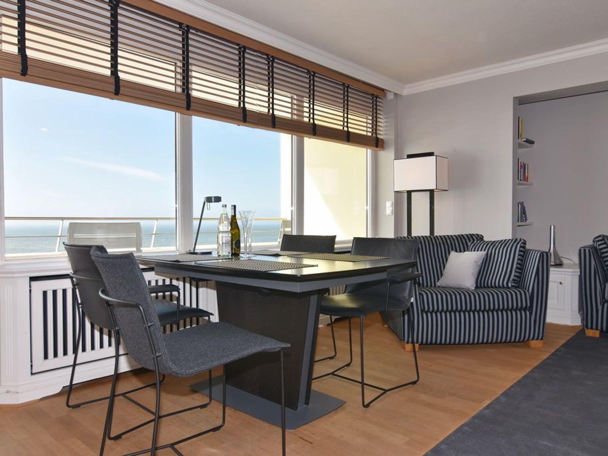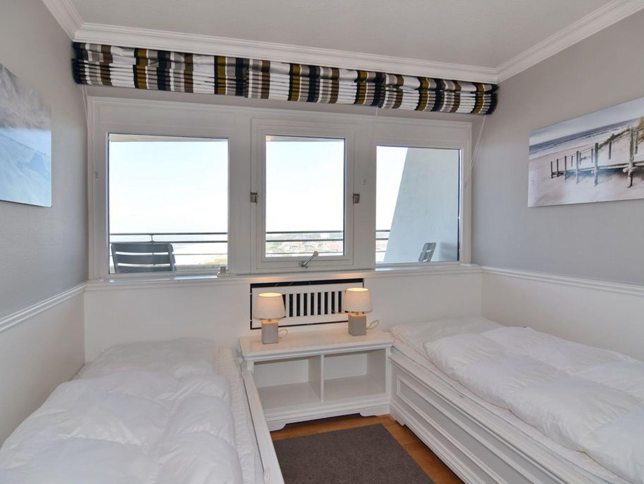 . Exklusive 3-Zimmer-Ferienwohnung im 11. Stock des Haus Metropol. Nichtraucher-Whg.![nbsp][nbsp]Wohnzimmer mit großzügiger Couch und Sessel, Eßplatz am Fenster mit Blick auf das Meer, TV, Radio, WLAN (ohne Gewähr),[nbsp][nbsp]separate Küche mit Geschirrspüler und Backofen. Vom Wohnzimmer gelangen Sie auf den West- und Nordbalkon, beide bieten einen herrlichen Meeresblick. Für die Ruhestunden bietet die Wohnung ein großes Schlafzimmer mit Doppelbett (180x200), Einbauschränken, Flachbild-TV, eigenem Westbalkon mit Meeresblick und Vollbad ensuite. Vom zweiten Schlafzimmer mit 2 Einzelbetten (90x200) und Einbauschrank gelangen Sie über den Flur ins Duschbad/WC. Tierhaltung und Rauchen sind hier nicht gestattet. Der dazugehörige Garagen-Stellplatz (10/T03) kann bei Buchungsabschluss zu € 15,--/Nacht gebucht werden. Waschküche und Fahrradkeller befinden sich im Haus. Bettwäsche und Handtücher sind zur Anreise aufgezogen..