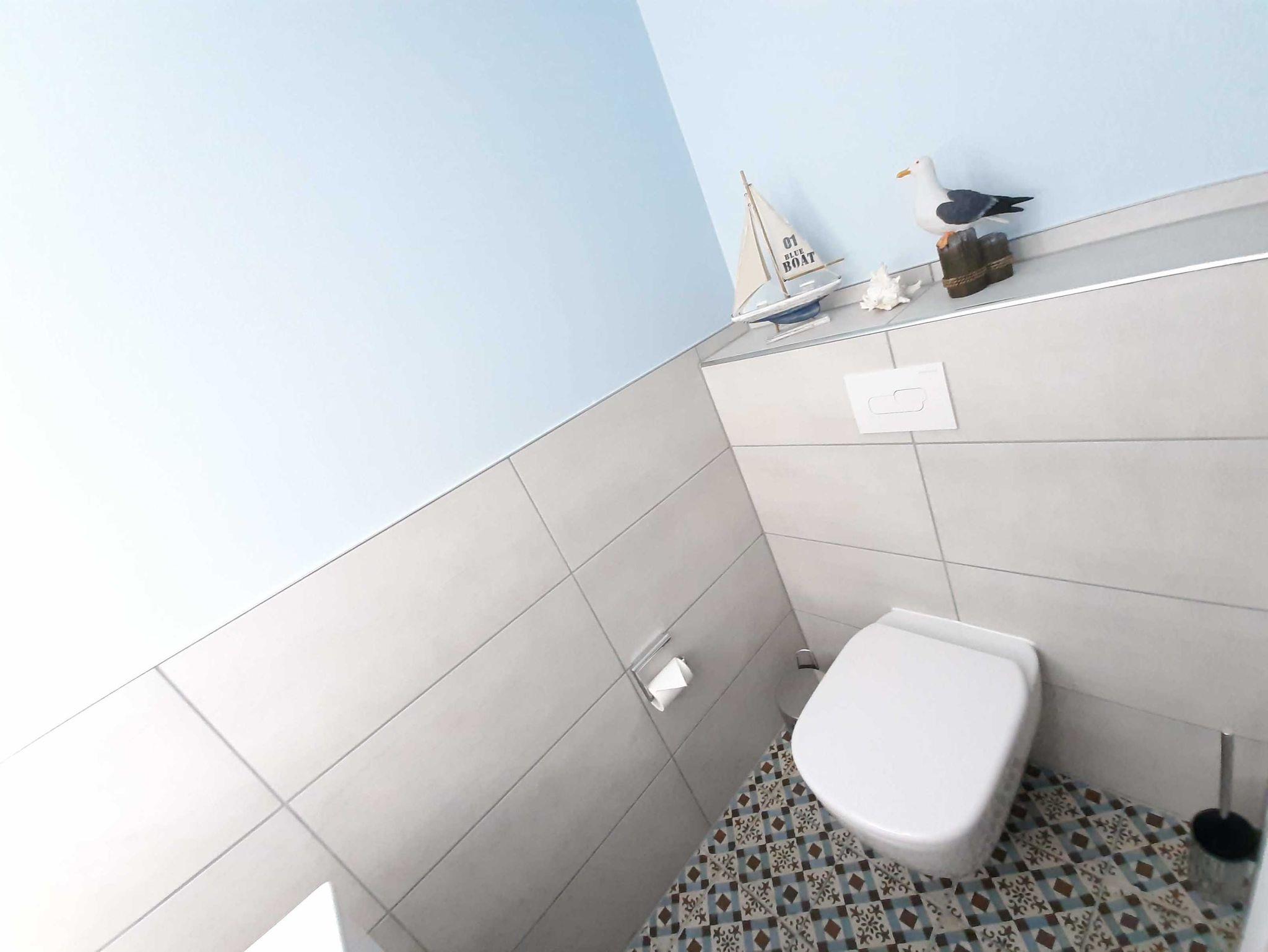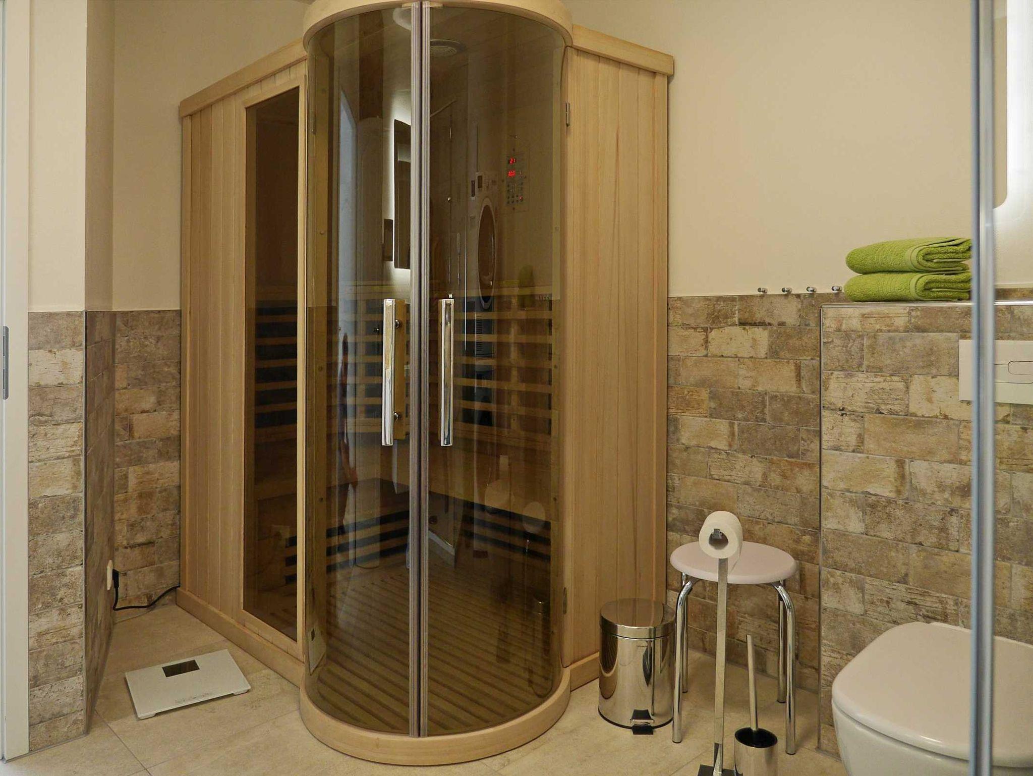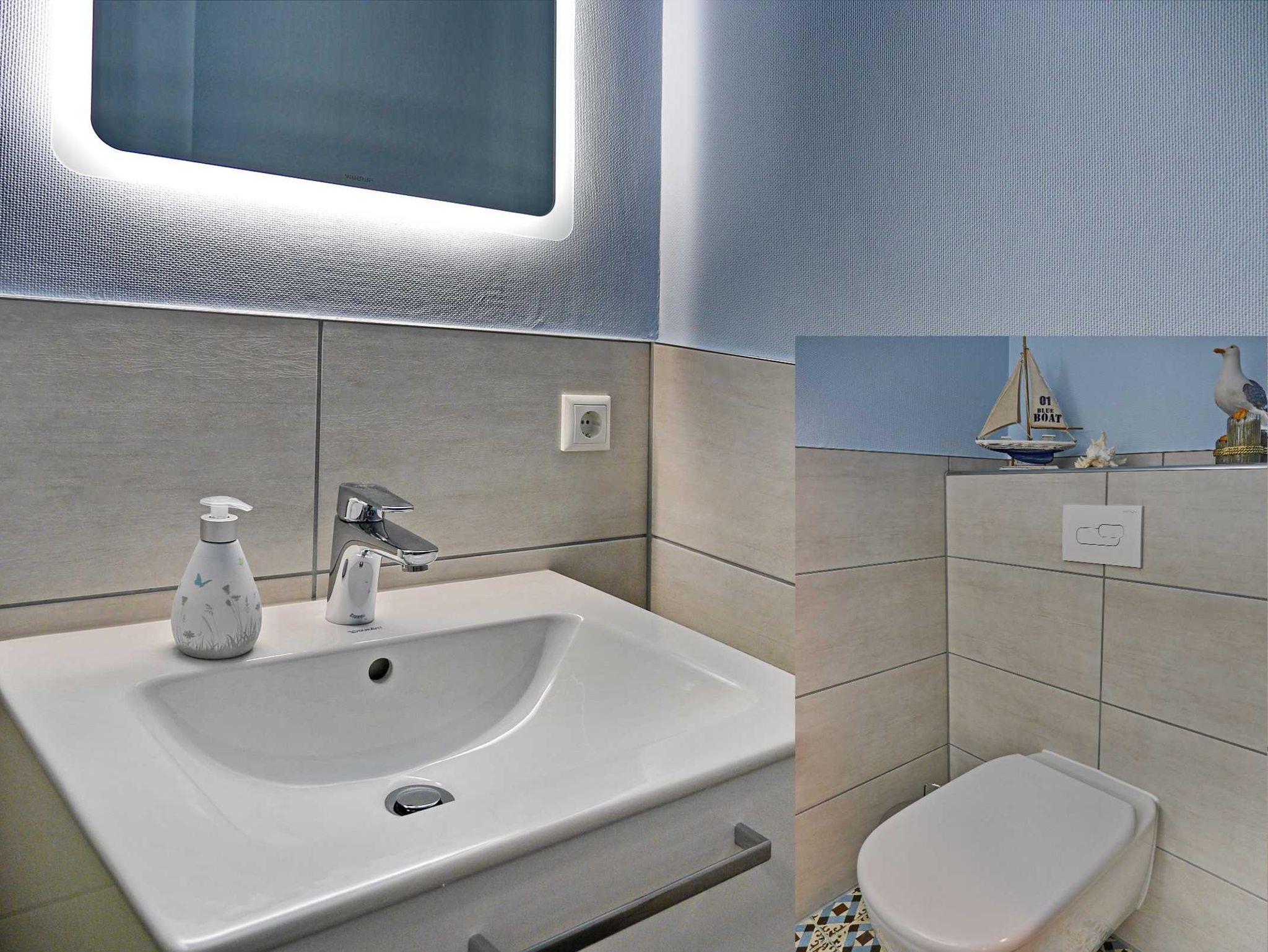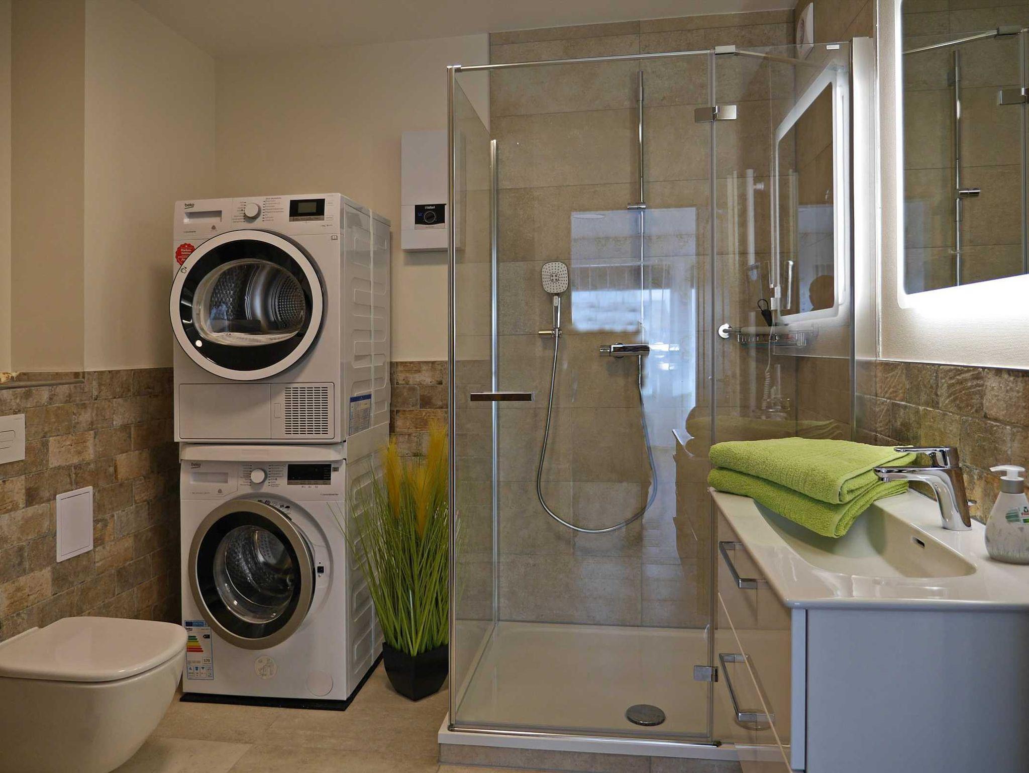 Ein freundliches, modernes, hellgefliestes Bad mit Dusche mit flachem Duscheinstig, WC, komfortablen Waschtisch, Handtuchwärmer und Haartrockner. Außerdem ist für die kalten Tage im Bad eine Infrarot-Sauna integriert. Waschmaschine und Trockner steht Ihnen in der Ferienwohnung zur Verfügung.
