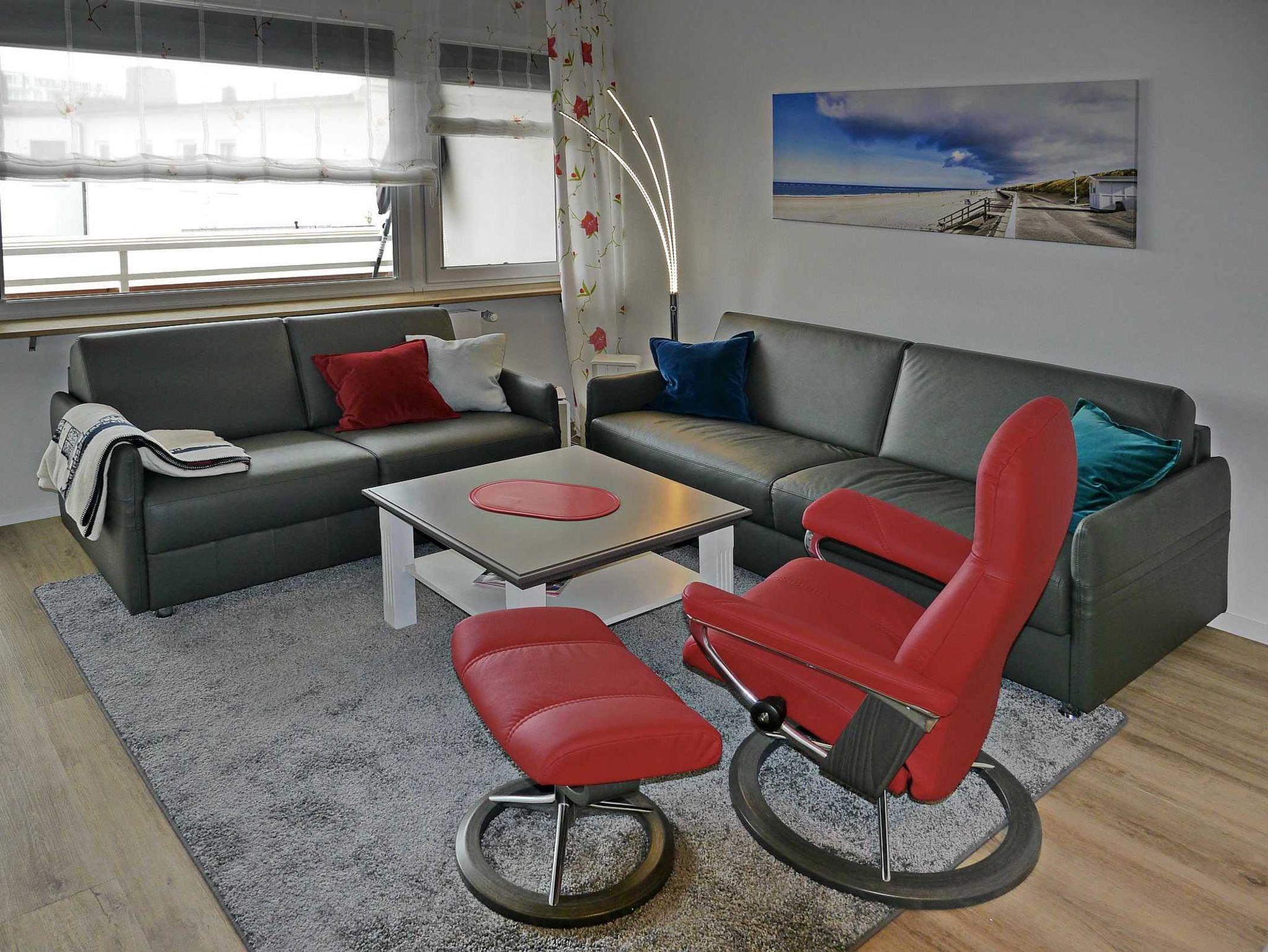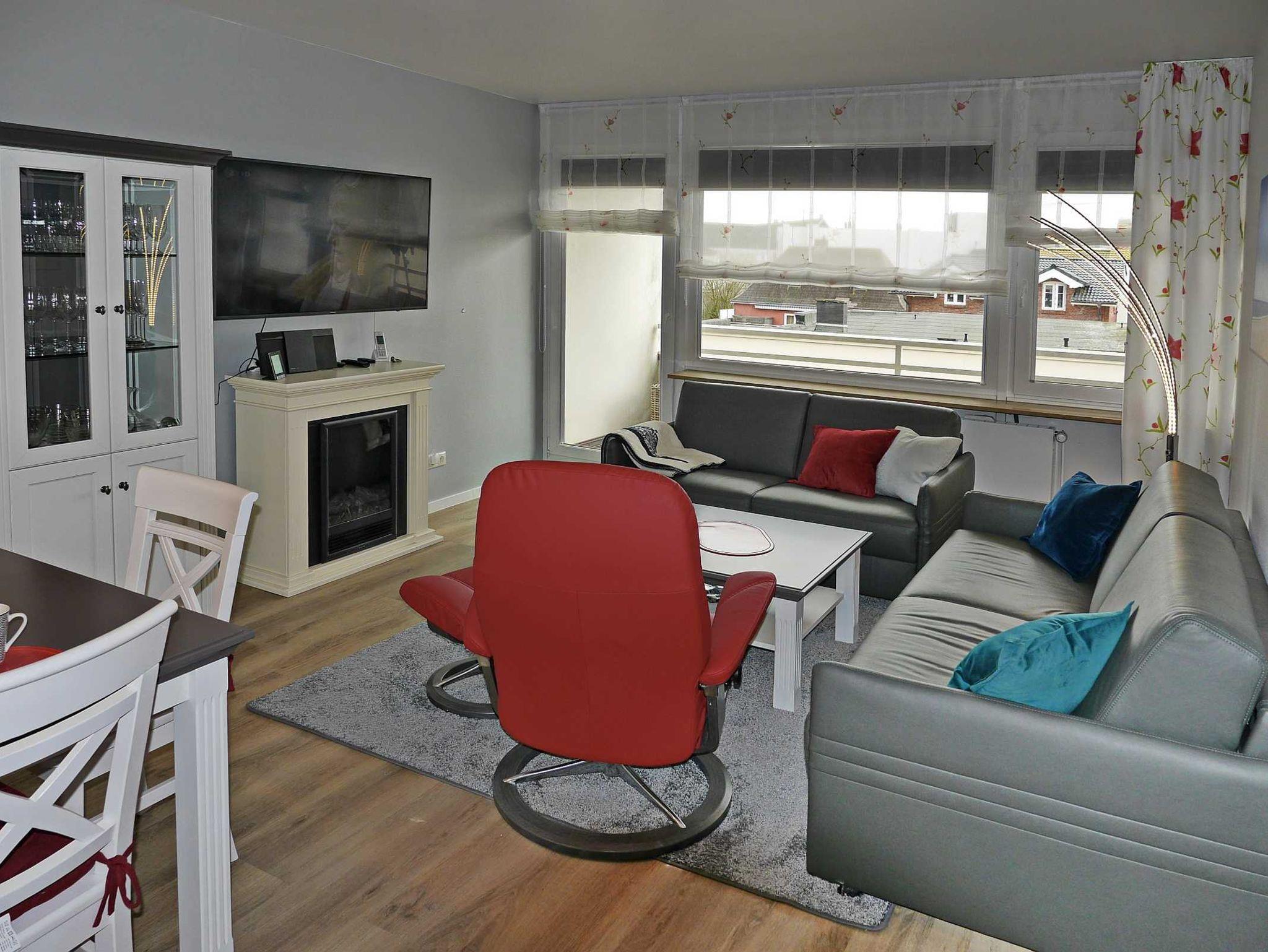 Die Wohnung ist kpl. renoviert. Sie wohnen in einem Wohnzimmer mit offener Küche. Das Wohnzimmer hat eine gemütliche Ledercouch, die als Schlafcouch (160 x 200 cm) für die 3. und 4. Person genutzt werden kann und mit der eingebauten Orthoflex-Unterfederung für ein wohliges Schlafgefühl sorgt. Zum bequemen fernsehen gibt es einen 55“ Monitor mit einem gemütlichen Stressless-Fernsehsessel. Sollte die etwas frischere Jahreszeit eingesetzt haben, können Sie bei einem warmen Tee vor schöner Elektro-Kaminflamme verweilen.