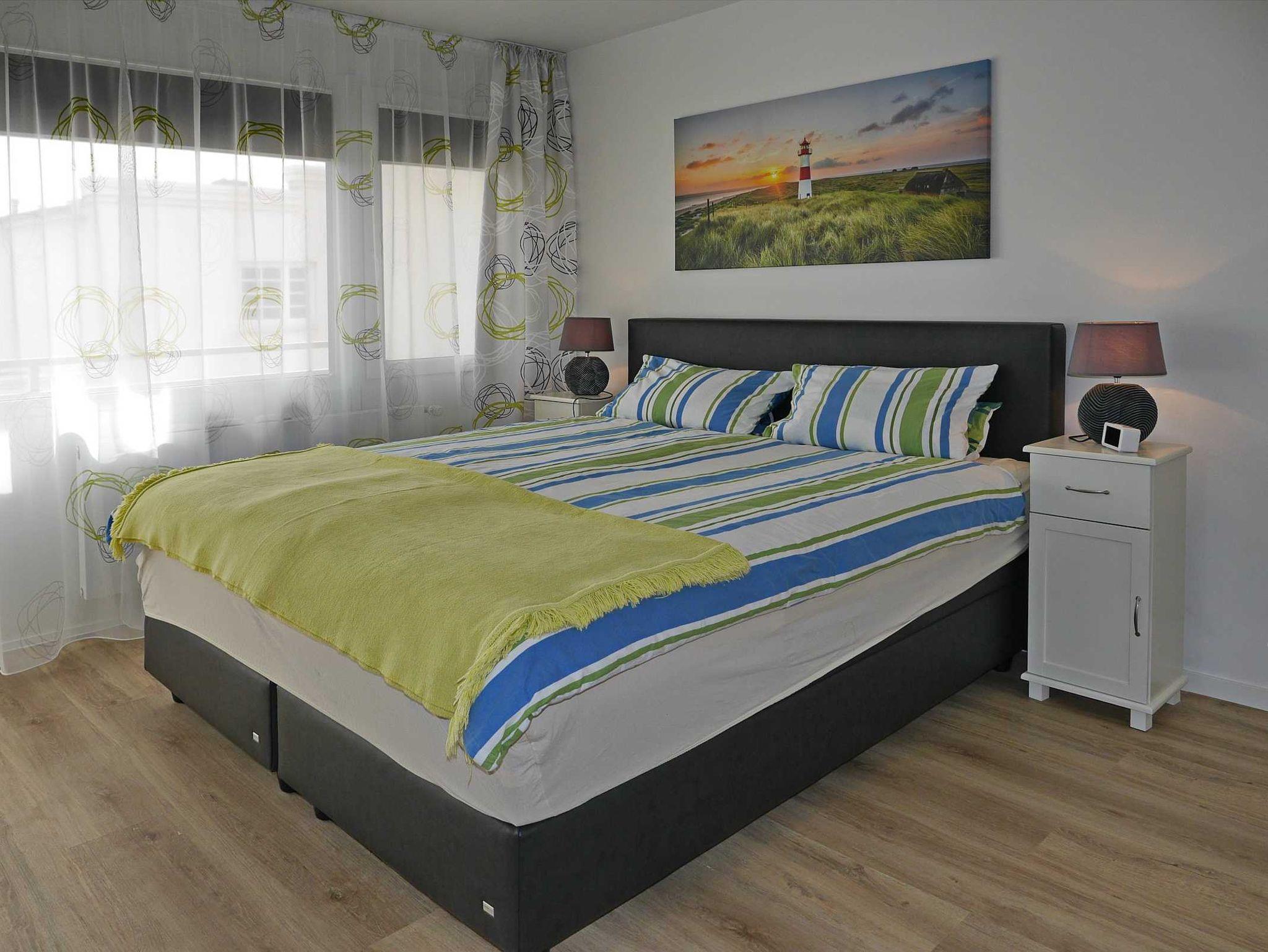 Das Schlafzimmer ist ausgestattet mit einem Doppelboxspringbett, Nachttischen, Leselampen und Kleiderschrank. Bettwäsche und Handtücher sind für Sie zu buchbar.