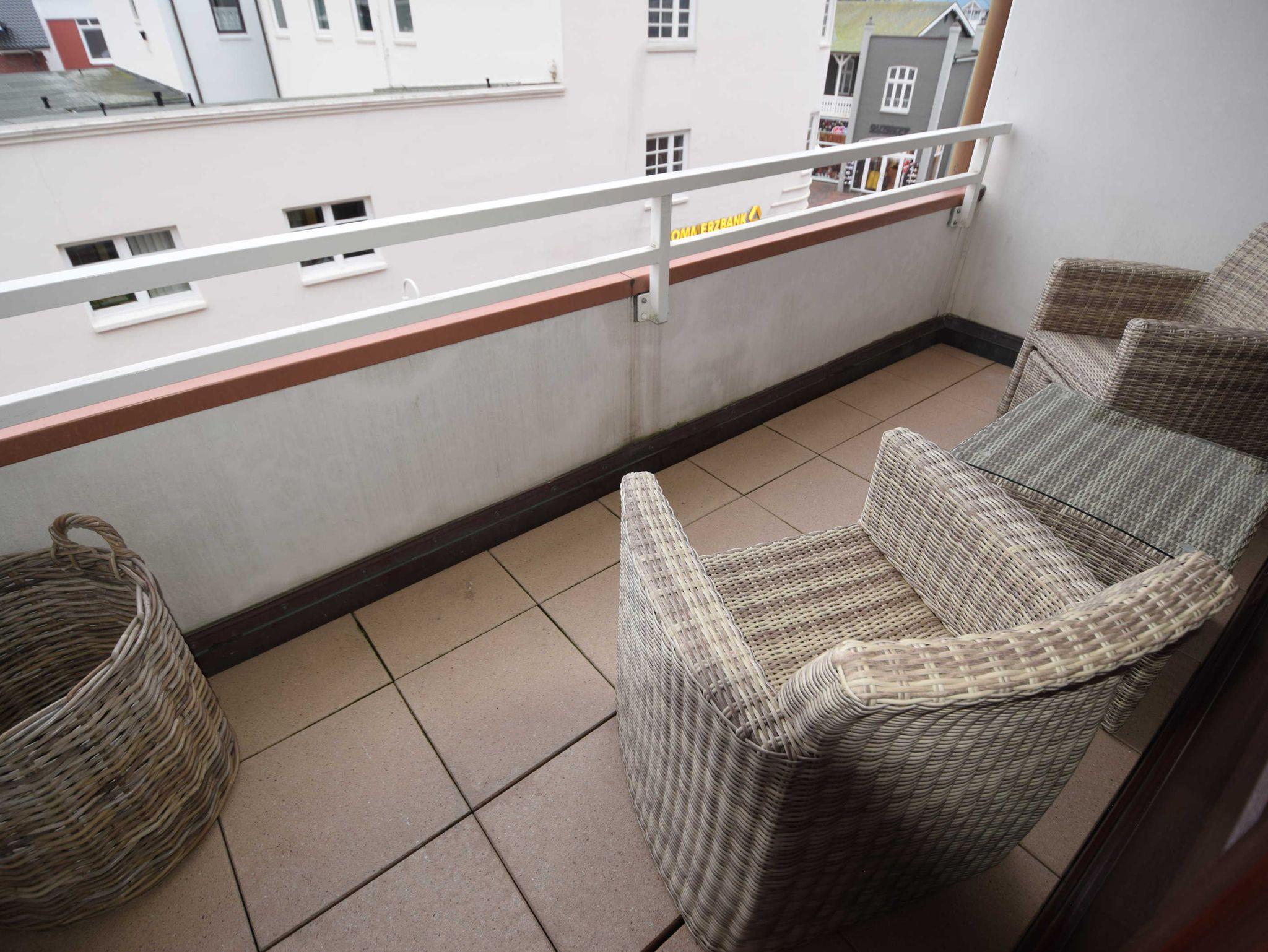 Die Wohnung hat 2 Balkone, die jeweils aus dem Wohn- und dem Schlafzimmer erreichbar sind, mit Ausrichtung Ost/Süd-Ost. Der Haupteingang ist zur Strandstraße gerichtet, der Nebeneingang von der Bomhoffstraße zu erreichen.