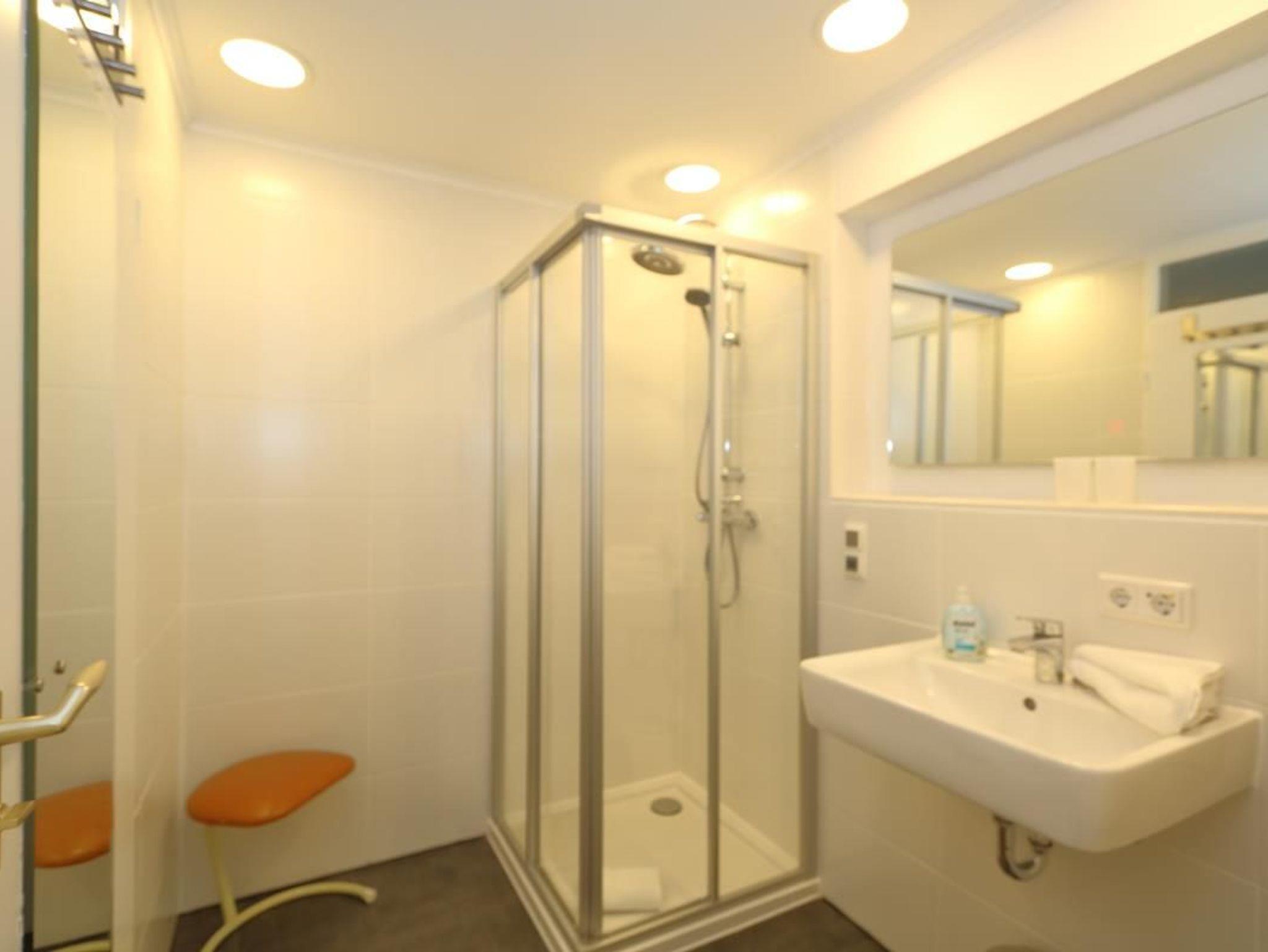 Das Badezimmer verfügt über eine moderne Duschkabine, eine Waage, ein Wandradio und mehrere Handtuchhaken. Durch den Flur mit großem Spiegel und Ablagemöglichkeit gelangen Sie nun in den großen Wohn-/Schlafbereich.
