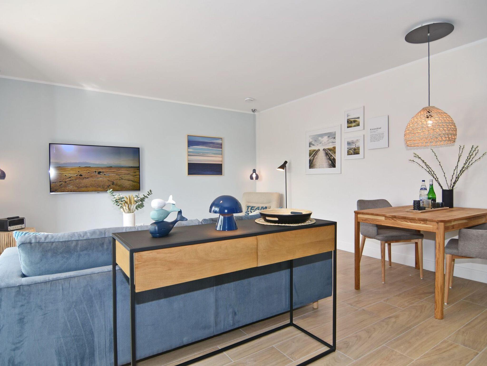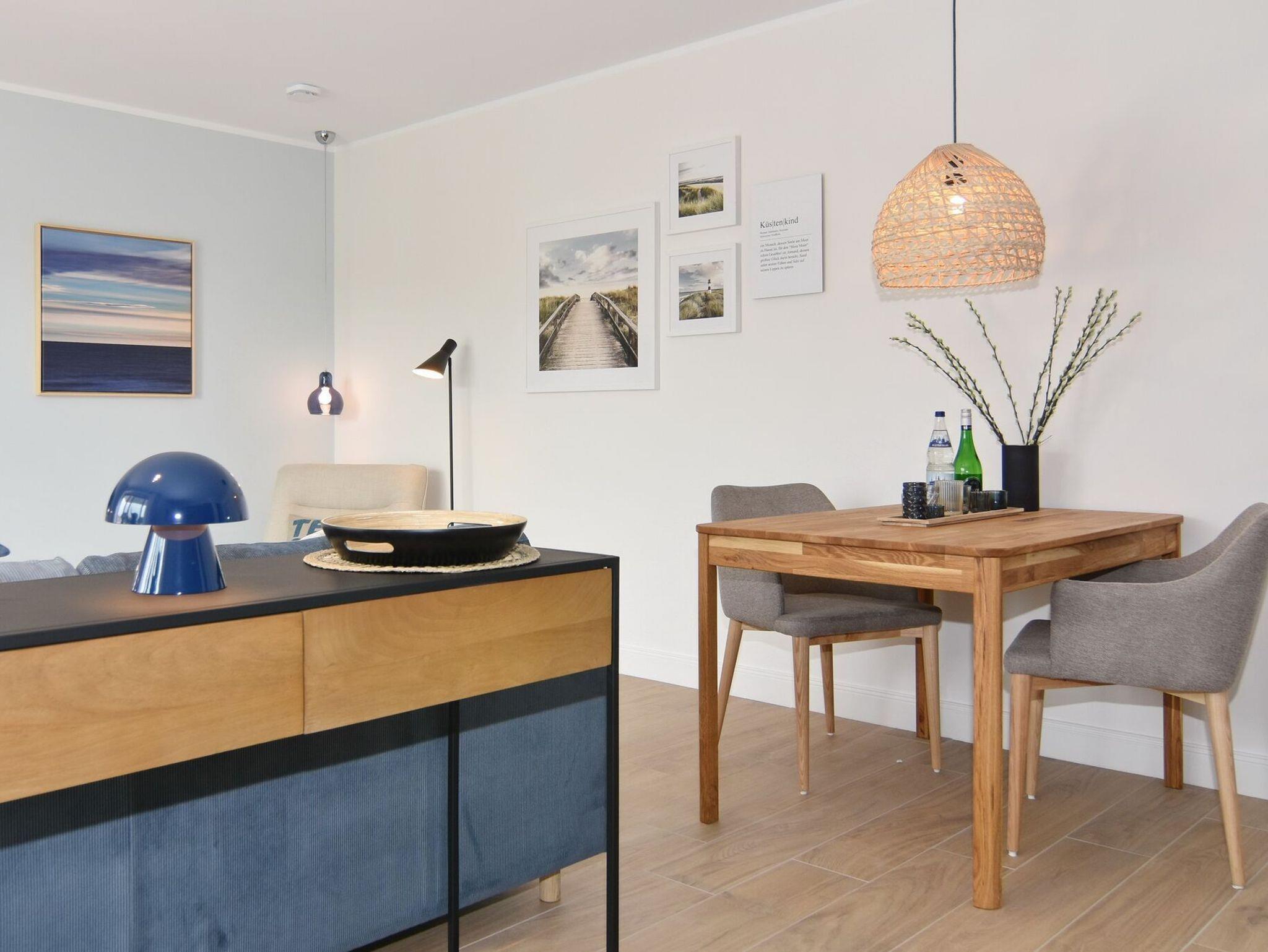Die exklusive 2-Zimmer-Wohnung im 1. OG misst ca. 54 qm ist für 2 Personen ausgestattet. Vom Flur mit Garderobe gelangen Sie in das Wohnzimmer mit offener Küche und möbliertem Südbalkon. Die hochwertige Küche bietet neben Induktionsherd auch Geschirrspüler, Kühlschrank mit Gefrierfach und Backofen mit integrierter Mikrowelle. Die Wohnung bietet Ihnen ein Schlafzimmer und ein Duschbad /WC mit Haar- und Handtuchtrockner. Das Schlafzimmer ist mit einem Boxspringbett (200x200) der Marke FBF, Smart-TV, Safe und Einbauschrank ausgestattet, 1 Kinderbett zubuchbar. Bis auf das Schlafzimmer sind die Räume mit großformatigen Fliesen versehen.
