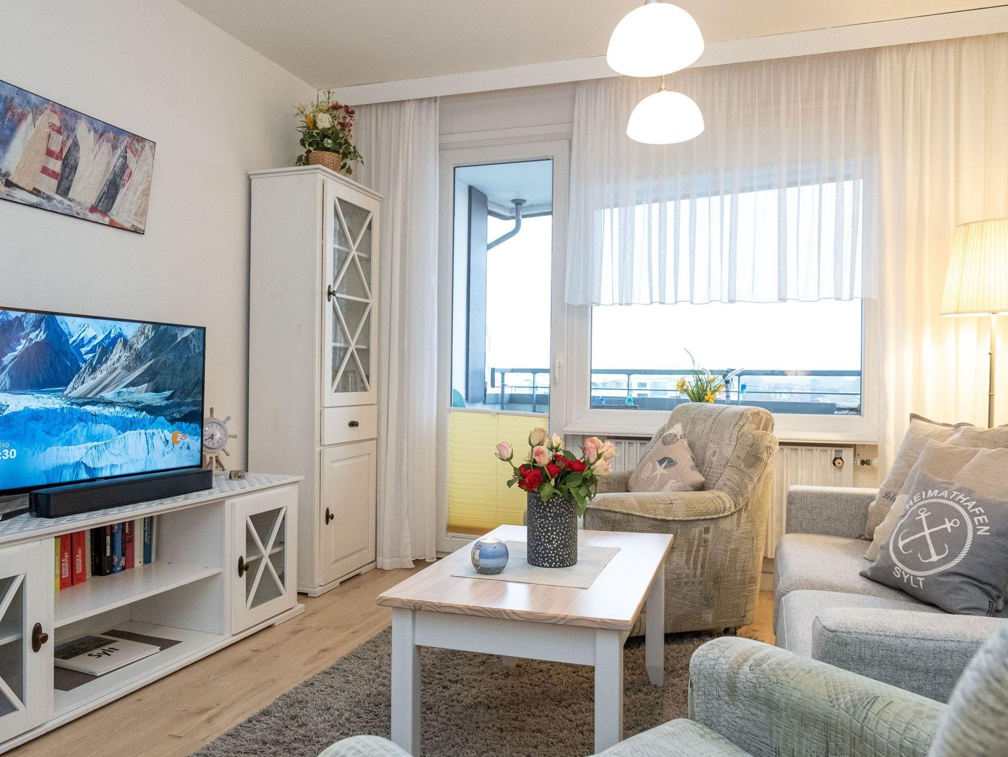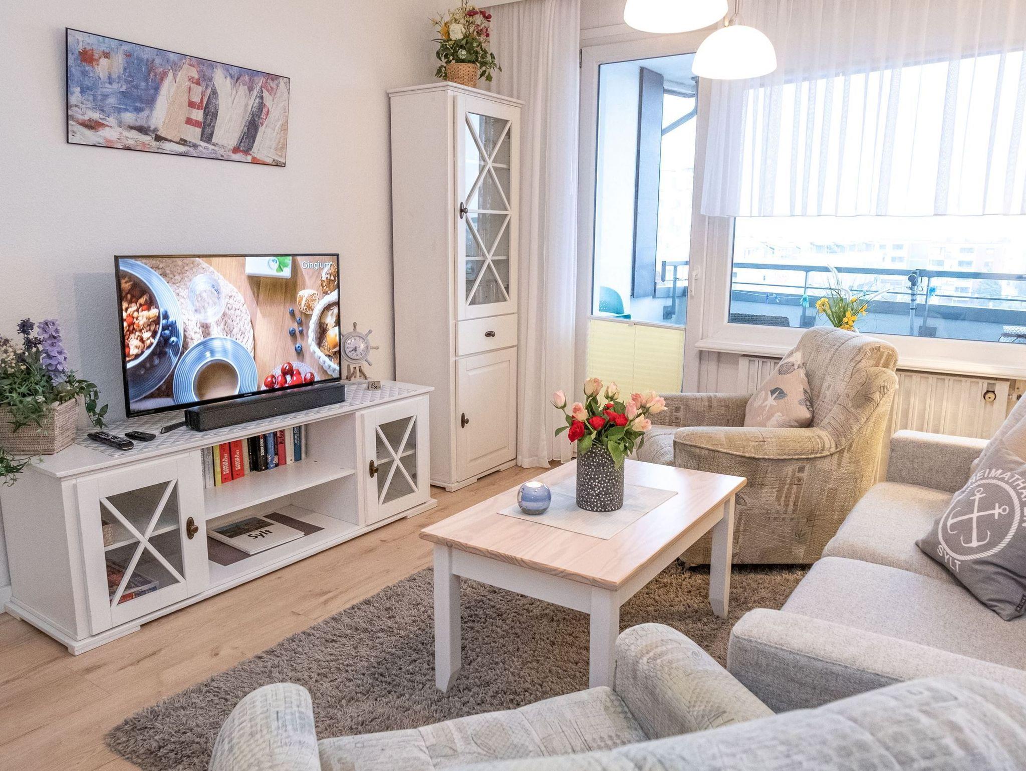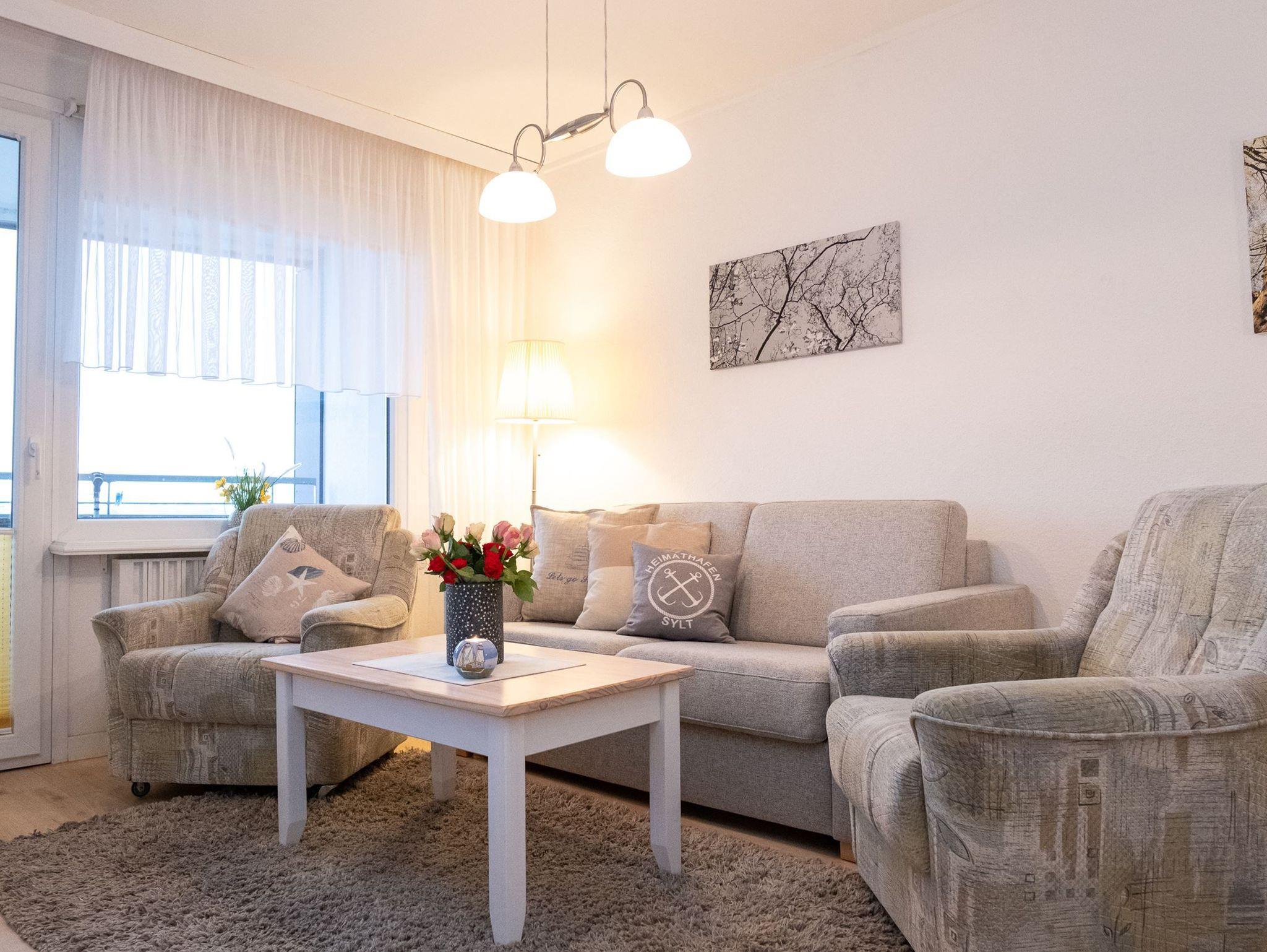 Das lichtdurchflutete Wohnzimmer verfügt über eine neue, moderne Bettcouch, die sich mit wenigen Handgriffen in ein komfortables Bett verwandeln lässt. Sie schlafen auf einer hochwertigen Kaltschaummatratze ( 1,40 x 2,00 m), die auf einem Lattenrost aufliegt. Weiterhin ist das Wohnzimmer mit 2 Sesseln und einem großen Flachbildfernseher ausgestattet. Sowie einem großzügigen Balkon nach Osten mit Balkonmöbel.