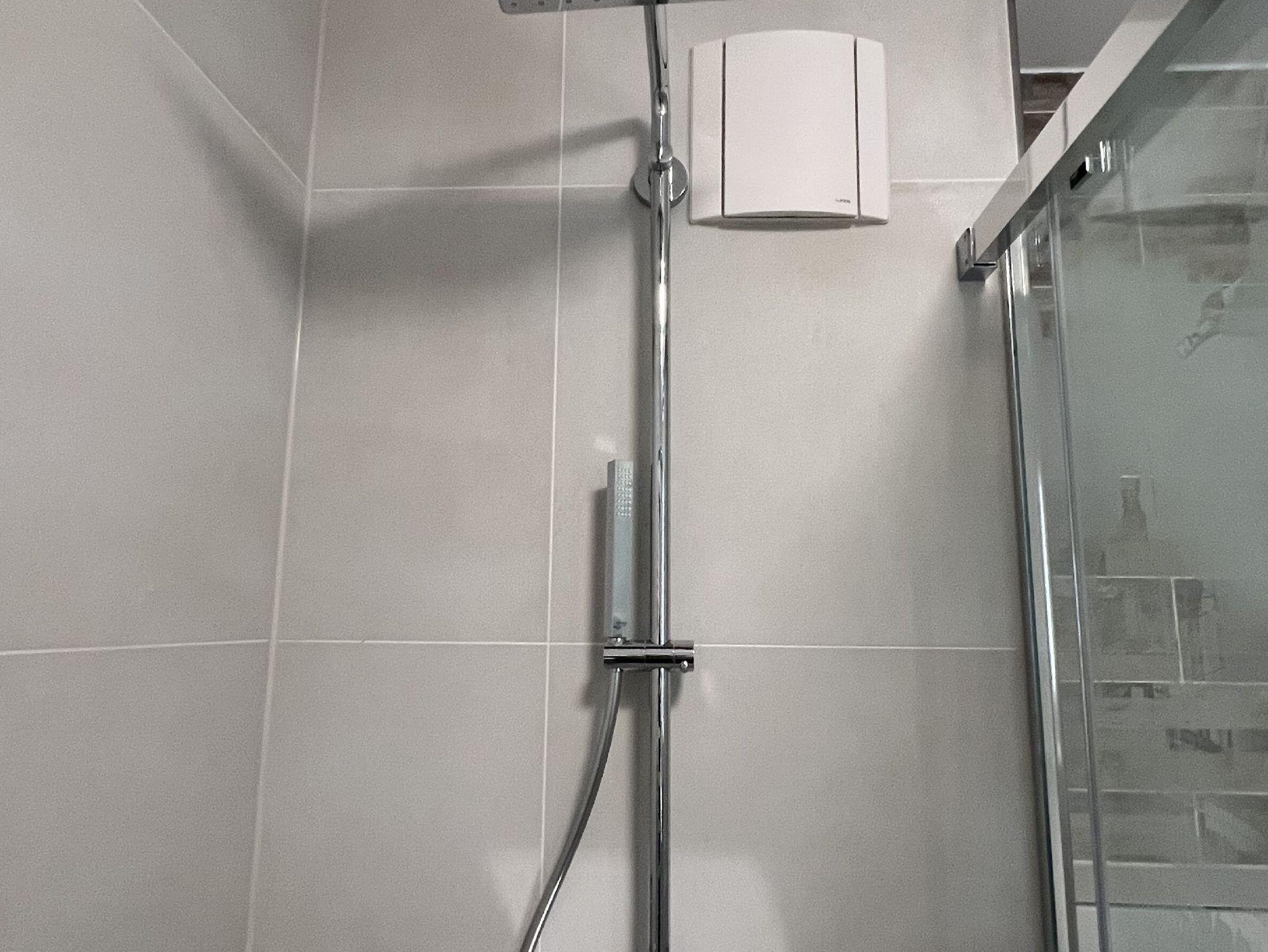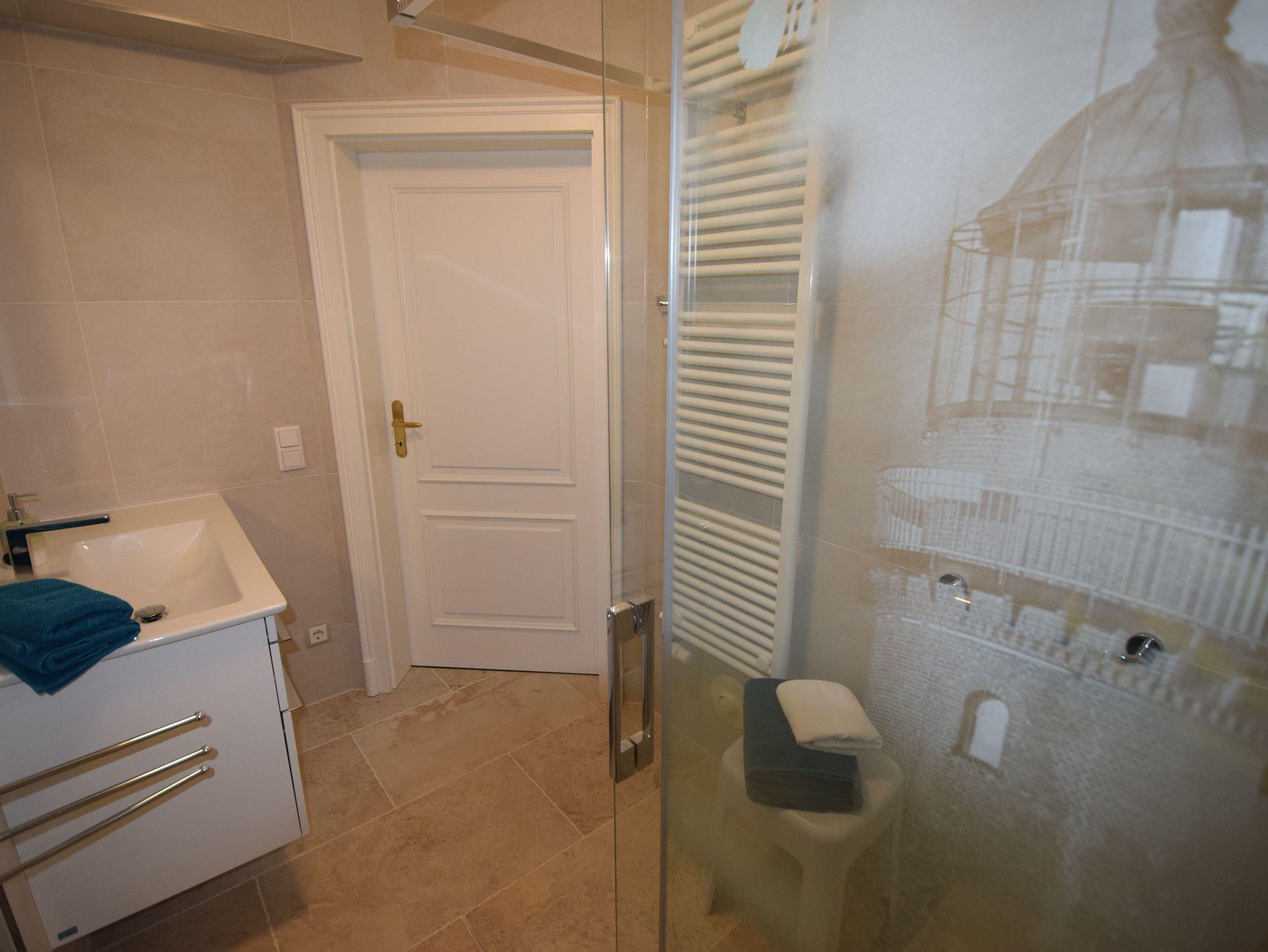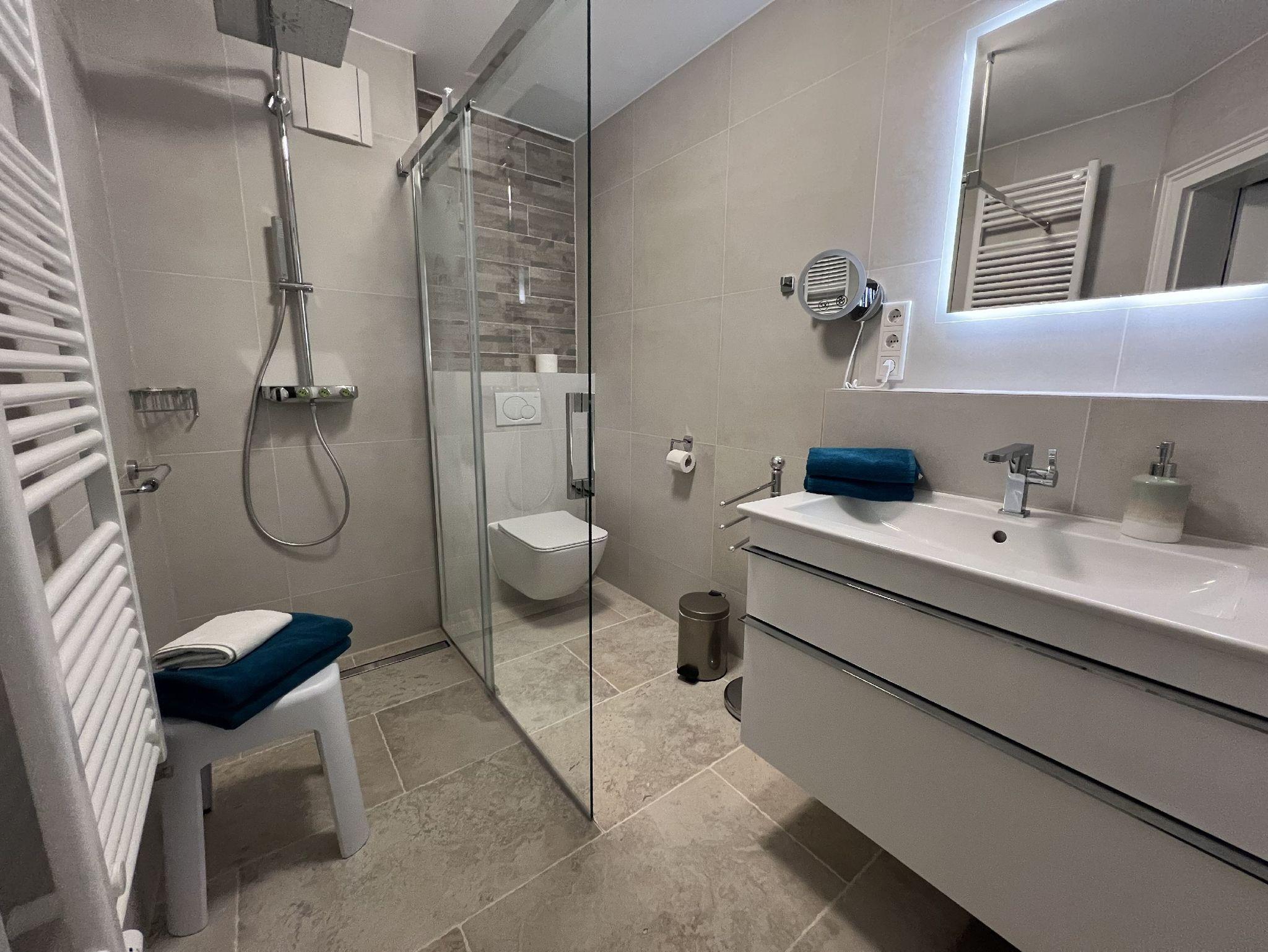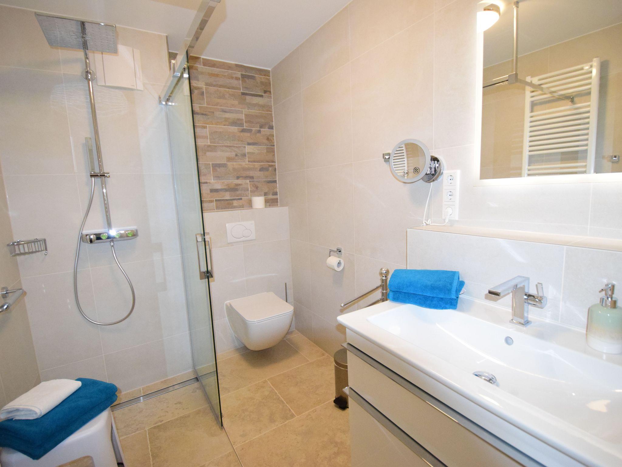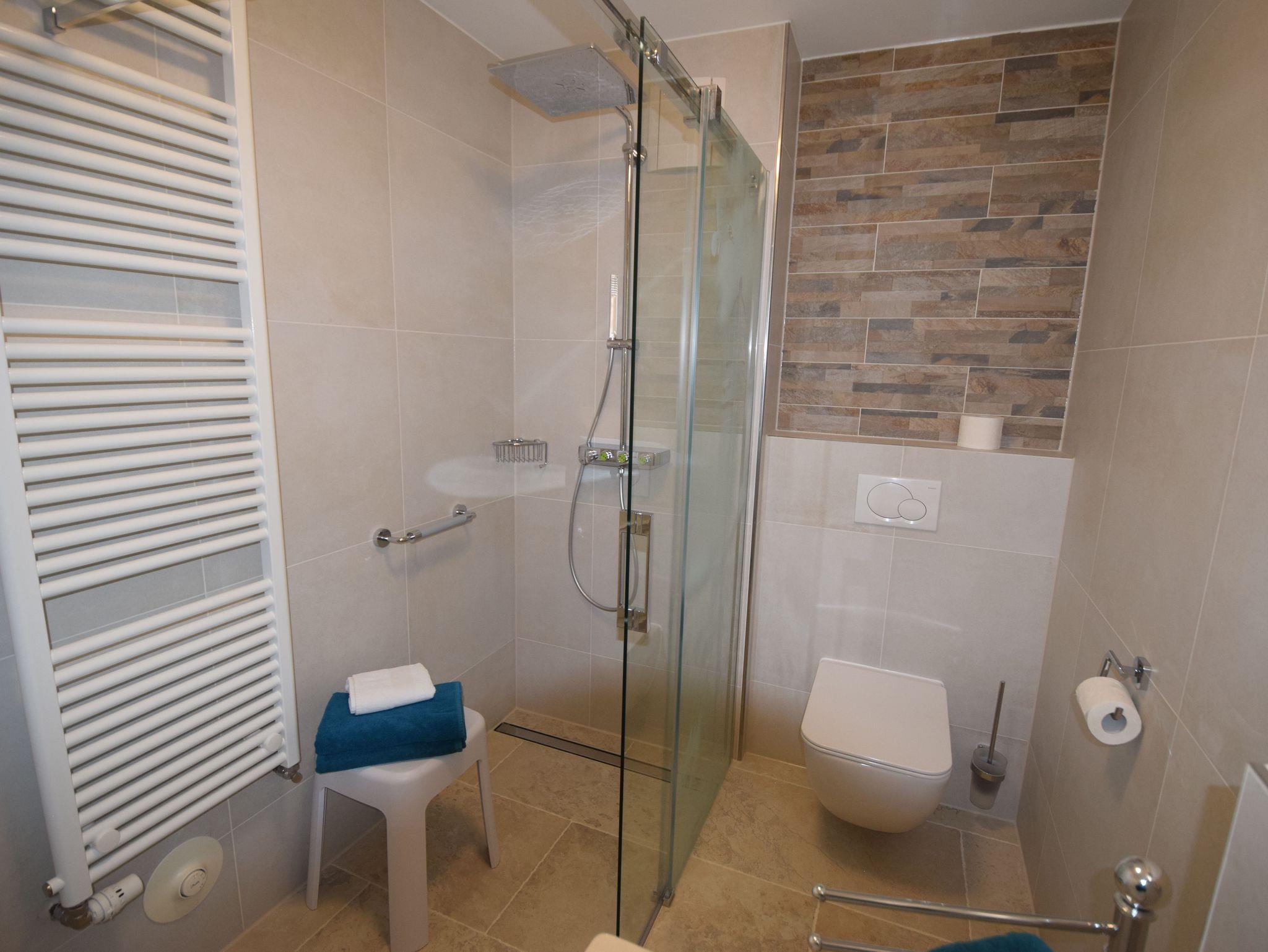 Badezimmer (Duschbad) mit Dusche, WC, Handtuchwärmer und Föhn.