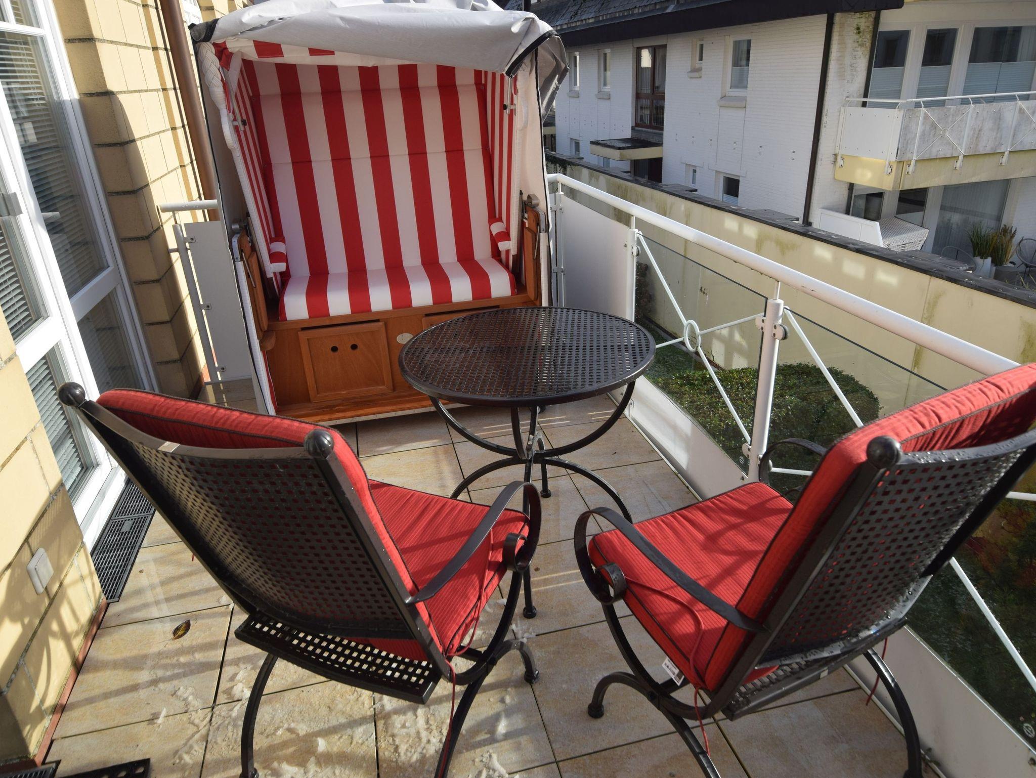 Der nach Süden ausgerichtete Balkon ist sowohl vom Schlaf- als auch vom Wohnzimmer erreichbar und lässt keine Wünsche offen. Sie finden dort einen Tisch mit 2 Stühlen sowie einen Strandkorb zur Alleinnutzung, um auch windgeschützt die Sonne genießen zu können.
