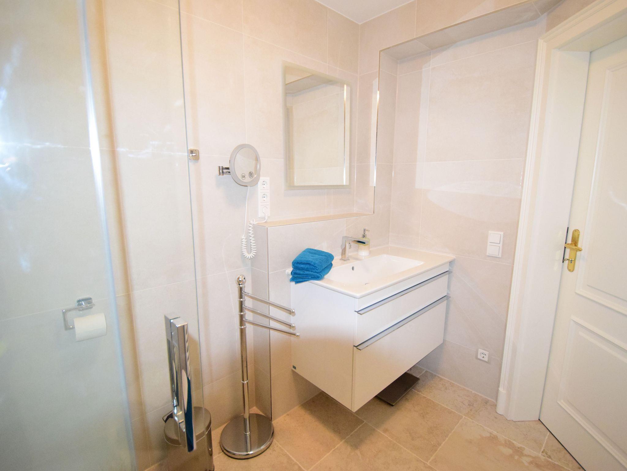 Damit Sie mit Ihrer Wäsche nicht in den Keller müssen, ist hier noch ein Waschtrockner für Sie untergebracht. Rechts daneben befindet sich das frisch renovierte Badezimmer. Das freundlich hell geflieste Bad hat einen ebenerdigen Duschbereich, ein WC sowie einen komfortablen Waschtisch. Ein Fön ist ebenso vorhanden wie der beleuchtete Kosmetikspiegel. Das helle Wohn-/Esszimmer hat eine offene Küche mit einem komfortablen Essplatz.