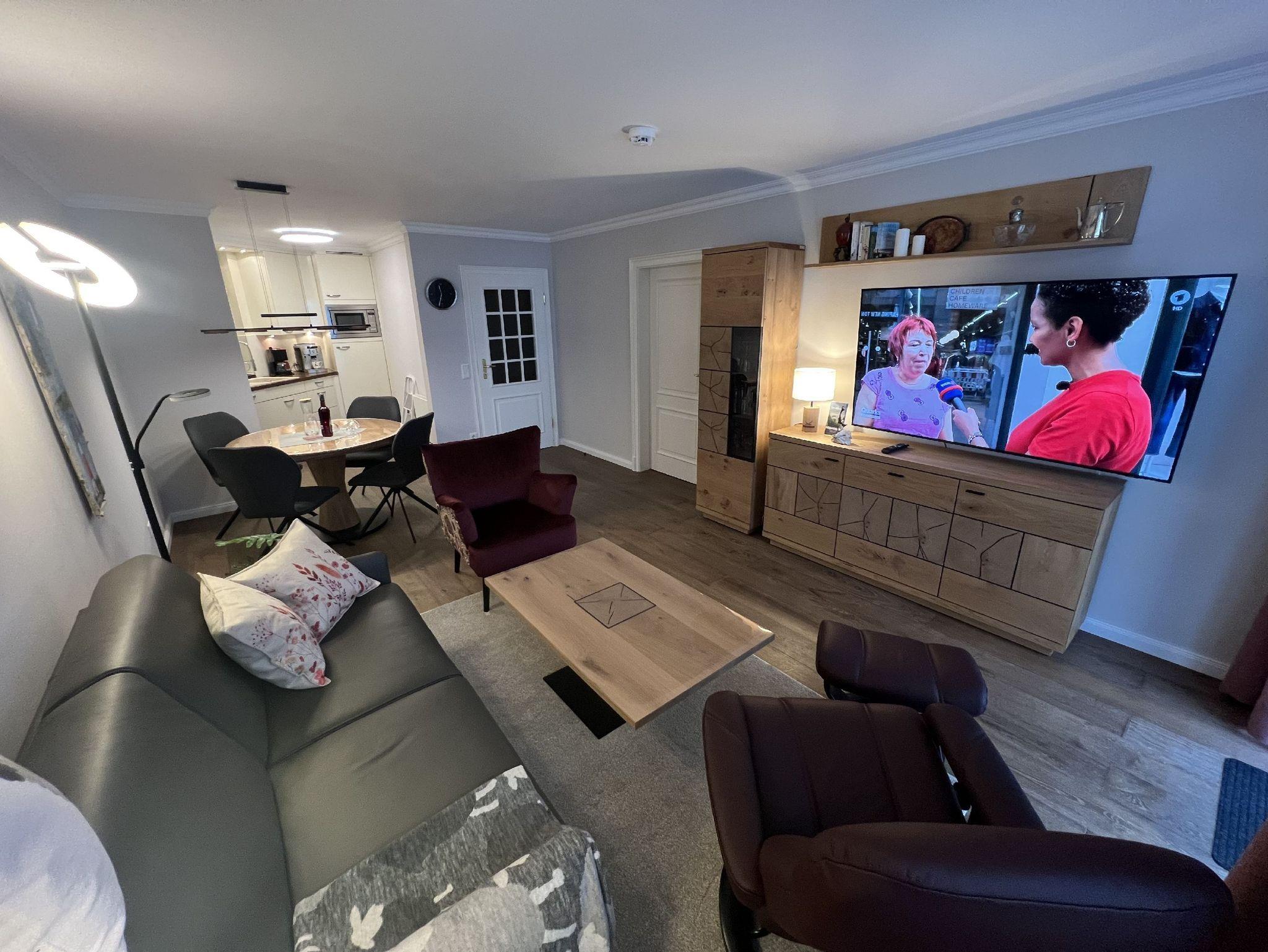 Mittendrin in der Innenstadt mit all ihren Annehmlichkeiten, aber dennoch schön ruhig. Und zum Strand sind es nur wenige Minuten. Die perfekte (Nichtraucher-) Ferienwohnung für den perfekten Urlaub. Wohnzimmer mit ausziehbarem (Schlaf-) Sofa (140x200cm), Stressless-Sessel, Esstisch mit 4 Stühlen und Smart-TV.