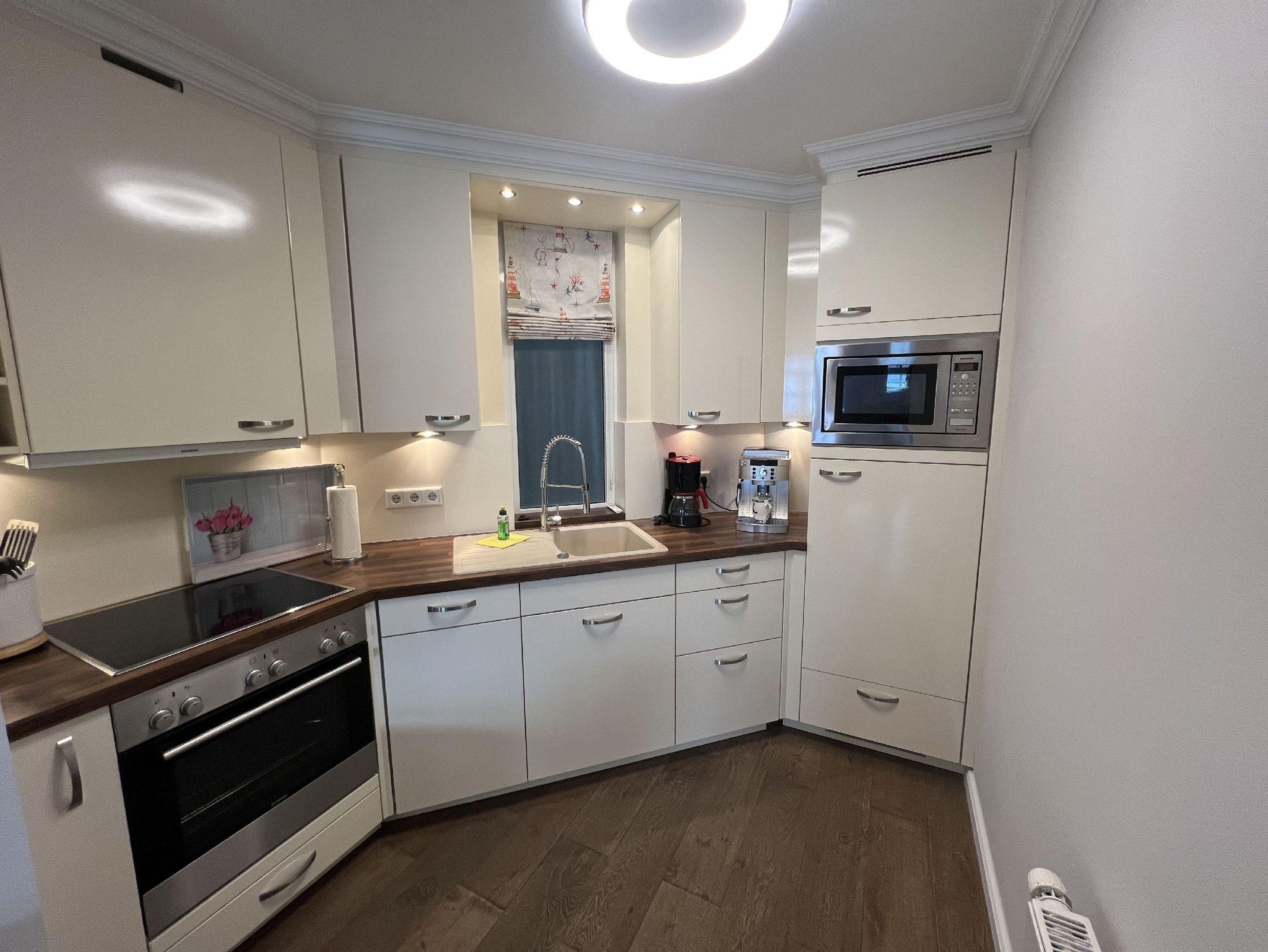 Die Küche ist kpl. ausgestattet, hat ein Ceran-Kochfeld, Backofen, Mikrowelle und alles, was man braucht, wenn man sich auch mal selbst verpflegen möchte. Dafür stehen auch die üblichen Dinge wie z. B. Filter-Kaffeemaschine sowie Kaffeevollautomat, Toaster, Wasserkocher und Geschirr bereit.