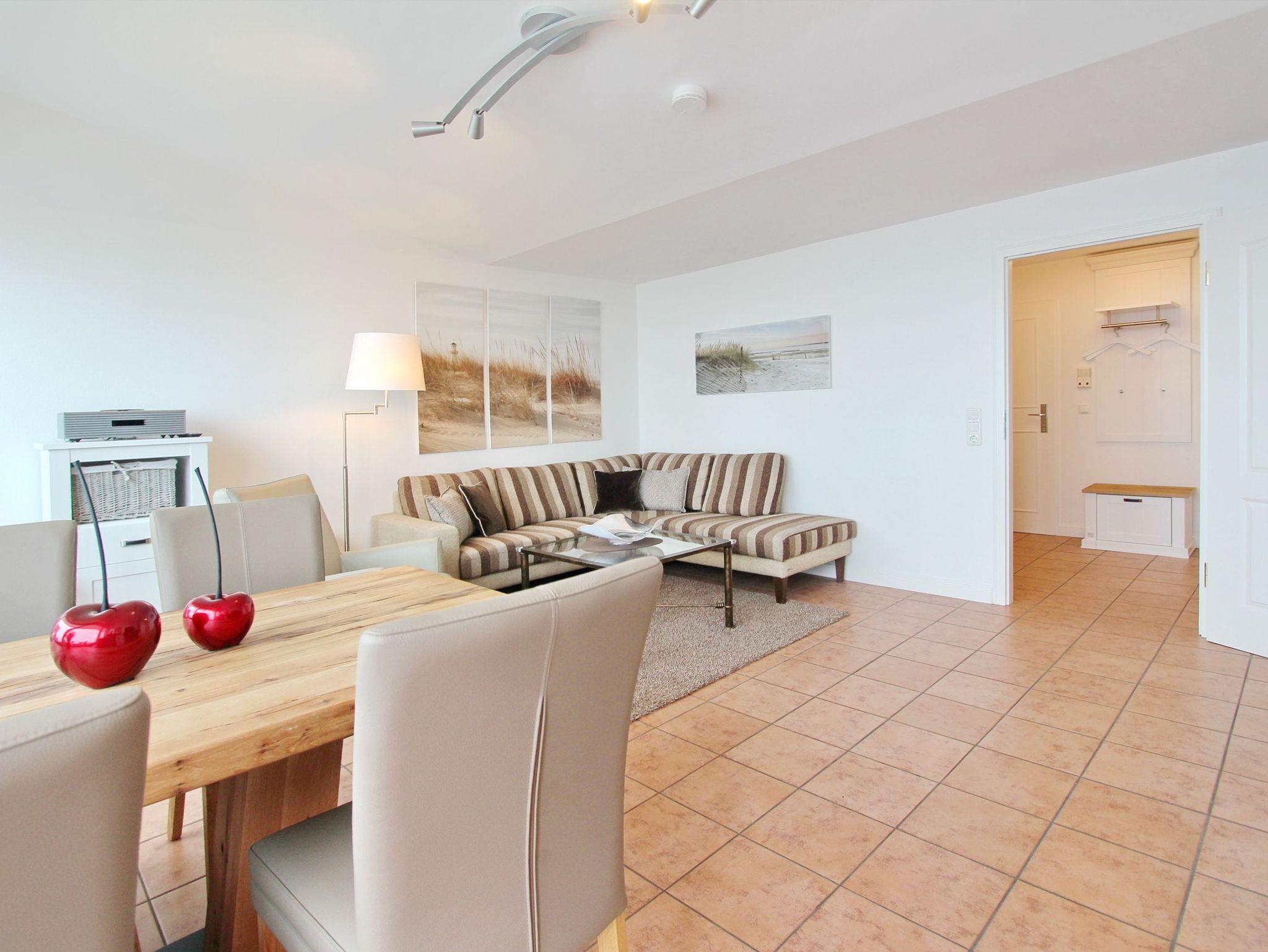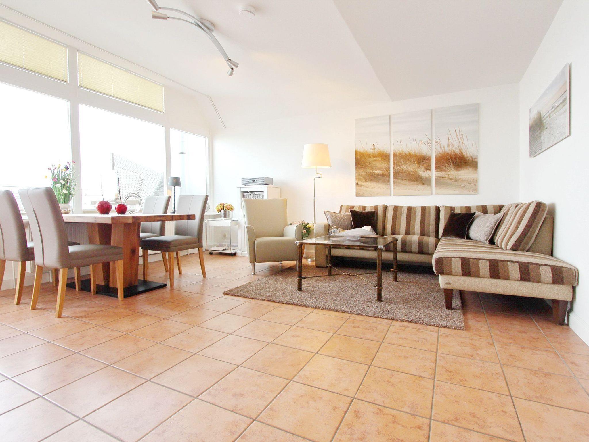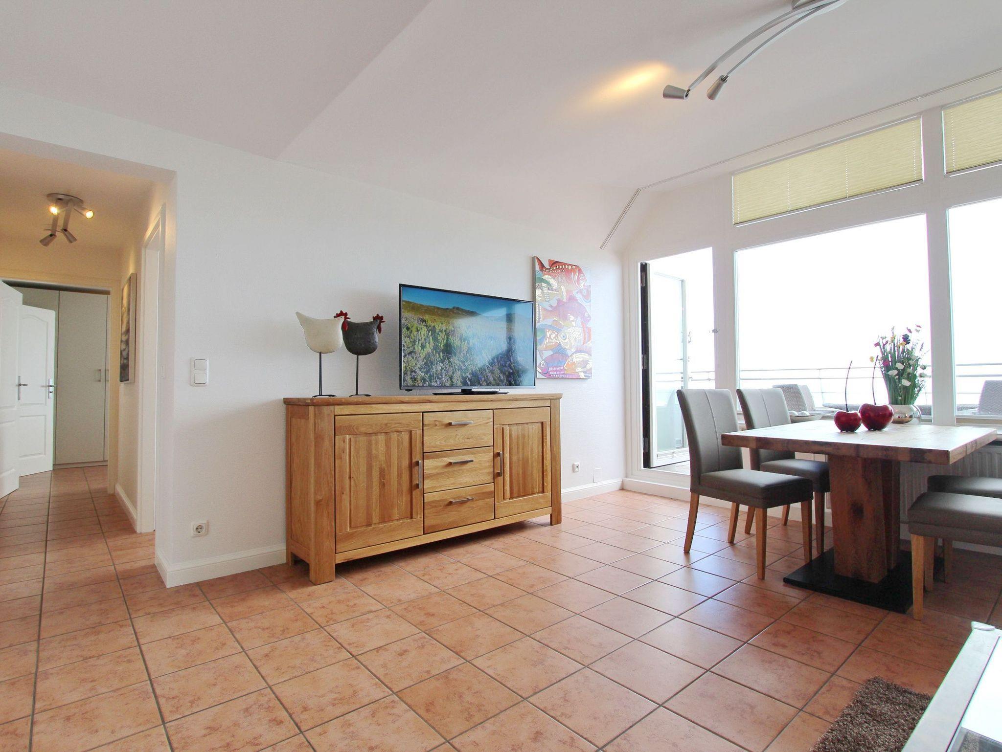 Hell und freundlich eingerichtete 3 Zimmer Wohnung in der 14. Etage im Haus Metropol mit herrlichem Blick über den Strand und die Nordsee von einer vorgelagerten Westdachterrasse aus mit Strandkorb und Balkonmöbeln. Im Wohnzimmer gibt es eine bequeme Sitzgruppe und einen Fernsehsessel, einen großen Esstisch mit 4 Stühlen und eine Schrankwand mit Flachbildfernseher. Es gibt zwei Schlafzimmer mit jeweils feststehendem Doppelbett, zusätzlichen Flachbildfernsehern, Radiowecker und Westdachterrasse. In der ganzen Wohnung wurden hochwertige Fliesen verlegt und die hohen Fenster lassen viel Licht und Sonne in diese Penthousewohnung. Es gibt zwei Badezimmer mit jeweils einer Dusche, in einem Bad steht Ihnen ein Wasch-Trockenautomat zur Verfügung. Die Separate Küche mit Ceranfeld, Geschirrspüler, Küchenmaschine, zusätzlicher Nespressomaschine und Mikrowelle. Zur technischen Ausstattung der Wohnung gehört eine Stereoanlage mit CD Player und ein Blu-Ray Player. Der Eigentümer verfügt über einen eigenen Internetanschluss (Zugangsdaten in der Wohnung) den Sie kostenfrei nutzen können. Diese Nichtraucherwohnung im Penthouse ist über eine Treppe erreichbar, da der Aufzug nur bis zu 13. Etage geht. Wohnungsgröße: ca. 90 m².