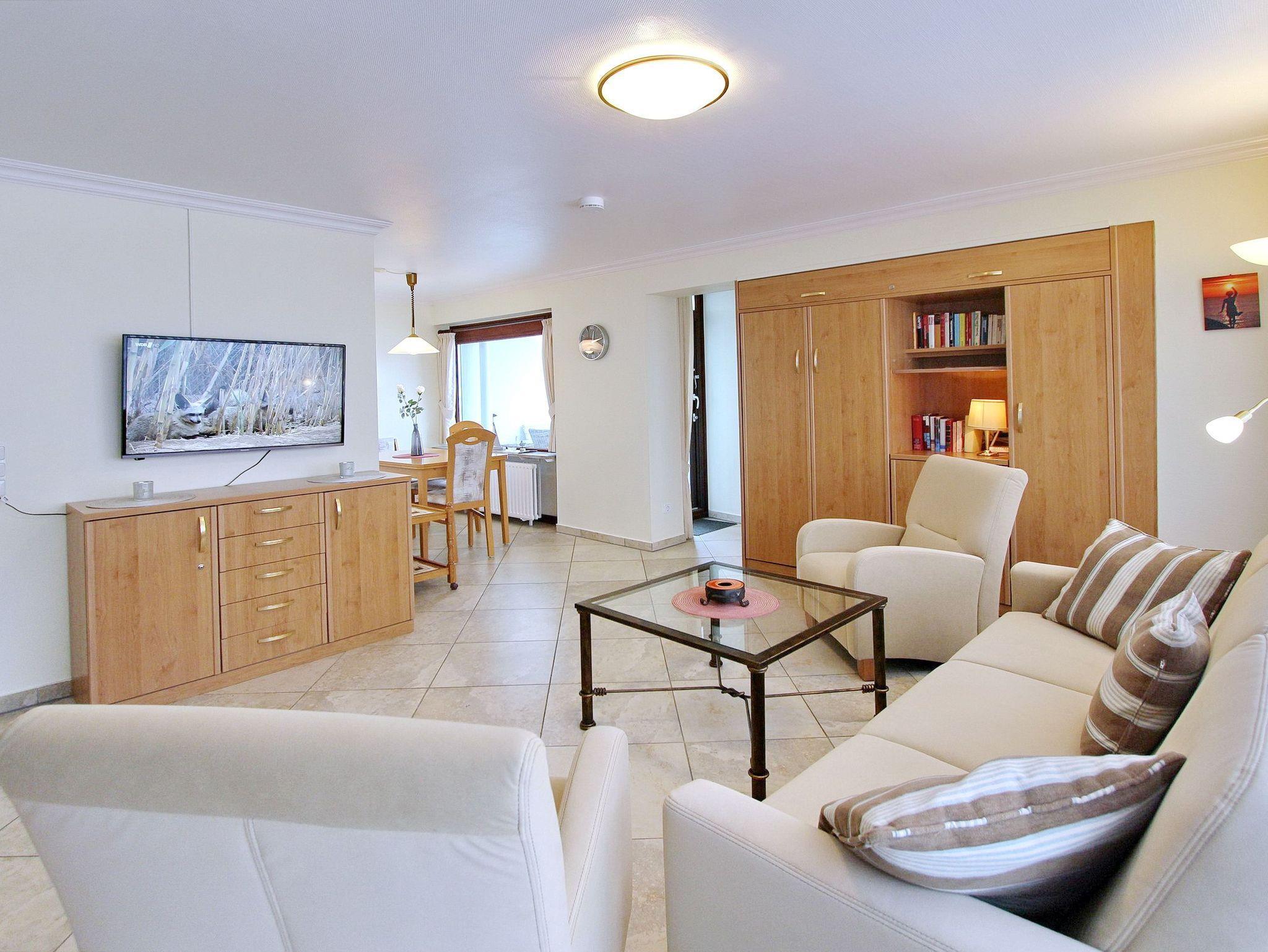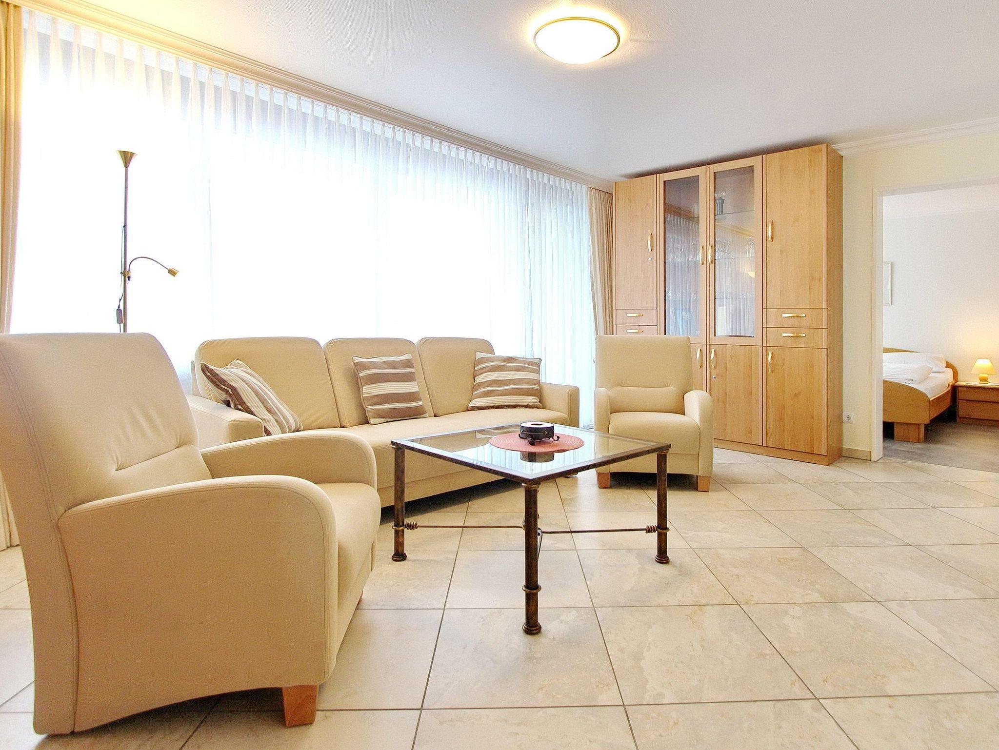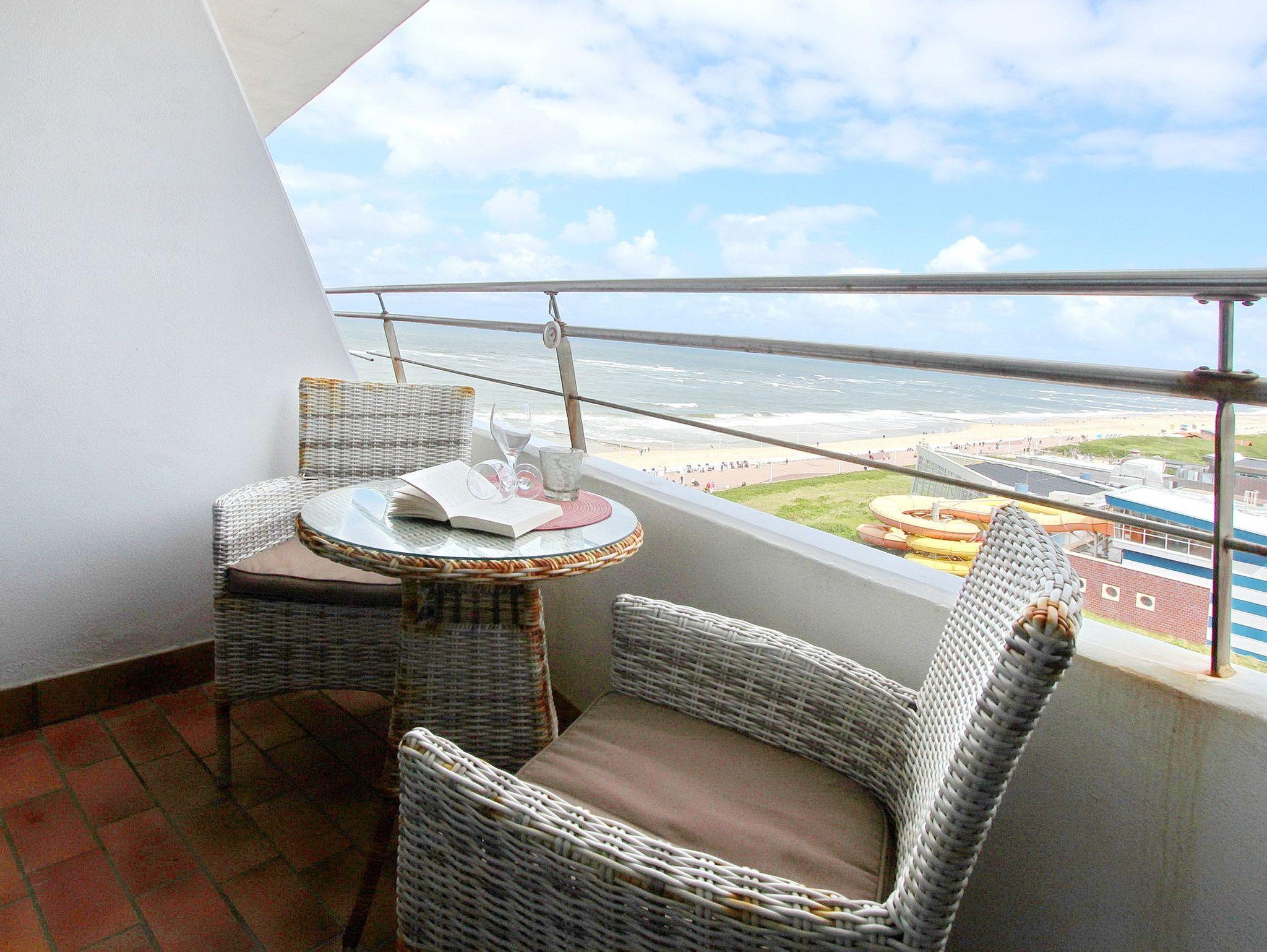 Hell und freundlich eingerichtete 2 Zimmer Wohnung in der 6. Etage im Haus Metropol mit Balkon zur Ost-und Nordseite mit Balkonmöbeln. Der Wohnraum verfügt über eine bequeme Couch, 2 Fernsehsessel, ein Einzelschrankbett und einen Essplatz mit Eckbank und 2 Stühlen. Vom Essbereich haben sie einen Zugang zum Nordbalkon mit seitlichem Blick auf die Nordsee. Der Wohn-Essbereich ist gefliest. Die separate Küche mit Cerankochfeld, zusätzlicher Tassimomaschine und Backofen mit Mikrowelle hat eine große Durchreiche zum Essplatz. Im Schlafzimmer mit Teppichboden steht ein Doppelbett und ein Kleiderschrank mit reichlich Stauraum. Dieses Zimmer hat ebenfalls einen eigenen Balkon zur Ostseite und einen Zugang zum Badezimmer. Das neu renovierte Badezimmer besticht durch seine Größe und die ebenerdige Dusche mit Sitzbank, die somit besonders für Gäste mit Handicap geeignet ist. Zur technischen Ausstattung gehört: ein Flachbildfernseher sowie ein freies WLAN Netzwerk (WEG Haus Metropol - Passwortfrei - ohne Gewähr) steht ihnen kostenfrei zur Verfügung. Diese Nichtraucherwohnung hat eine Größe von ca. 70 m².