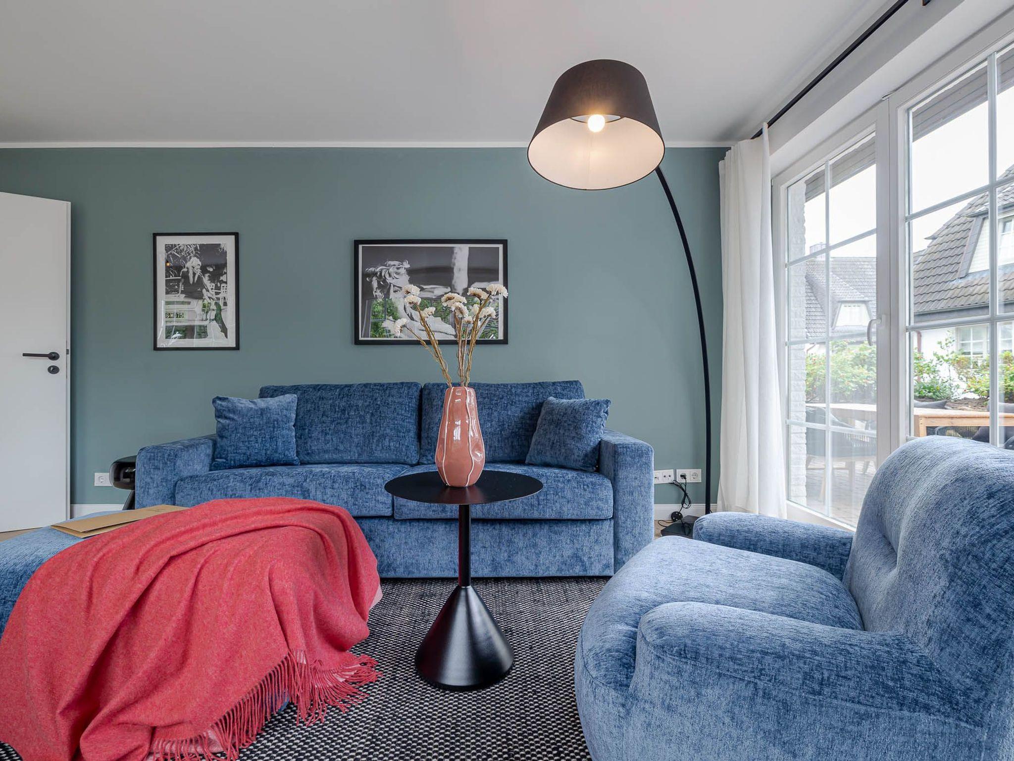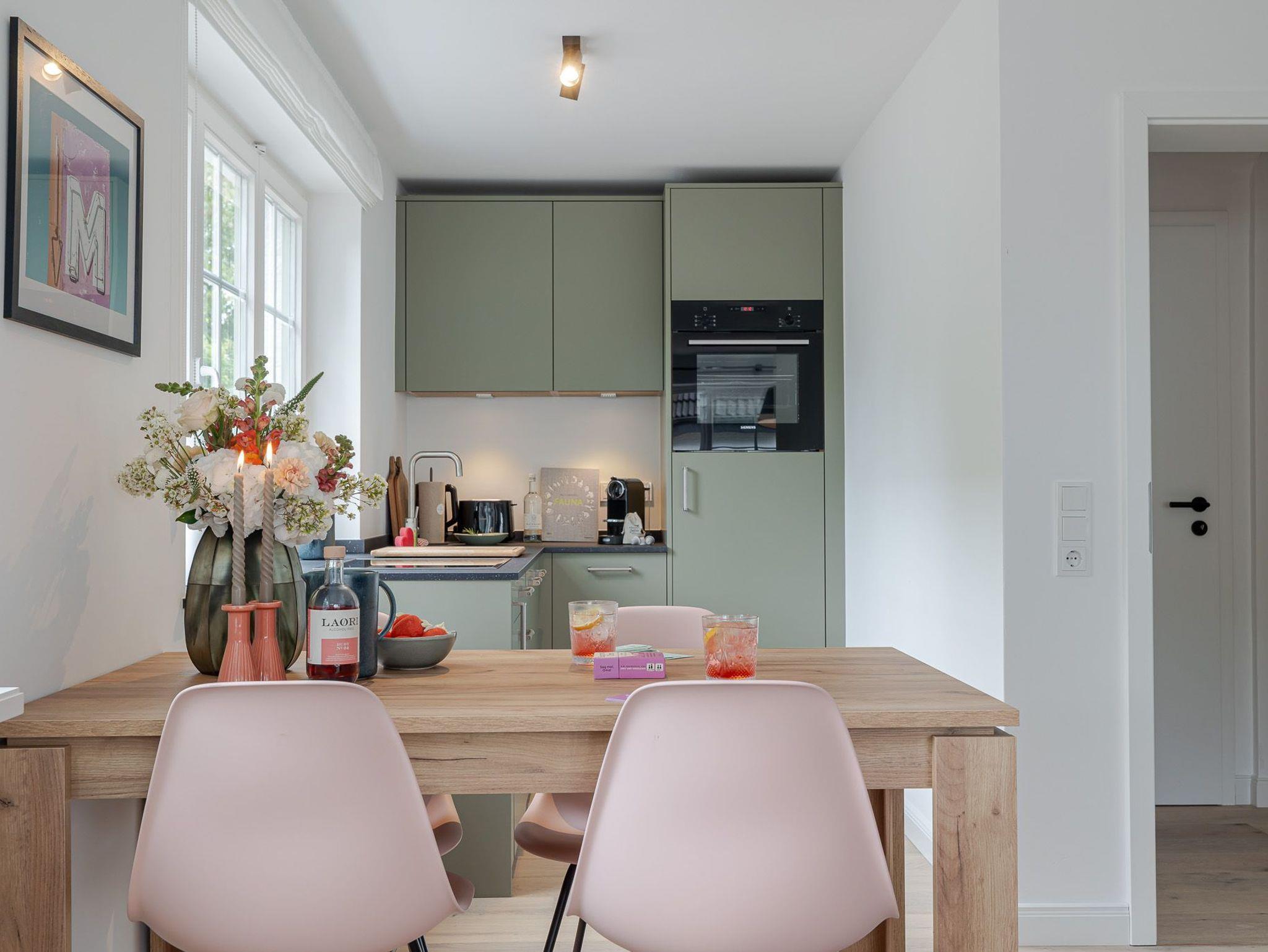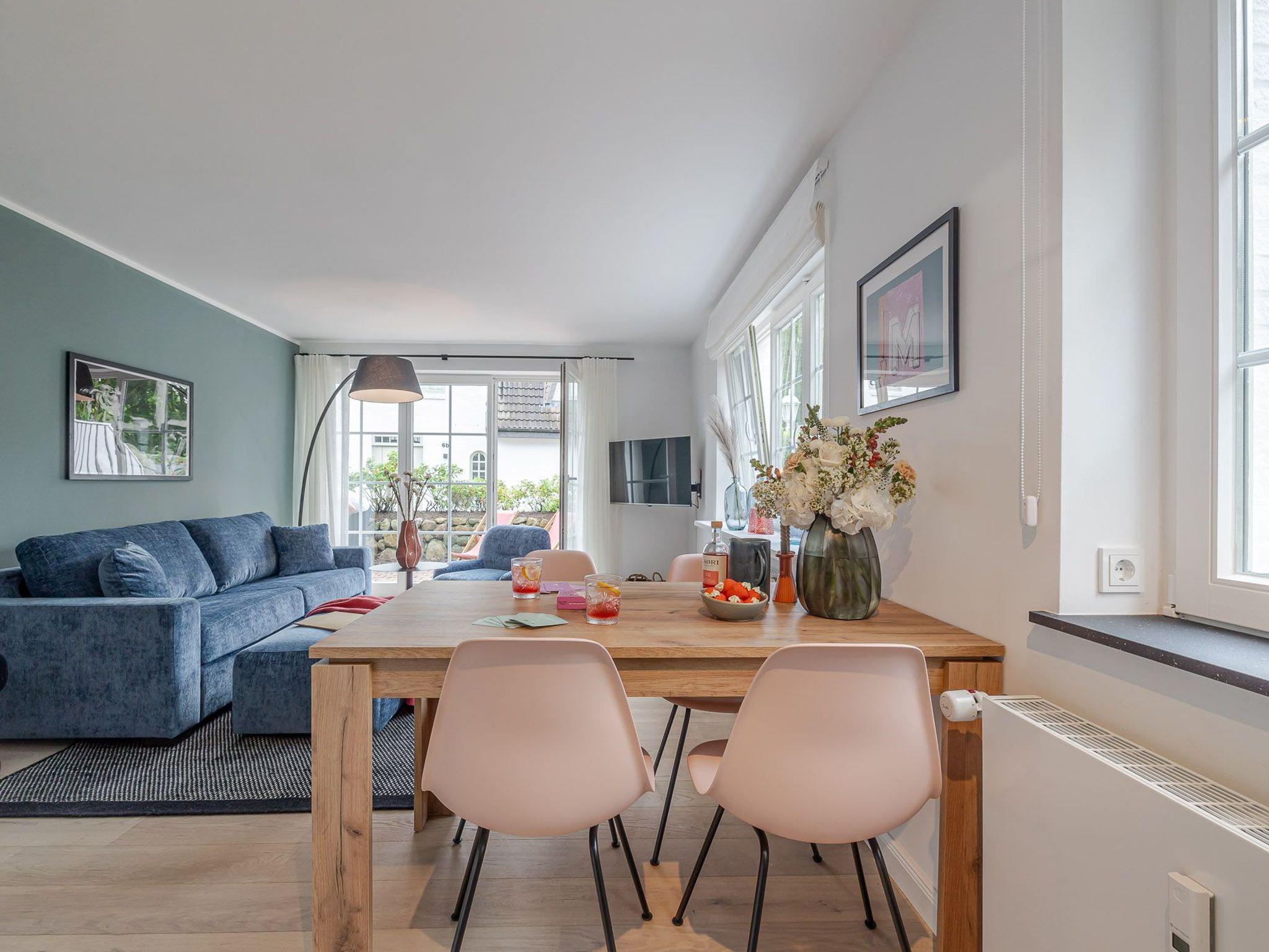 Danach geht es weiter in den charmanten Wohn- und Essbereich, wo ein vollwertiges Schlafsofa ebenfalls eine gute Nacht garantiert. Geschickt integrierte, maßangefertigte Schränke finden sie nicht nur hier, sondern auch in den anderen Räumen. Rechter Hand wartet eine hochwertige Küche, auf dessen Komfort, Ausstattung und Funktionalität Sie sich rund um die Uhr verlassen können. Eine kleine Drehung nach links und Sie blicken direkt auf die angrenzende Terrasse, im besten Fall natürlich bei herrlichstem Strandwetter.