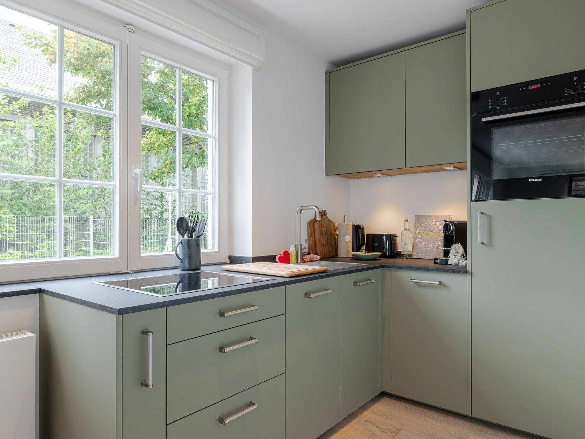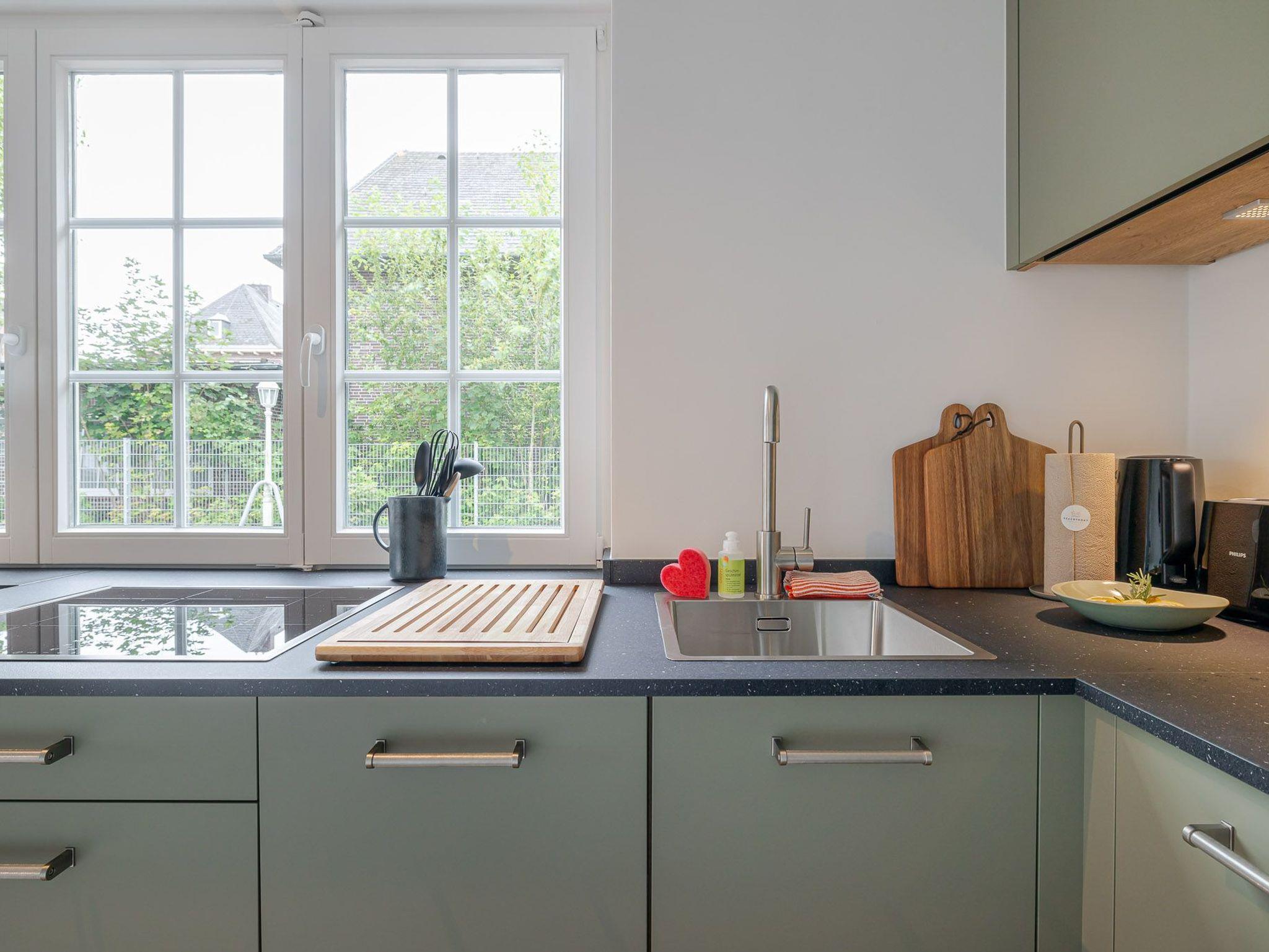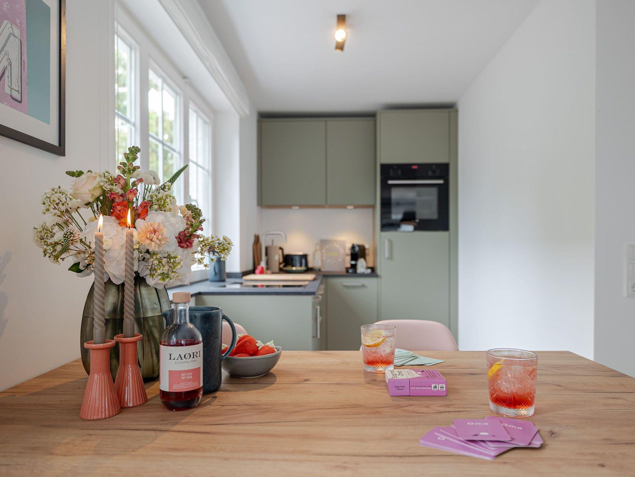 Danach geht es weiter in den charmanten Wohn- und Essbereich, wo ein vollwertiges Schlafsofa ebenfalls eine gute Nacht garantiert. Geschickt integrierte, maßangefertigte Schränke finden sie nicht nur hier, sondern auch in den anderen Räumen. Rechter Hand wartet eine hochwertige Küche, auf dessen Komfort, Ausstattung und Funktionalität Sie sich rund um die Uhr verlassen können. Eine kleine Drehung nach links und Sie blicken direkt auf die angrenzende Terrasse, im besten Fall natürlich bei herrlichstem Strandwetter.