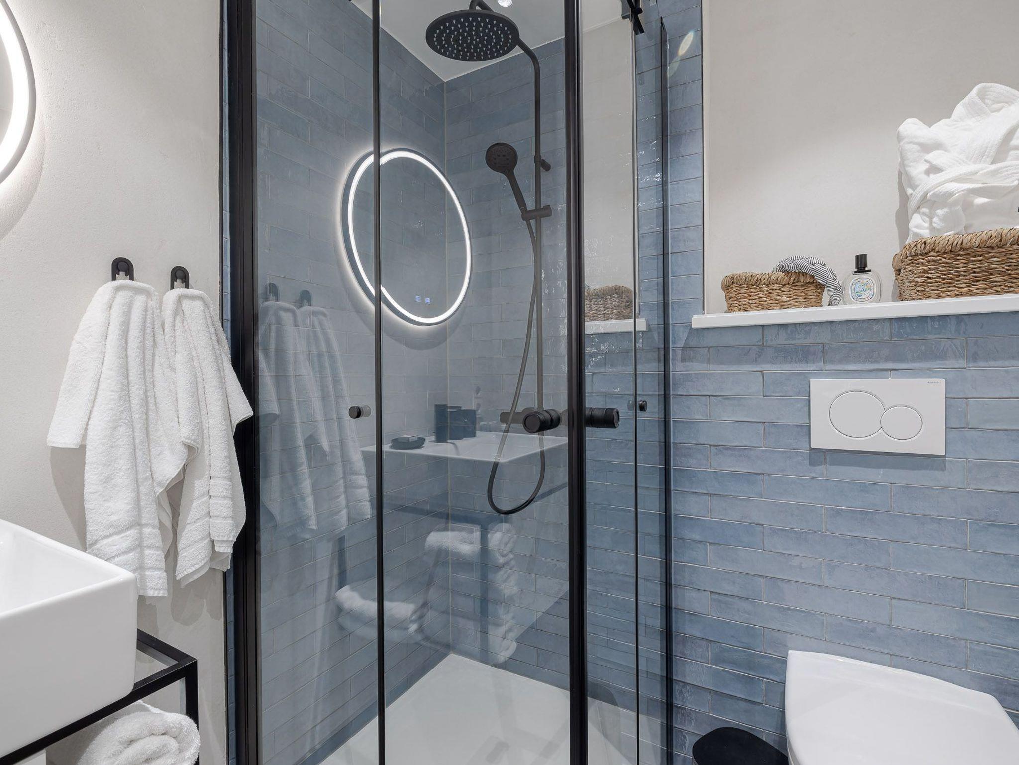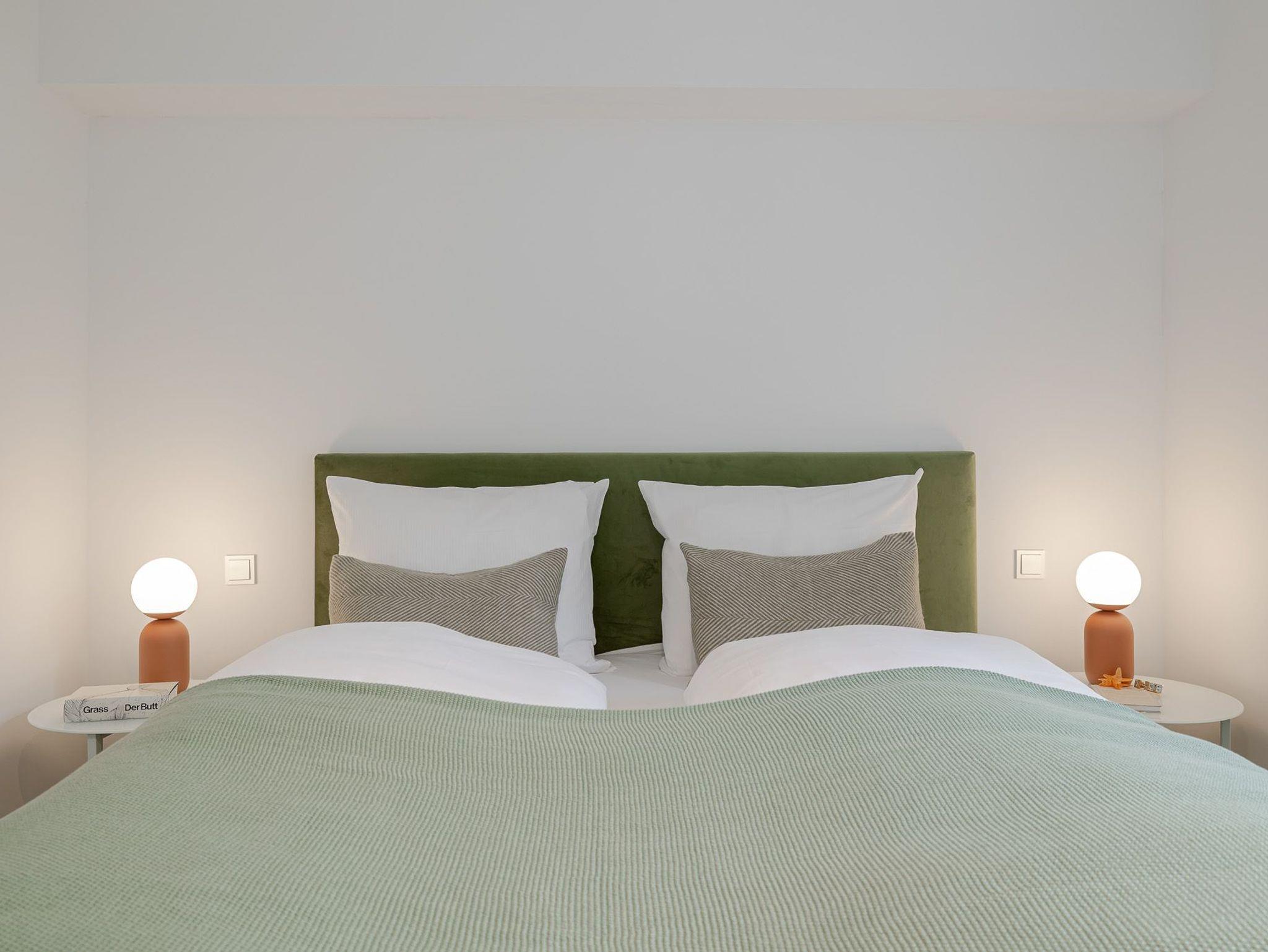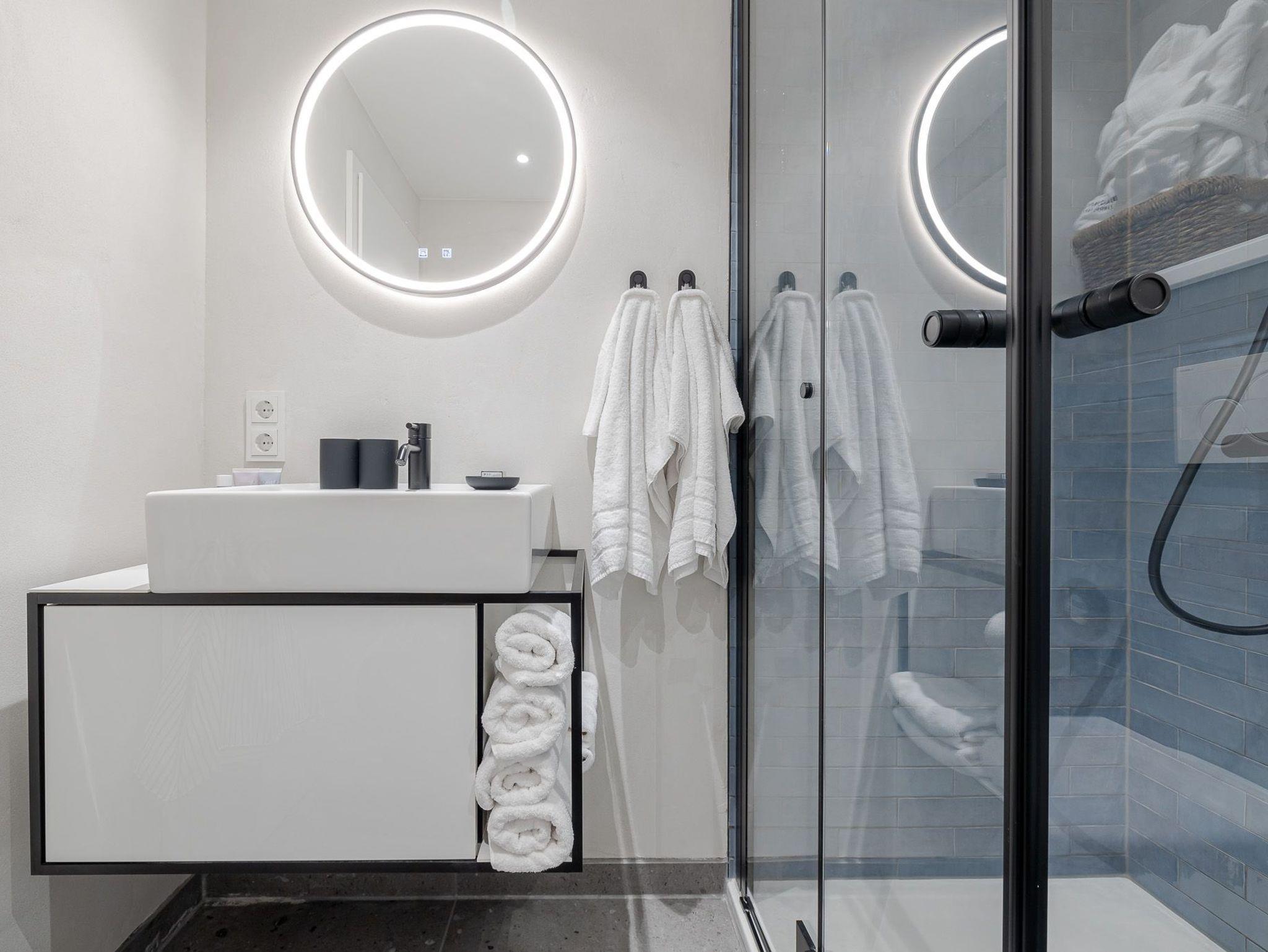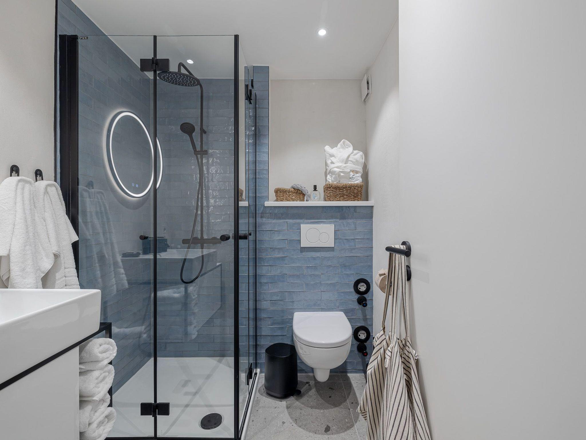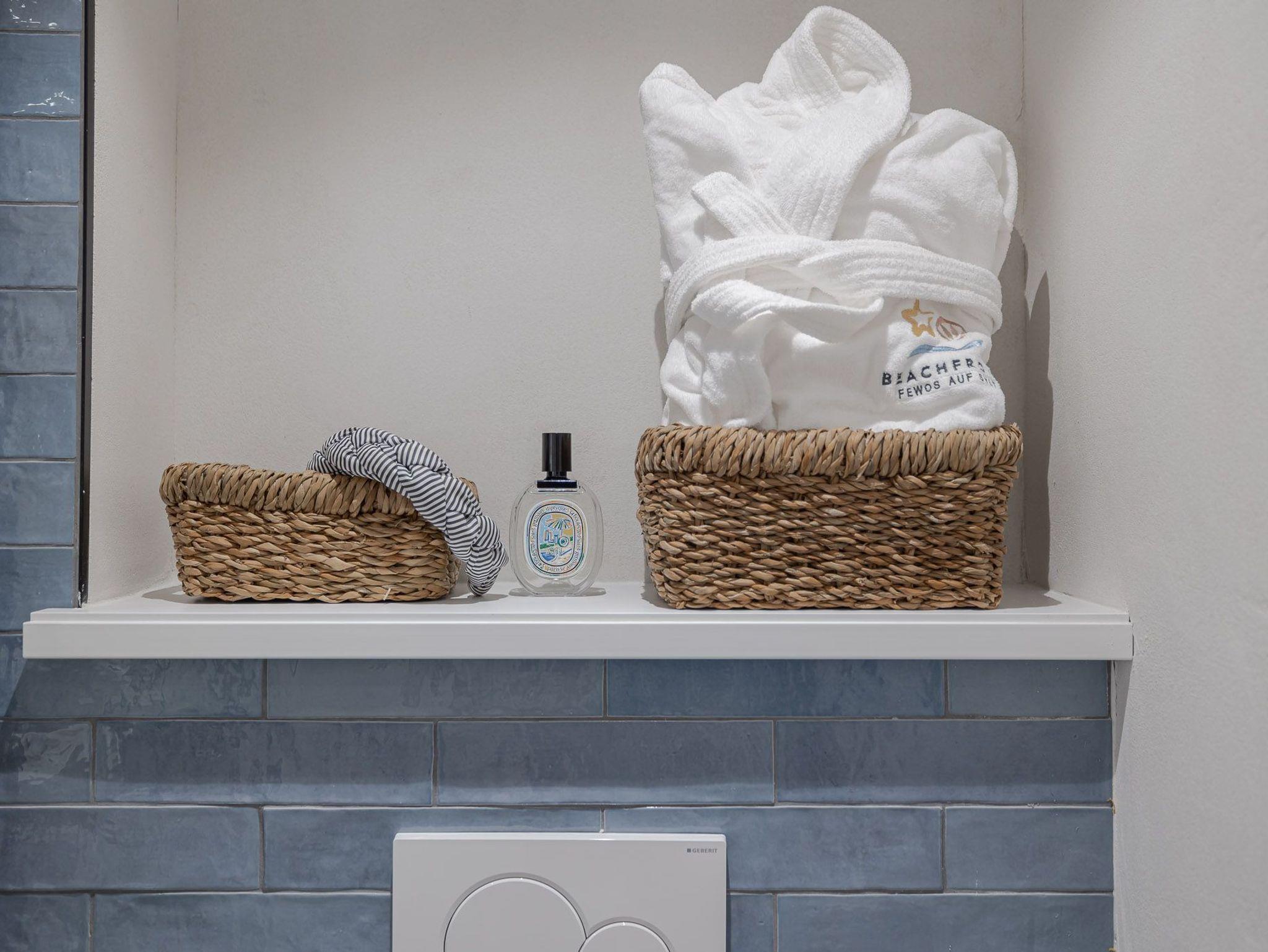 Starten Sie ausgeruht in einen neuen Tag! Nach einer ruhigen Nacht, im komfortablen Boxspringbett der Marke Schramm, können Sie sich direkt nebenan im Bad von der großen Regendusche berieseln lassen. Mit den Farben Meerblau und Sand verbreitet dieser Raum schon am Morgen ein echtes Inselfeeling. Handtuchwärmer und Fußbodenheizung sorgen derweil für ein kuscheliges Gefühl, besonders an den stürmisch-kühleren Nordseetagen.