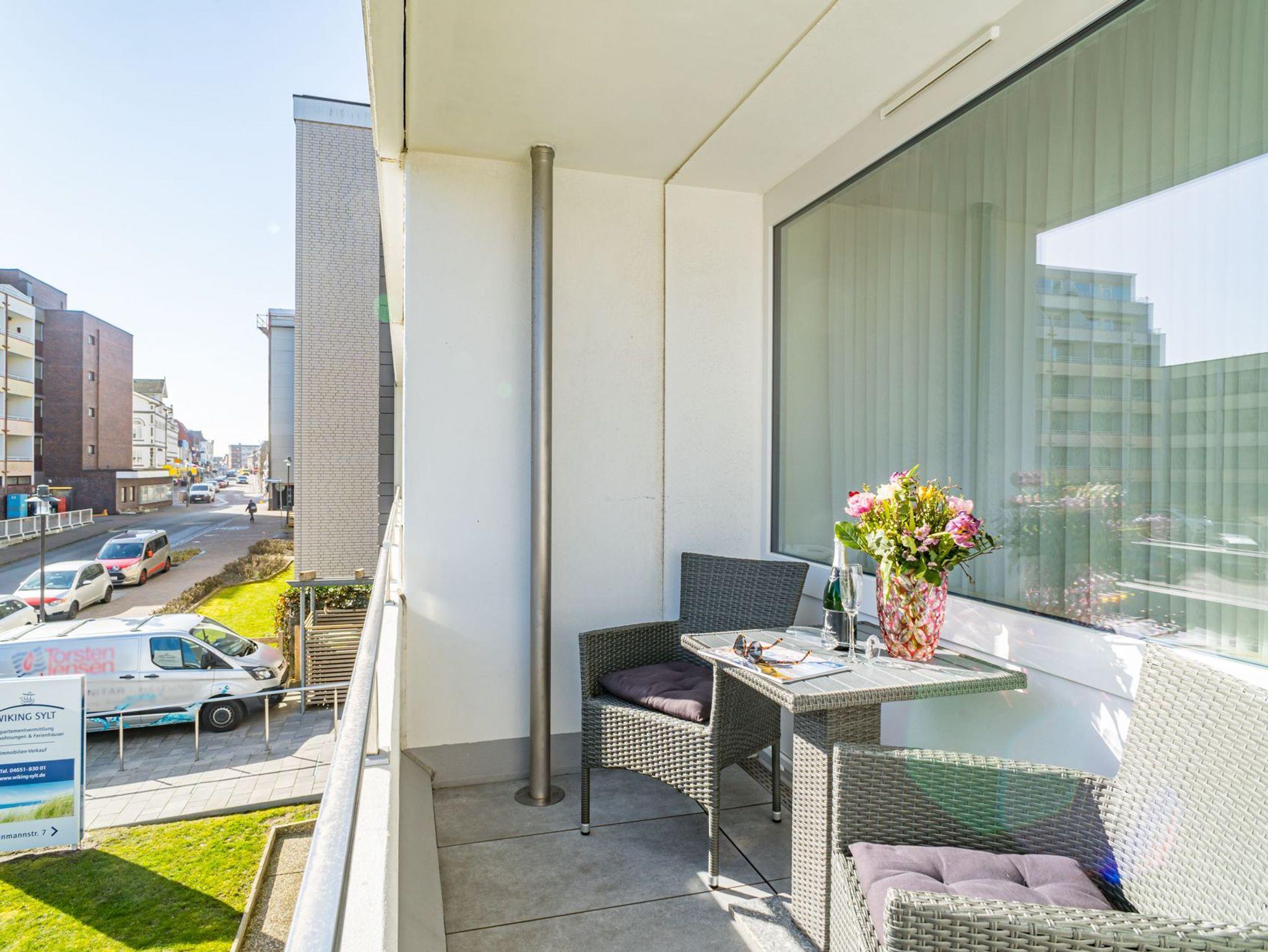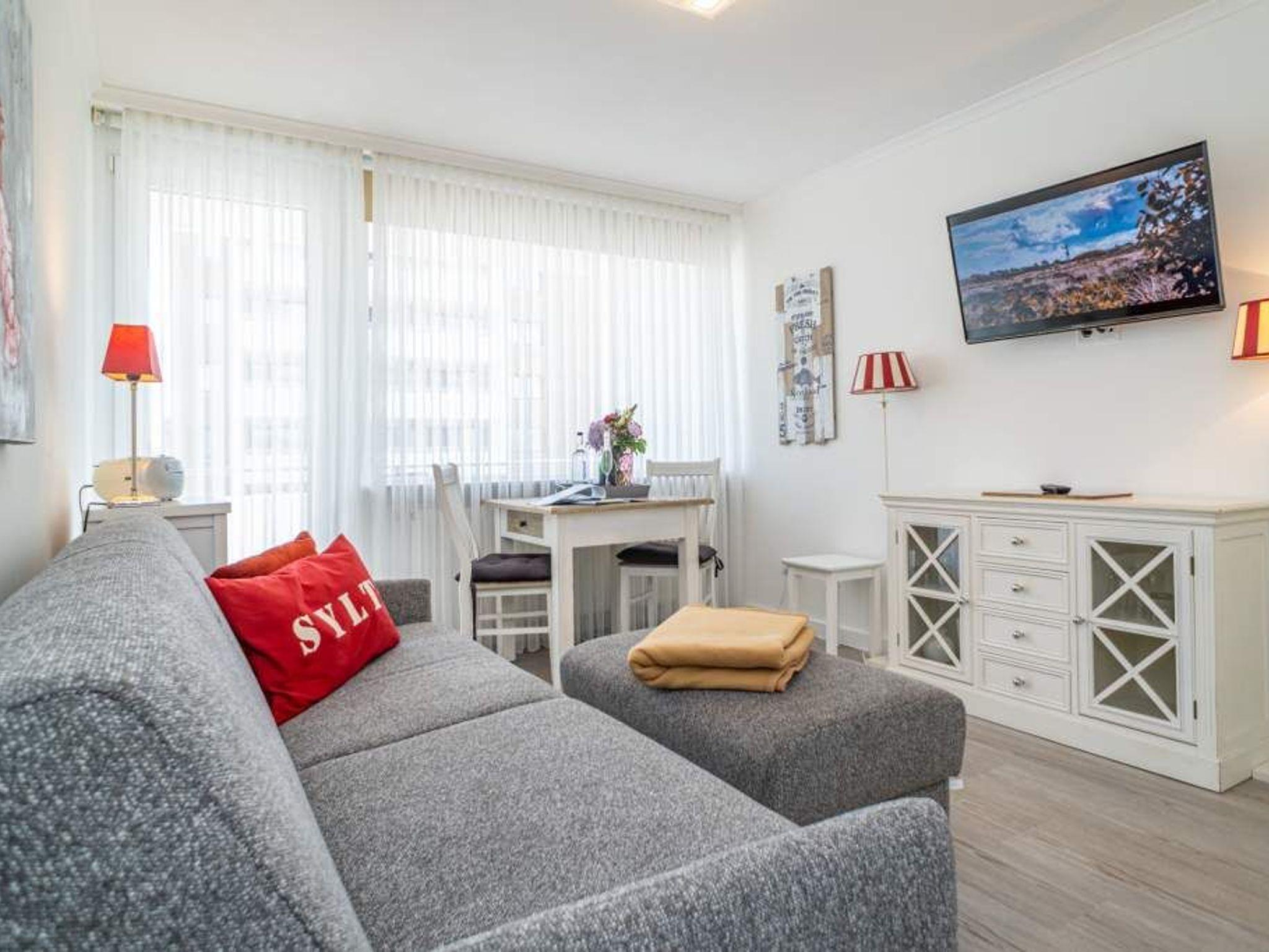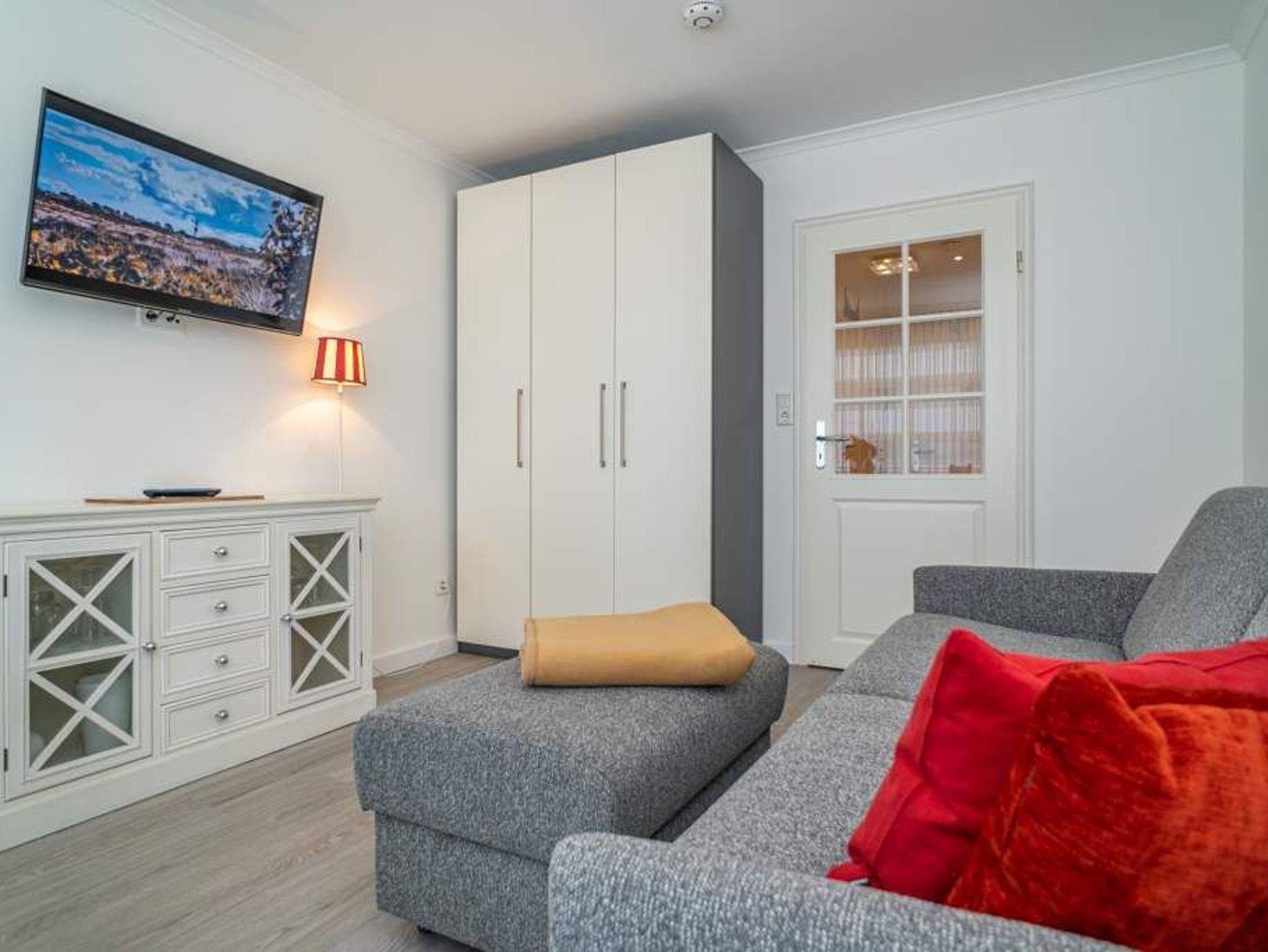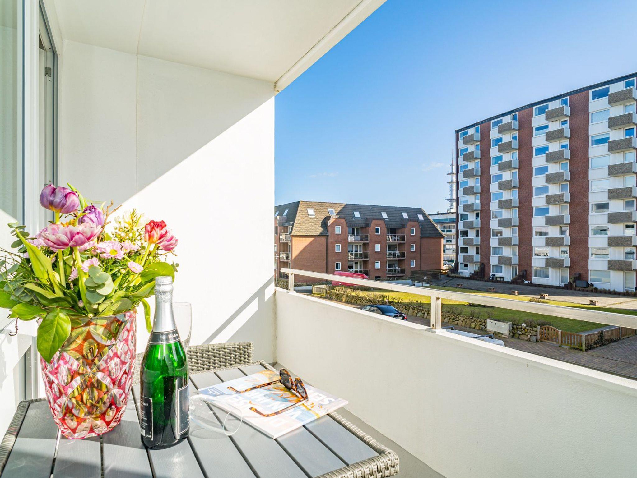Neu gestaltete und renovierte 1-Zimmer-Nichtraucher-Ferienwohnung (ca. 23 qm) in der 1. Etage zur Landseite mit Ostloggia (Morgensonne, mit Balkonmöbeln und Auflagen) für max. 2 Personen.
