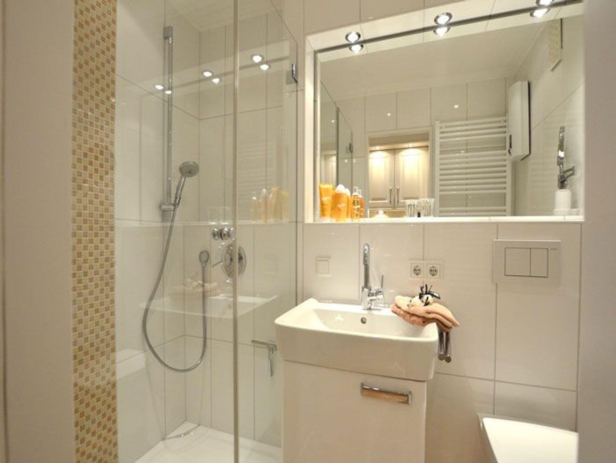 Im neuen Bad befinden sich eine flache Dusche, ein WC, ein Waschtisch, ein Handtuchtrockner und ein Fön.
