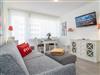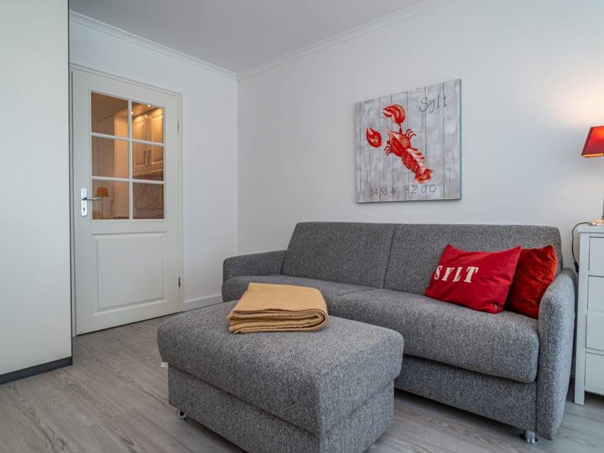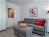 Der gemütliche Wohn-/Schlafraum mit Designerboden in Holzoptik besteht aus einer Doppelschlafcouch (Liegefläche 1,60 x 2 m mit separater Matratze, die sich ausklappt, Komfort-Liegehöhe ca. 0,55 m) einem Essplatz, einem Kleiderschrank, einem neuen Kabel-Flachbild-TV, Radio-CD.