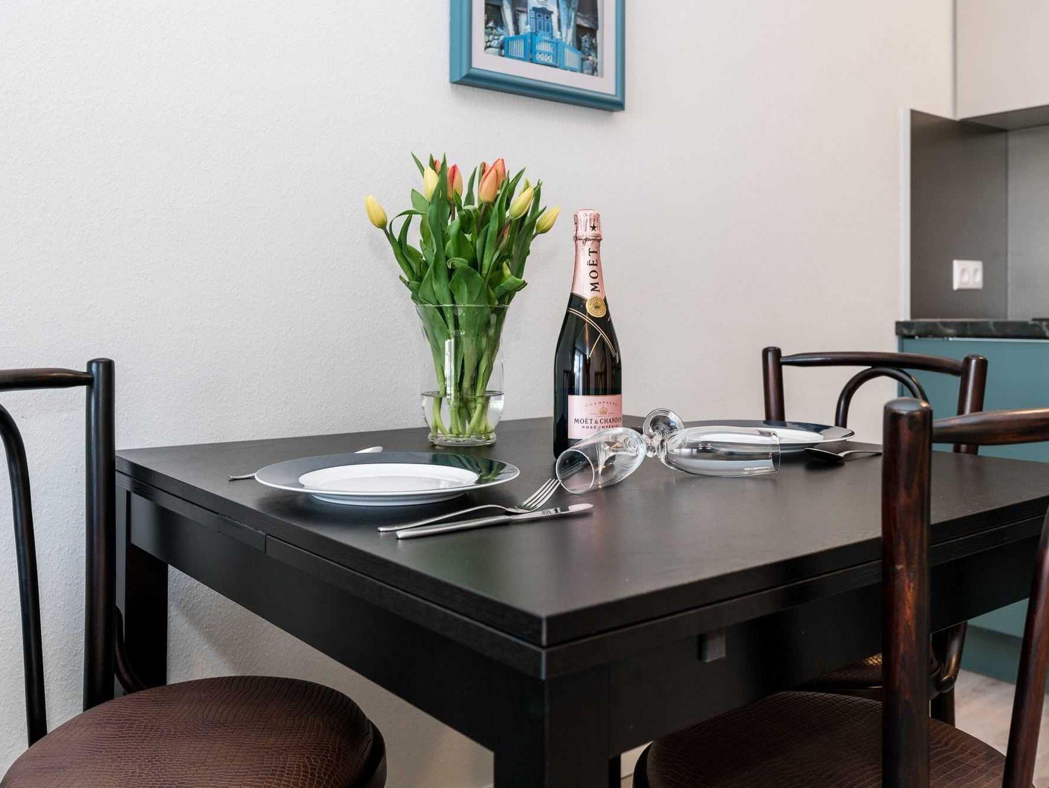 Die Unterkunft liegt im 1. Obergeschoss und hat einen möblierten Balkon nach Westen. Die Wohnung wurde Ende 2017 komplett neu renoviert und erstrahlt im neuen Glanz. In dem modernen kombinierten Wohn/Schlafbereich befindet sich ein gemütliches Doppel-Schrankbett mit Flachbildfernseher und einem DVD-Player. Die Küchenzeile verfügt über einen Geschirrspüler, Backofen, Toaster, Wasserkocher, einer Filter-Kaffeemaschine und einer Tchibo-Cafissimo Kabsel-Maschine. Zudem verfügt die Ferienwohnung über Dusche/WC.