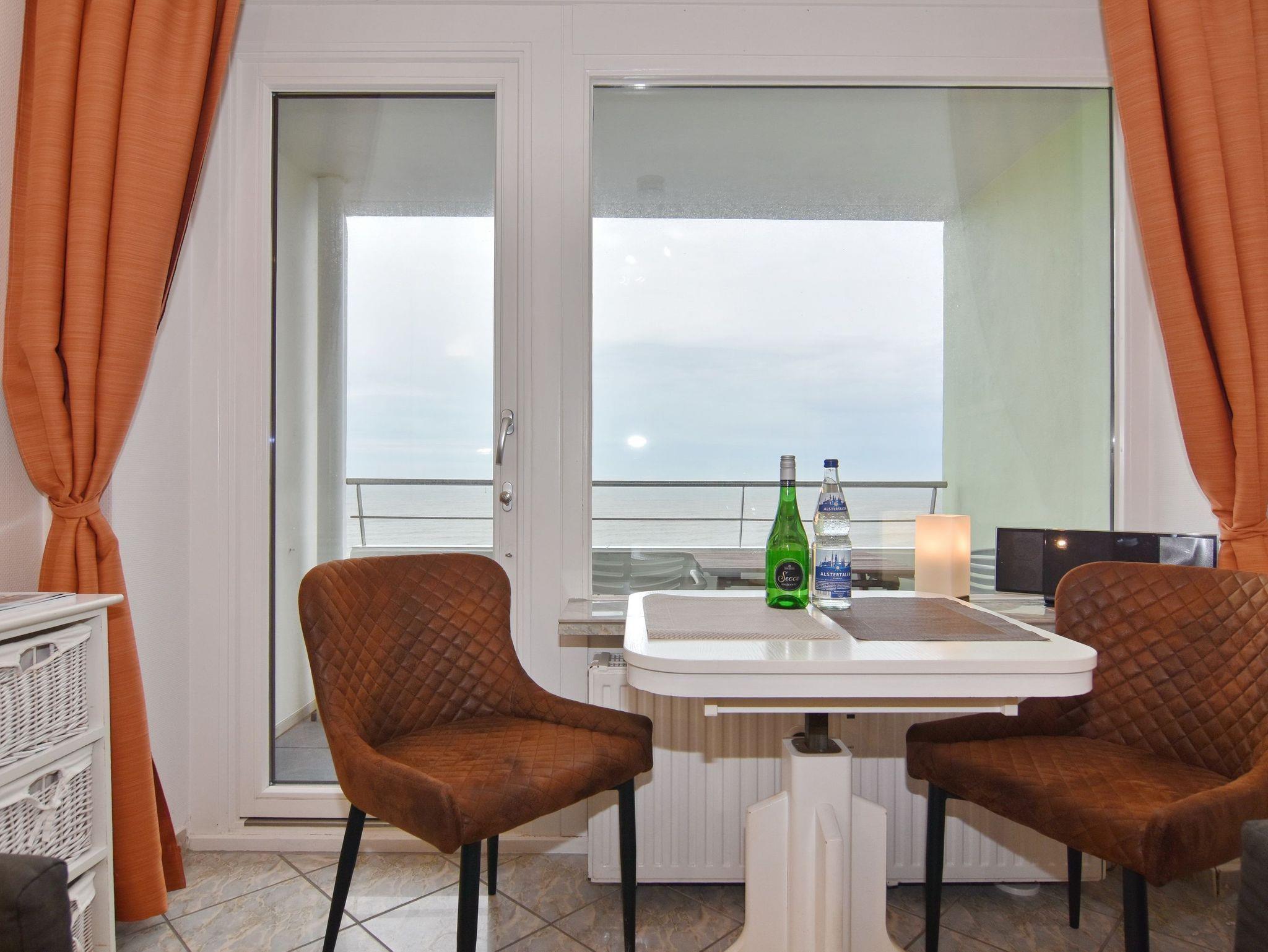 Hübsche 1-Zimmer-Ferienwohnung im 5.OG des Haus am Meer. Ca. 25 qm. Nichtraucher-App.! Helles Wohn-/Schlafzimmer mit Doppelschrankbett (2x90x200), Eßplatz am Fenster, 2 Sessel, Flachbild-TV, Radio, Westbalkon mit Balkonmöbeln und freiem Meeresblick, moderne Küchenzeile mit Mikrowelle im Flurbereich, Duschbad/WC. W-LAN (ohne Gewähr). Das App. ist komplett gefliest. Bettwäsche und Handtücher sind zur Anreise aufgezogen. Ein PKW-Stellplatz kann kostenpflichtig zugebucht werden. Tierhaltung ist nicht gestattet. Beginnend vom 15.10.2025 bis 5.4.2026 (Ostern) findet die Fassandensanierung der Landseite (Osten) sowie des Südgiebels statt. Mit Baulärm ist in dieser Zeit zu rechnen.
