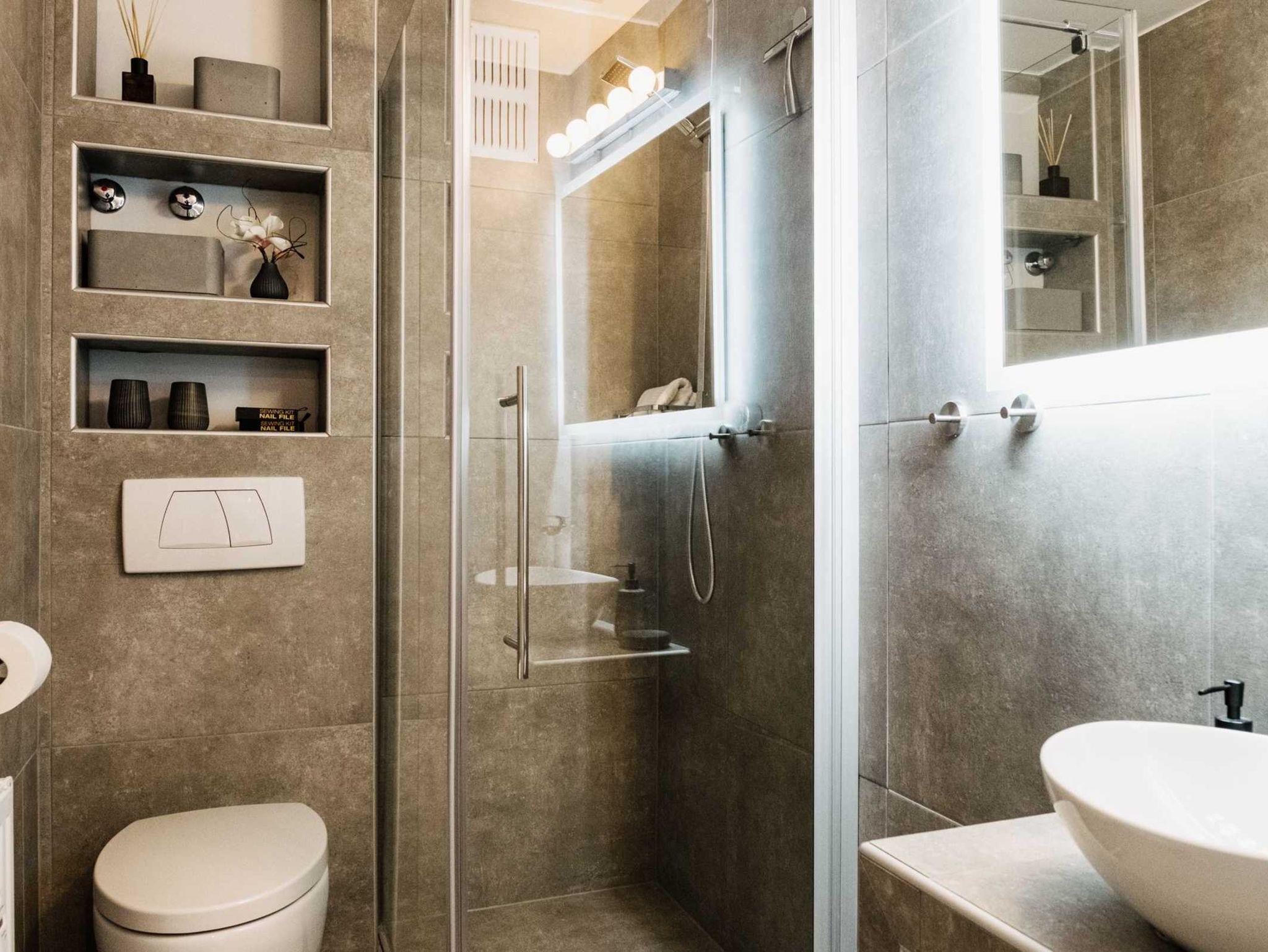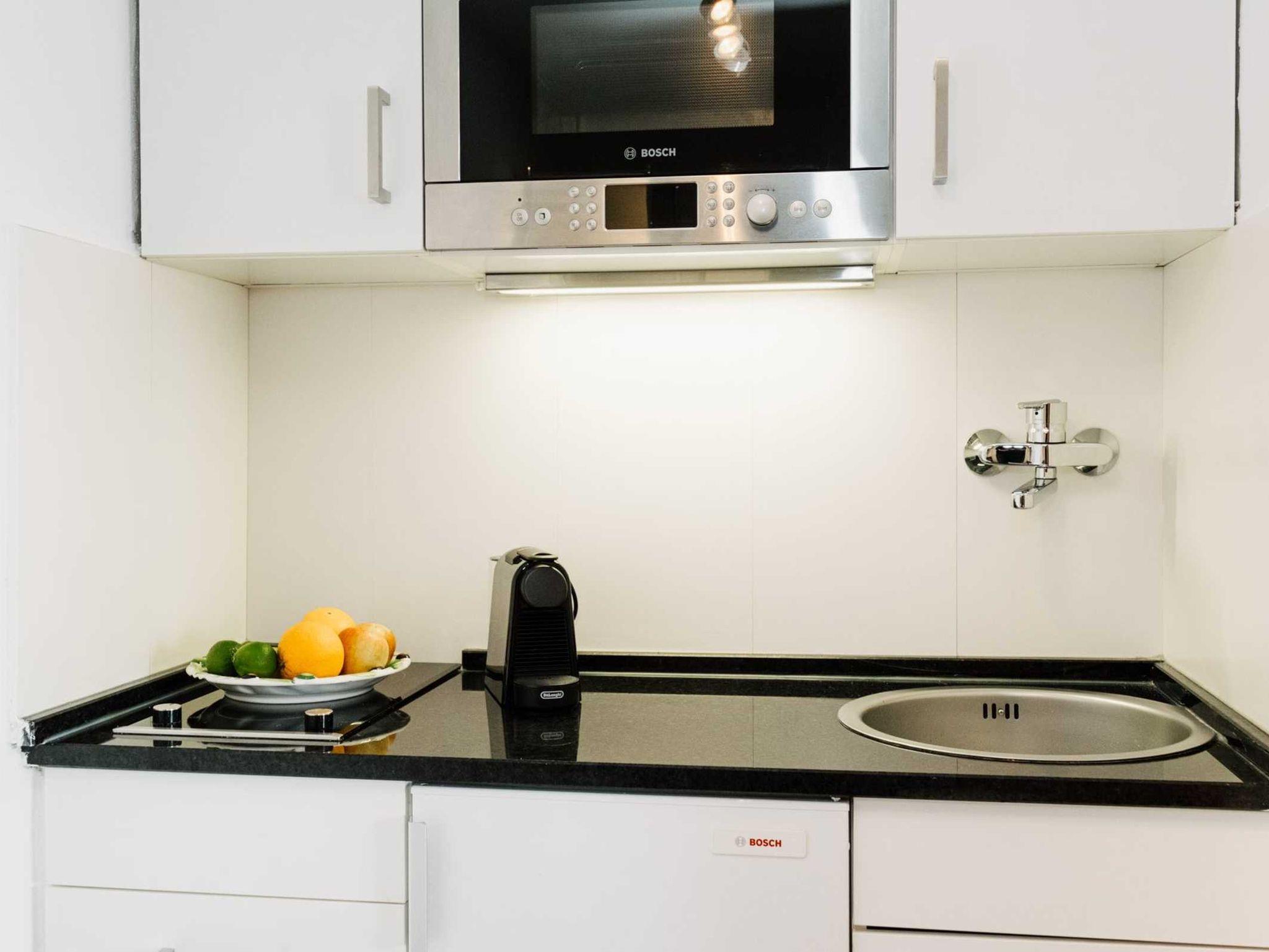 Die kleine separate Küchenzeile verfügt über ein Cerankochfeld, einer Mikrowelle , Nespresso-Kaffeemaschine, Filter-Kaffeemaschine, Wasserkocher und Toaster . Das neue Badezimmer verfügt über eine Regendusche, LED-Badezimmer-Spiegel und WC.
