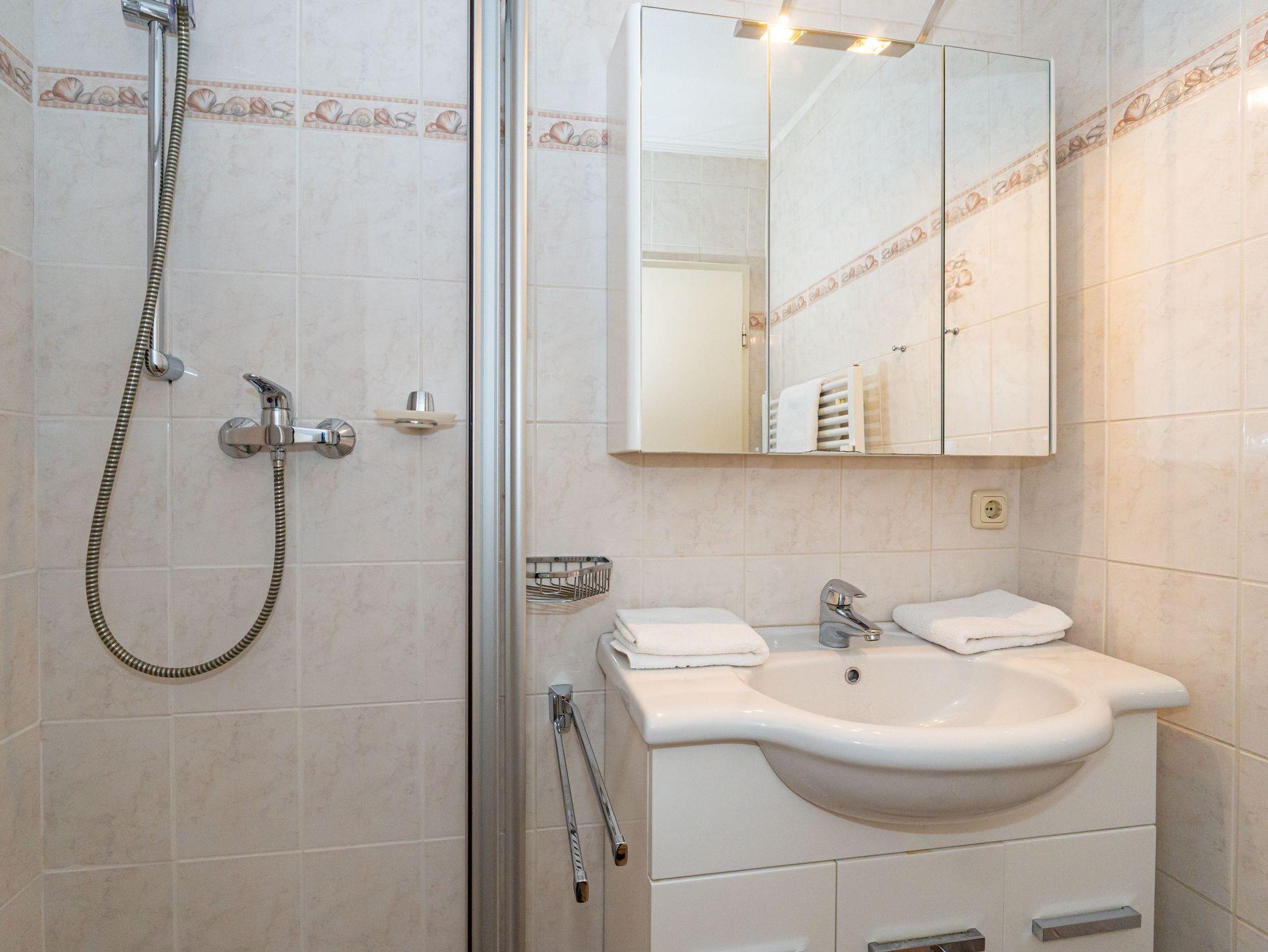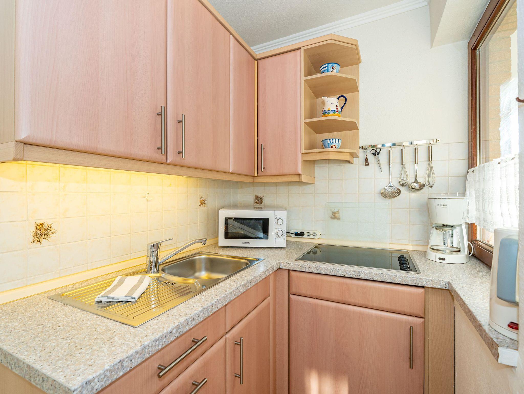 Beim Betreten gelangen Sie über einen einladenden Vorflur in den offenen Wohnbereich, der die Kochnische, das Schlafzimmer und das helle Duschbad/WC umfasst. Der gemütliche Wohnraum ist mit einer 3-Sitzer-Schlafcouch, zwei Sesseln, einem separaten Essplatz sowie Radio, Kabel-TV, Flachbildfernseher und Telefon ausgestattet. Die offene Kochnische verfügt über eine Mikrowelle, ein Cerankochfeld mit vier Kochfeldern, einen Kühlschrank und ein Fenster Kaffeemaschine, Wasserkocher und Toaster gehören ebenfalls zur Grundausstattung. Das Schlafzimmer ist mit einem komfortablen Doppelbett eingerichtet, während das Badezimmer über eine Dusche, ein WC und einen Waschtisch verfügt.