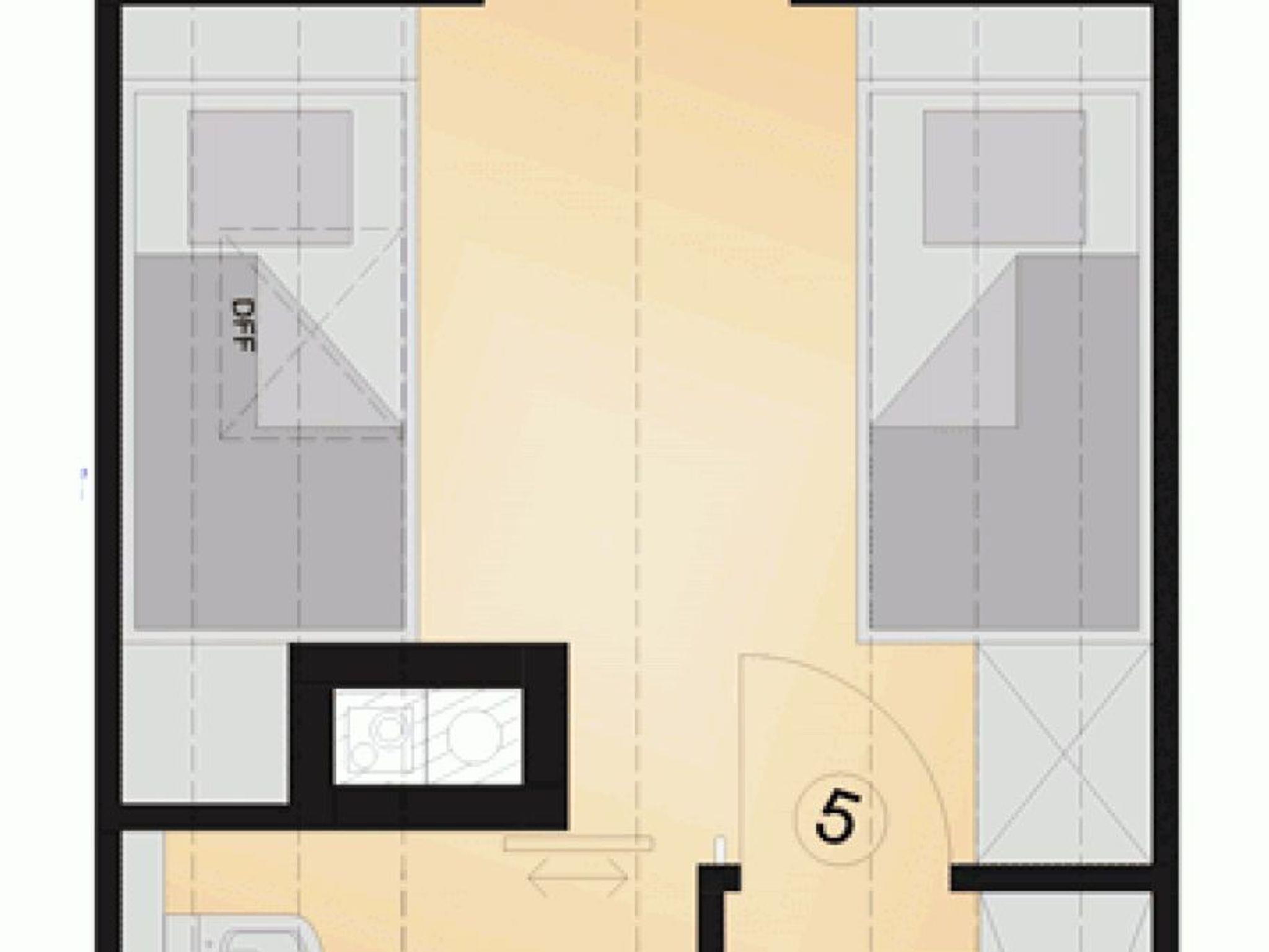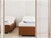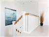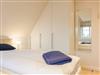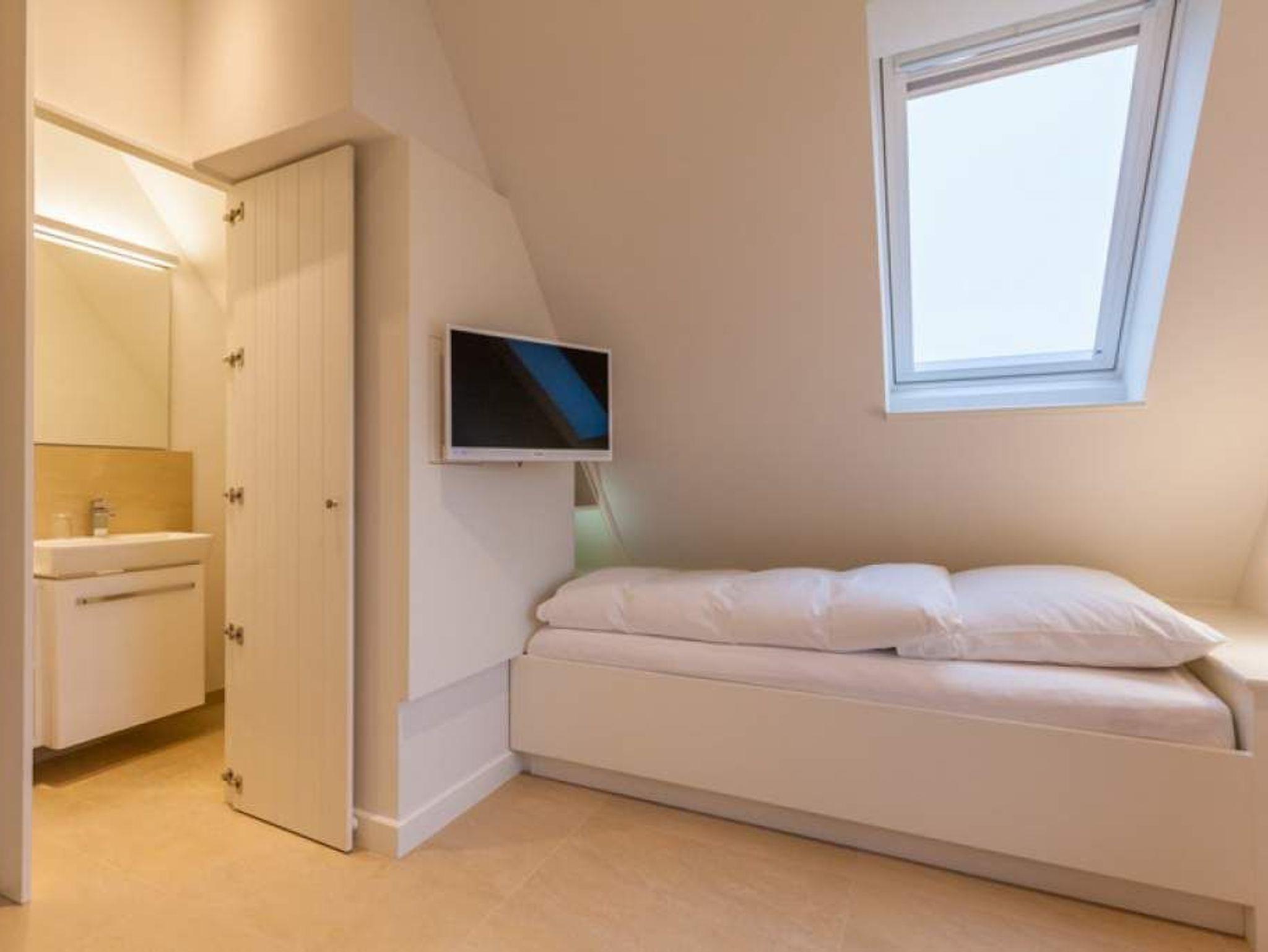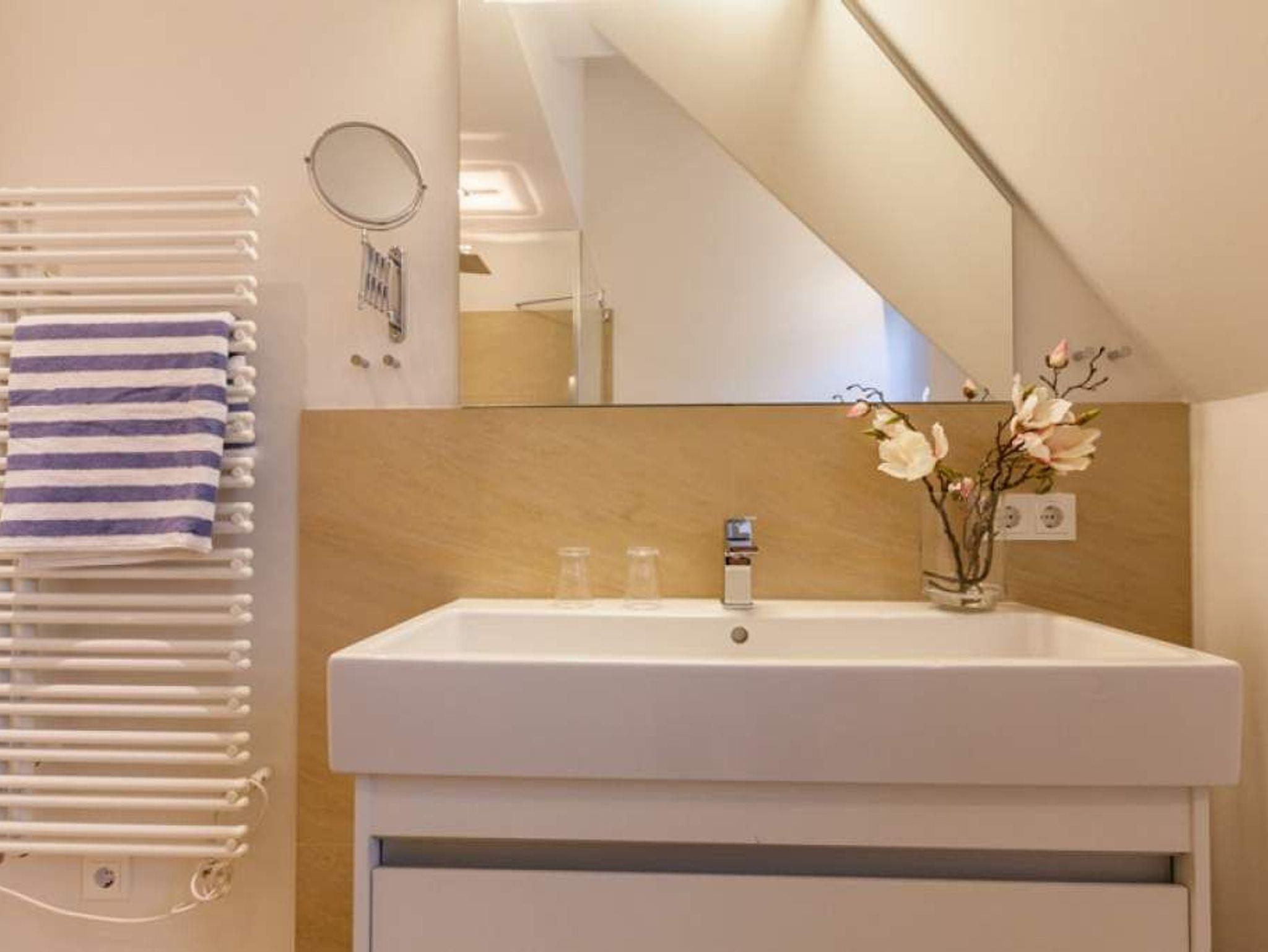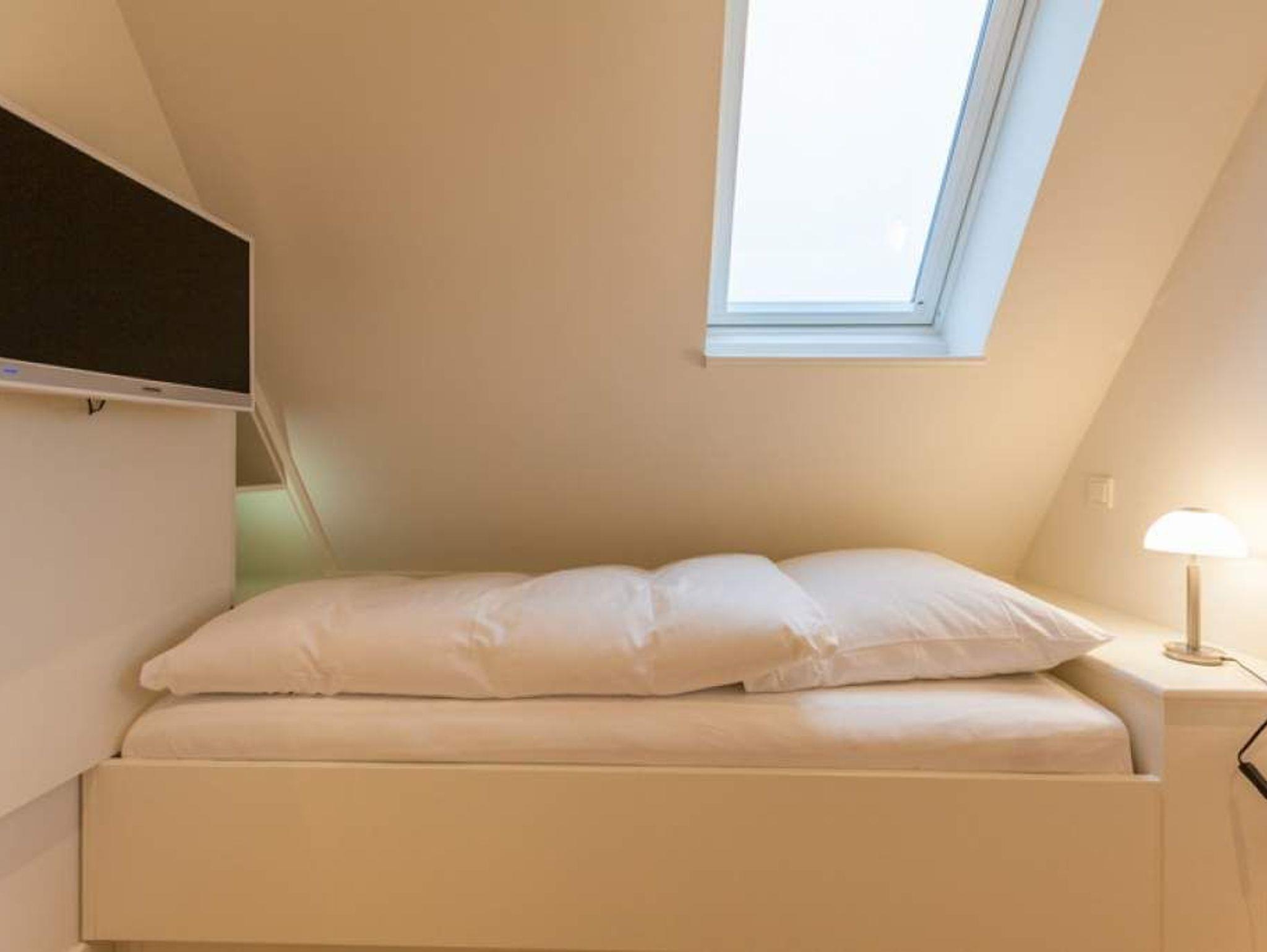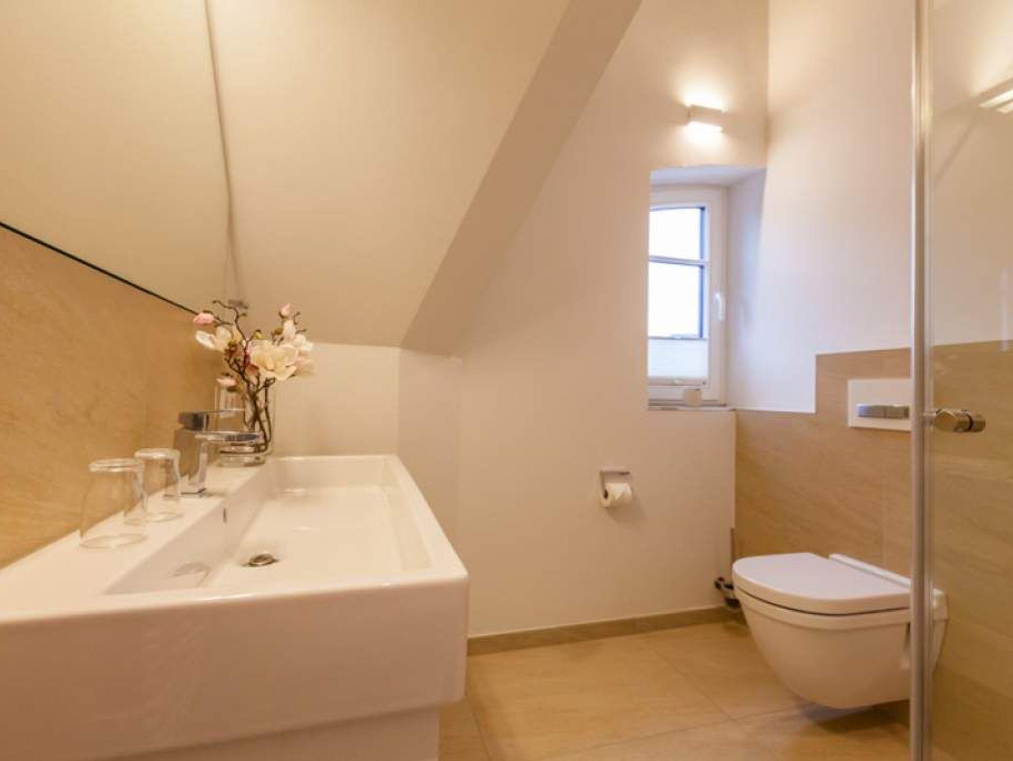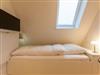 Auf der oberen Ebene, im Dachgeschoss, befinden sich ein Zweibett-Zimmer mit Boxspringbetten (0,90 x 2,00 m), Freiluftzugang zur Westloggia sowie ein Gäste-WC mit Waschbecken.