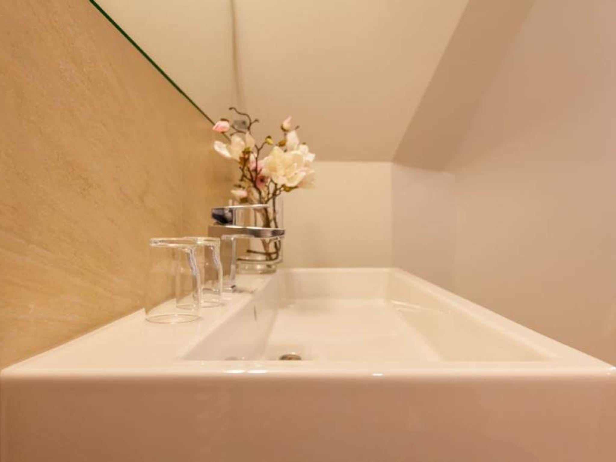 Das neue Bad lässt mit moderner Regendusche, Fön, Kosmetikspiegel, Waschtisch, Handtuchwärmer und WC keine Wünsche offen.