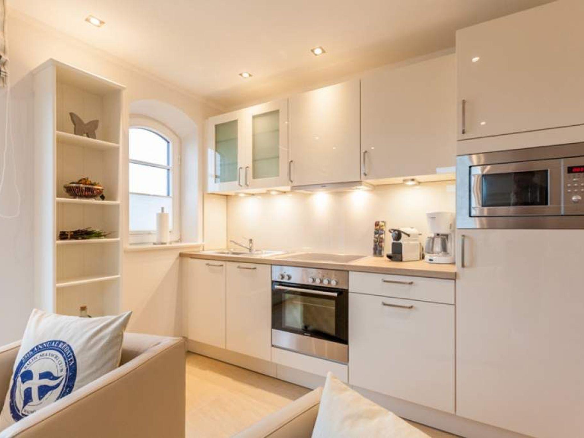 Die offene Küche ist mit Cerankochfeld, Geschirrspüler, Mikrowelle, Backofen, Kühlschrank, Nespresso-Maschine und einem Eierkocher voll ausgestattet. Toaster, Kaffeemaschine und Wasserkocher gehören zur Grundausstattung.