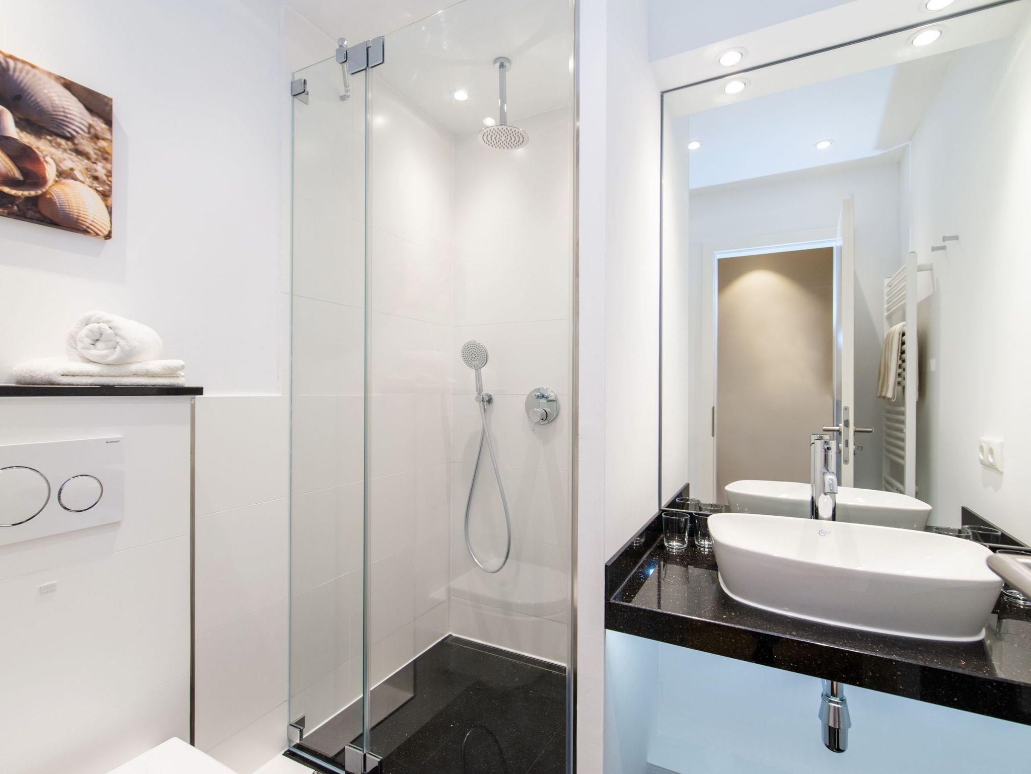 Das neue Bad bietet eine Dusche mit flachem Einstieg, einen Waschtisch und einen Handtuchtrockner.