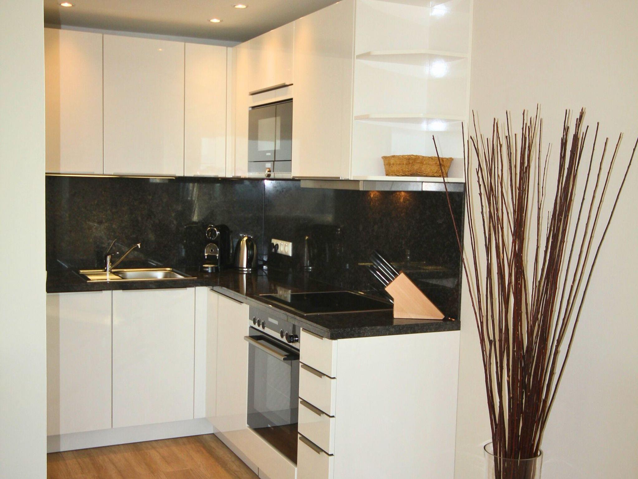 Die zum Wohnraum offene Küche mit Granitarbeitsplatte hat einen Geschirrspüler, Backofen, Mikrowelle, Ceranfeld (4 Felder), Kühlschrank mit 3-Sterne-Gefrierfach und eine Nespresso-Maschine. Kaffeemaschine, Wasserkocher und Toaster gehören zur Grundausstattung.
