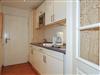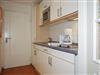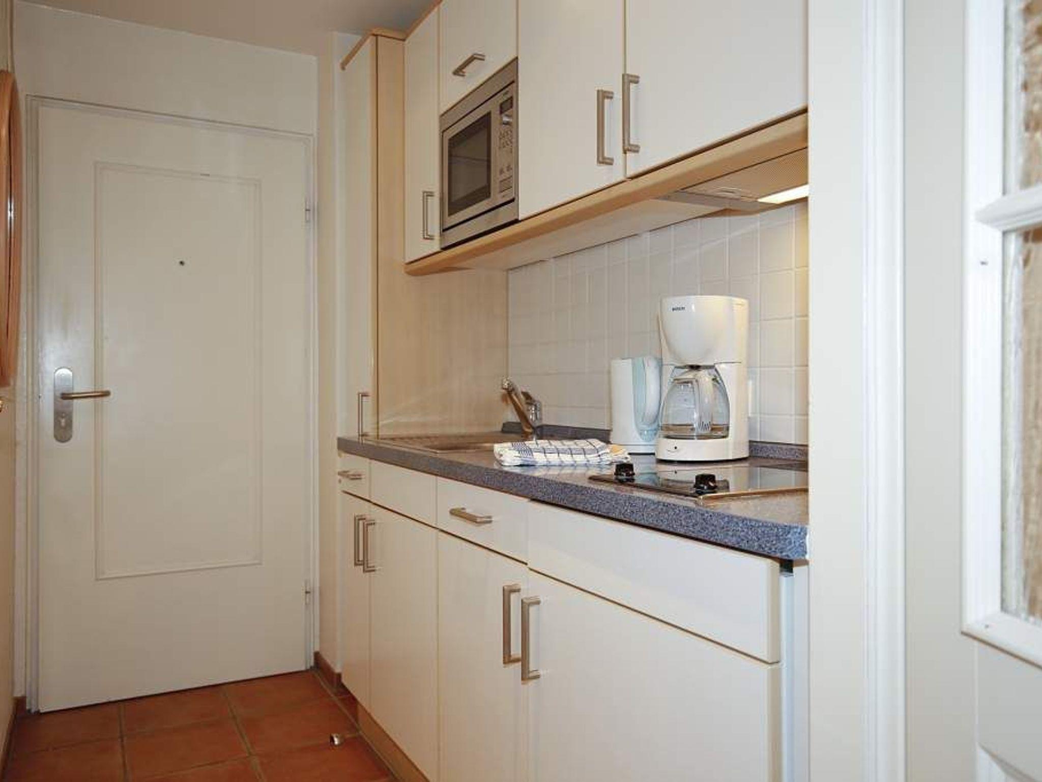 Die helle Küchenzeile hat eine Mikrowelle (mit Grillfunktion), ein Cerankochfeld und einen Kühlschrank mit 3-Sterne-Gefrierfach.