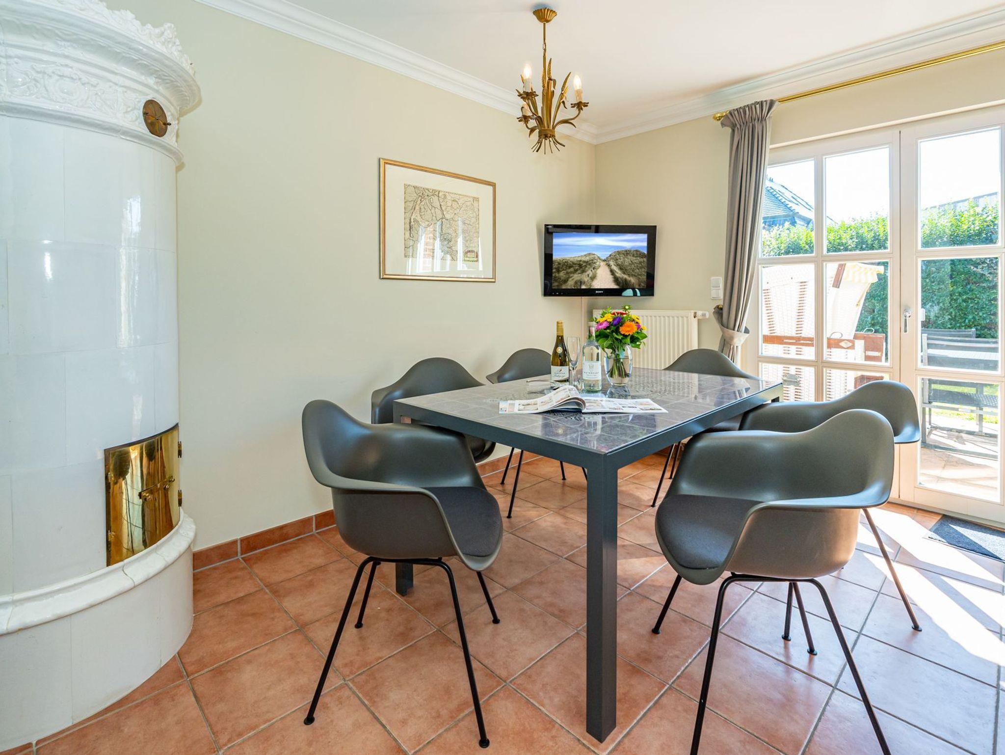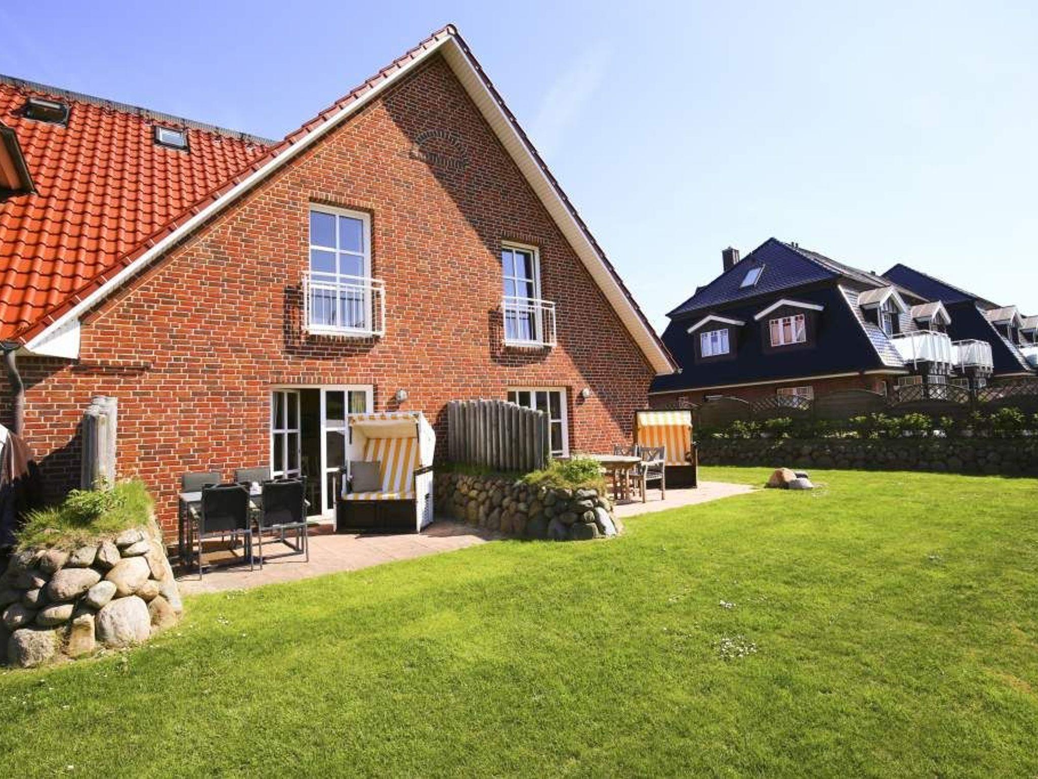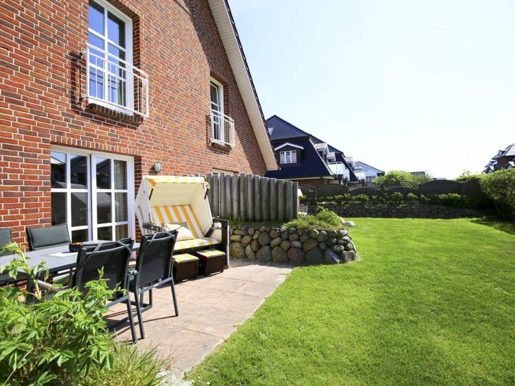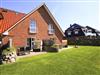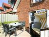 Vom Wohnzimmer betritt man die nach Süden ausgerichtete Sonnenterrasse mit Saison-Strandkorb (ca. April-Oktober) und Gartenmöbeln.