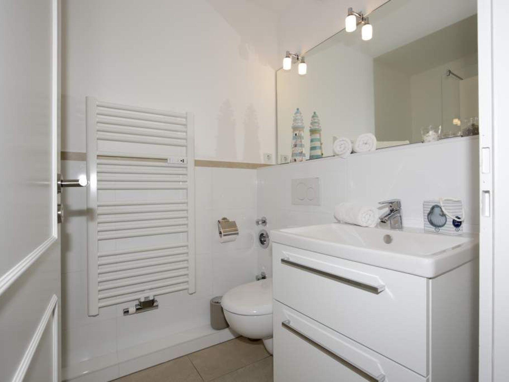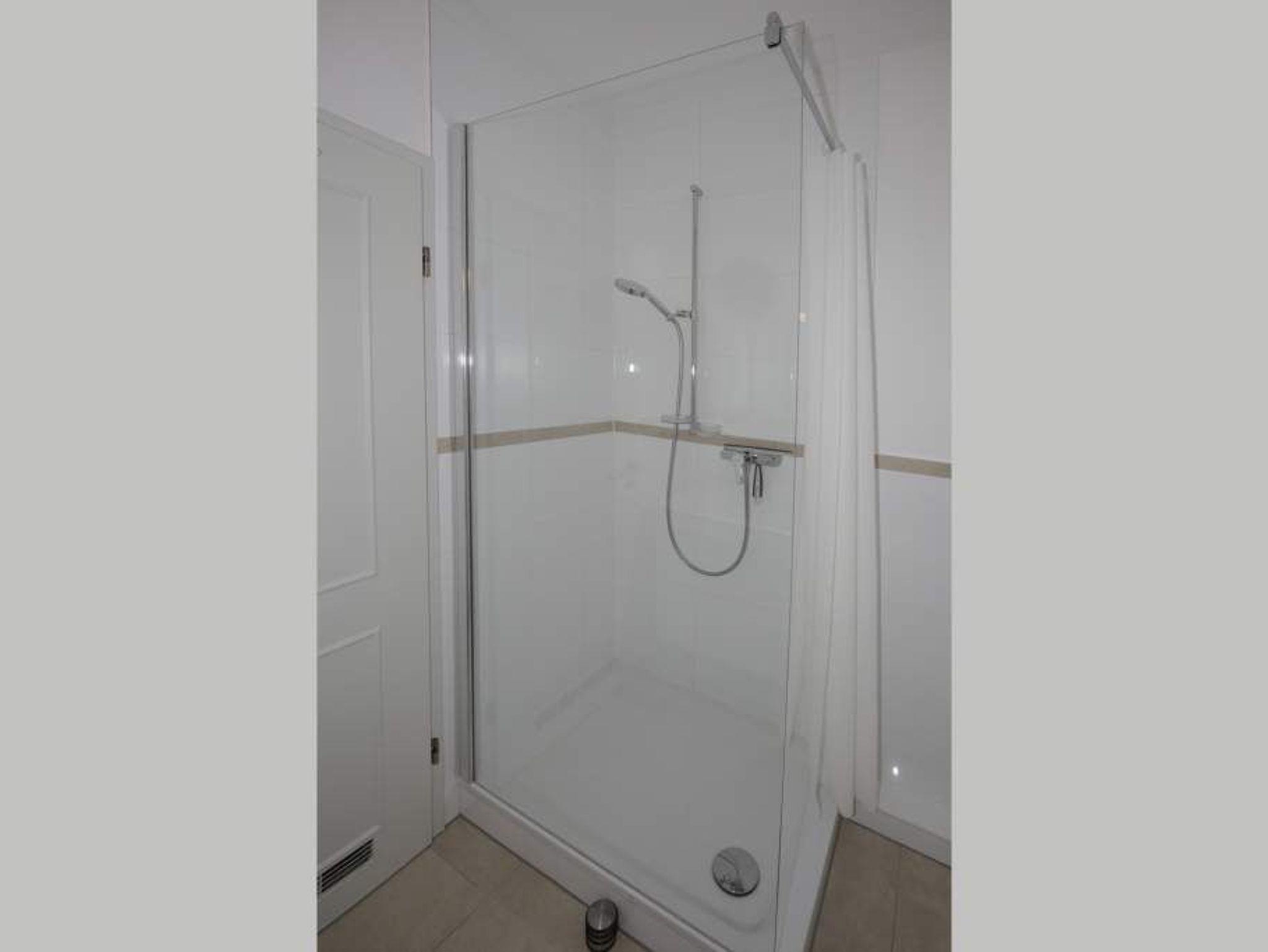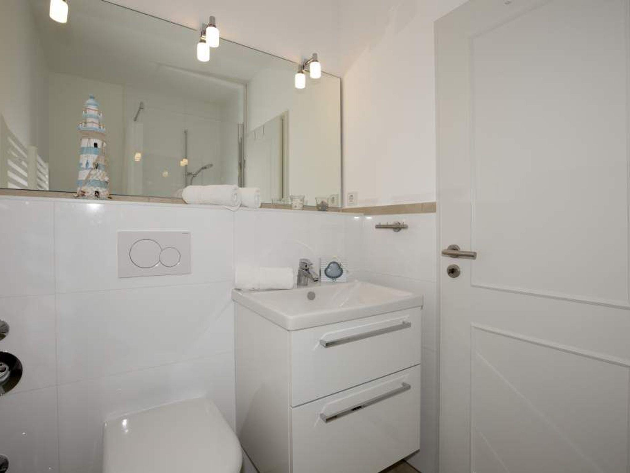 Das Bad verfügt über eine Dusche, ein WC und einen Waschtisch.