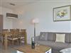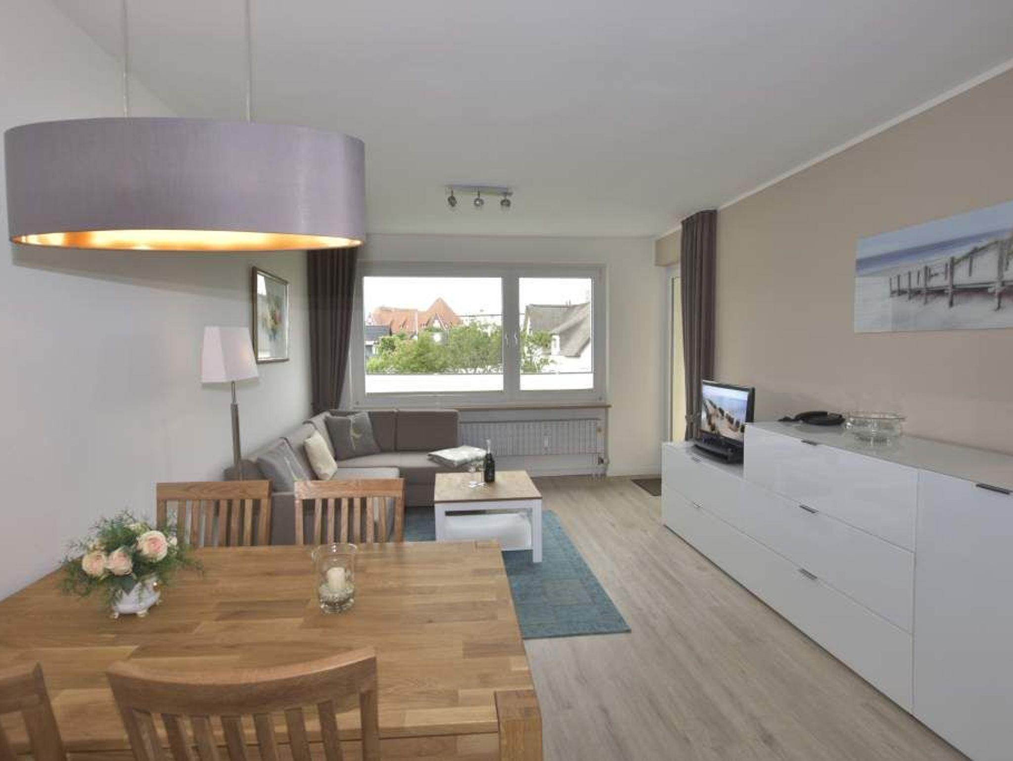 Das Wohnzimmer hat eine Sofaecke, einen Essplatz und Zugang zur Westloggia mit Balkonmöbeln und Auflagen.