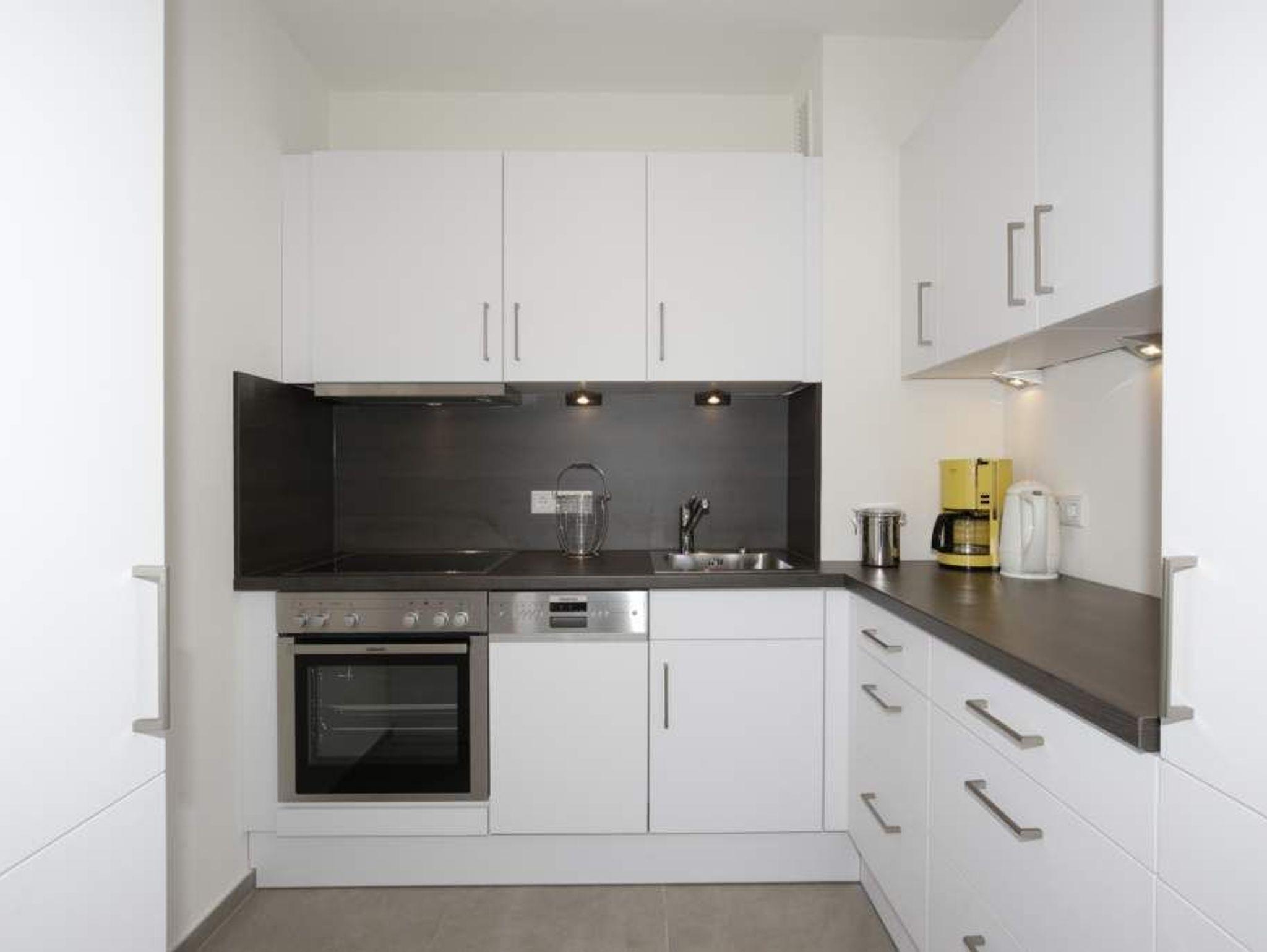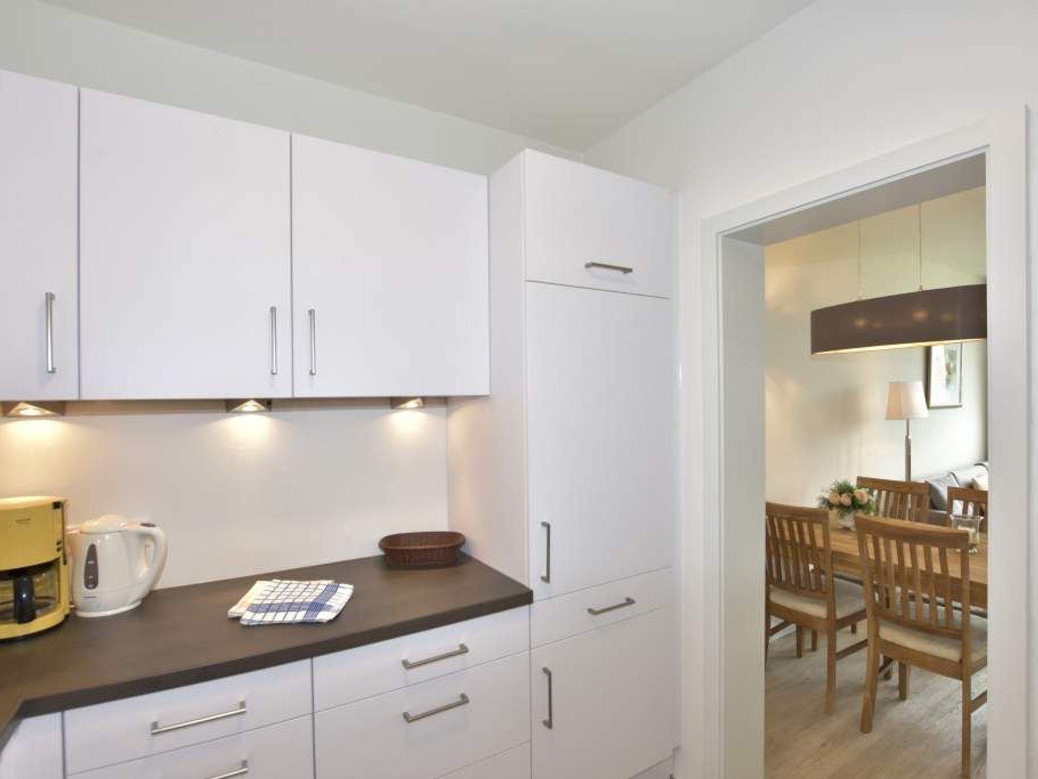 Die helle Küche hat einen Geschirrspüler, ein 4-Platten-Ceranfeld mit Backofen und einen Kühlschrank mit 3-Sterne-Gefrierfach. Kaffeemaschine, Wasserkocher und Toaster gehören zur Grundausstattung.
