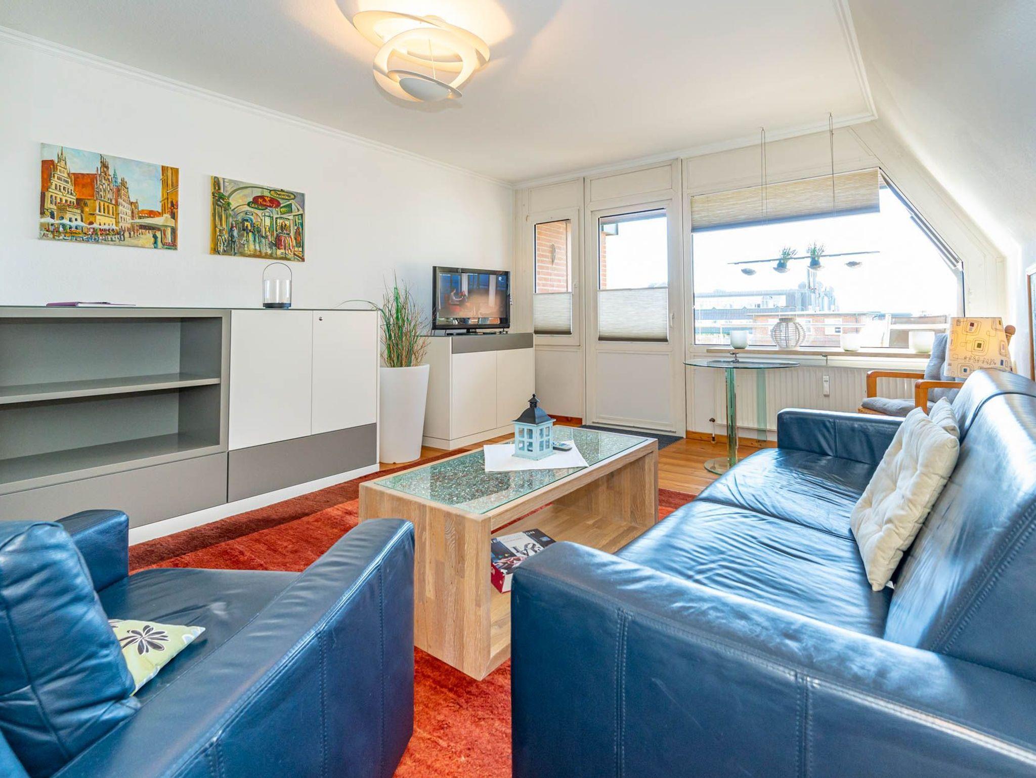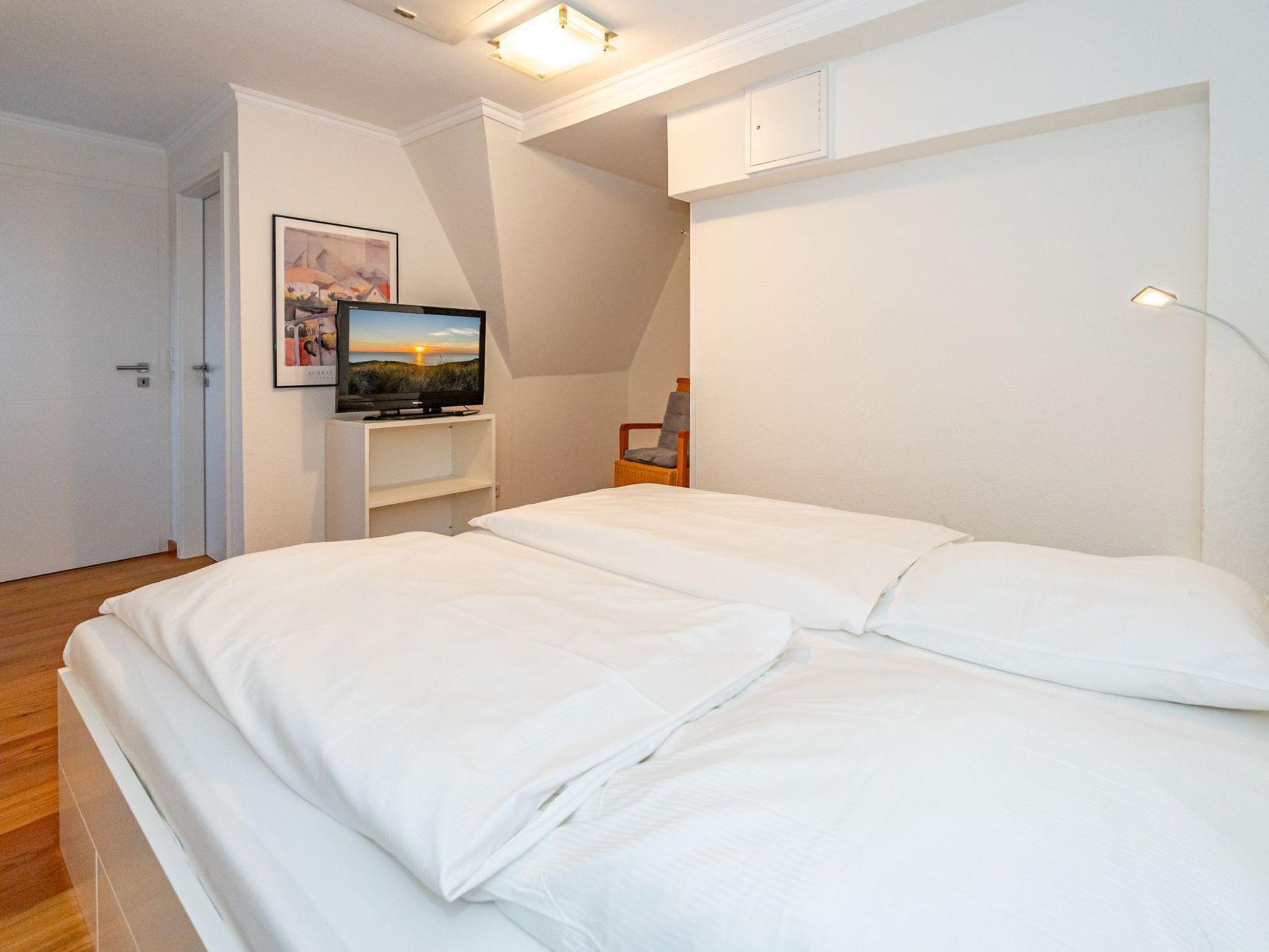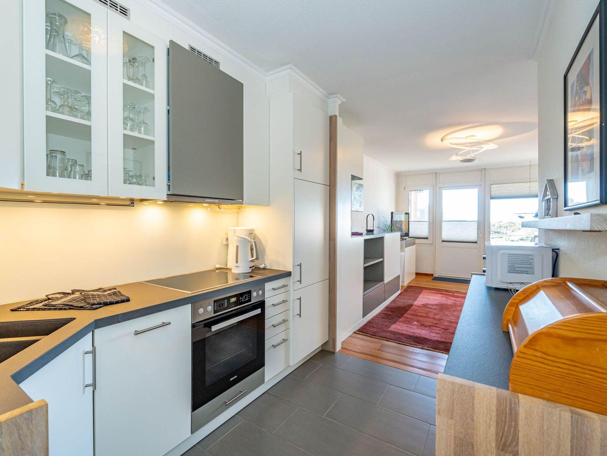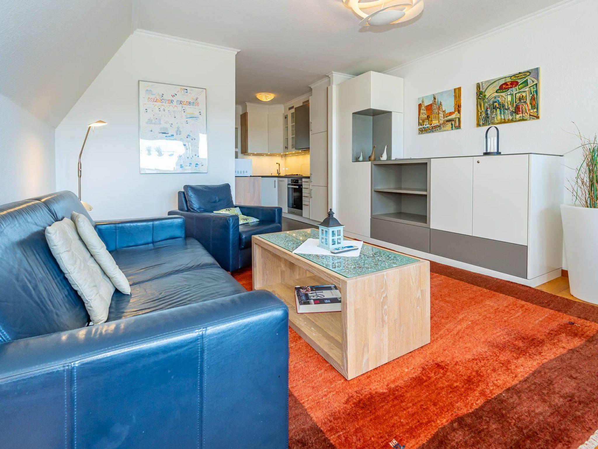 Der Wohn-/Essraum ist mit einer ansprechenden Ledergarnitur (Couch +1 großzügiger Sessel) sowie offener Einbauküche mit hochwertigen Miele-Einbaugeräten wie Geschirrspüler, Herd mit Backofen, Cerankochfeld und separatem Essplatz ausgestattet, An Technik steht ein Kabel-Flachbild-TV und kostenfreier Internetzugang per W-Lan (ohne Gewähr) zur Verfügung. In der Küche gehören Kaffeemaschine, Wasserkocher und Toaster zur Grundausstattung. Von der Diele mit Garderobe, die nahtlos in das Wohn-/Esszimmer übergeht, hat man Zugang zu dem geräumigen und modernen Badezimmer mit bodentiefer Dusche, Waschtisch, Handtuchtrockner, WC und Fenster. Im Appartement befindet sich ein Master-Schlafzimmer mit Doppelbett (gute Einzelmatratzen, Liegefläche jeweils 0,90 x 2,00 m) mit begehbarem Kleiderschrank sowie ein kleines Schlafzimmer mit feststehendem Einzelbett (Liegefläche 0,80 x 1,90 m) und ein Einzel-Hochbett. Das kleine Schlafzimmer erreicht man über das Doppelschlafzimmer (Durchgangszimmer).