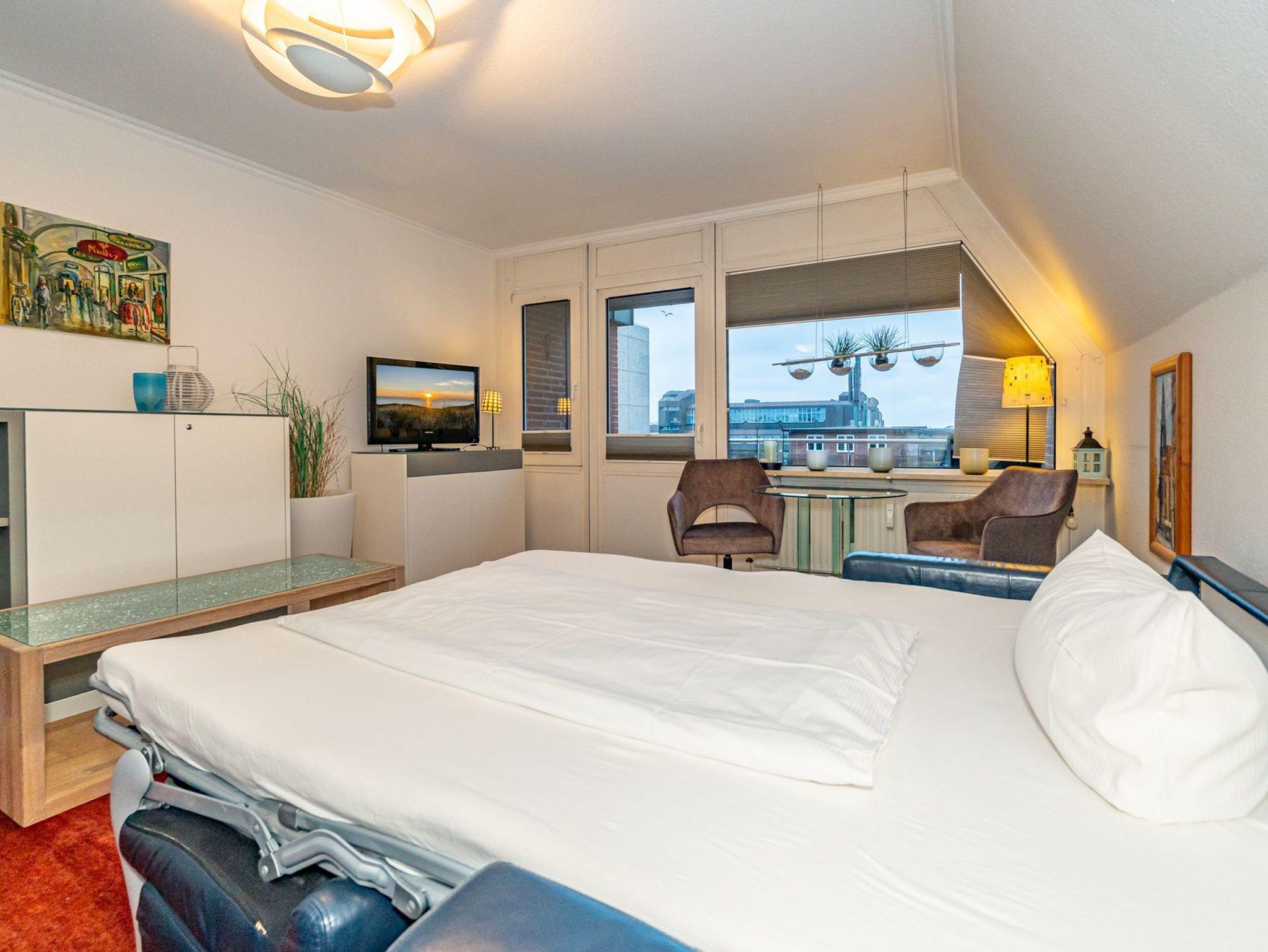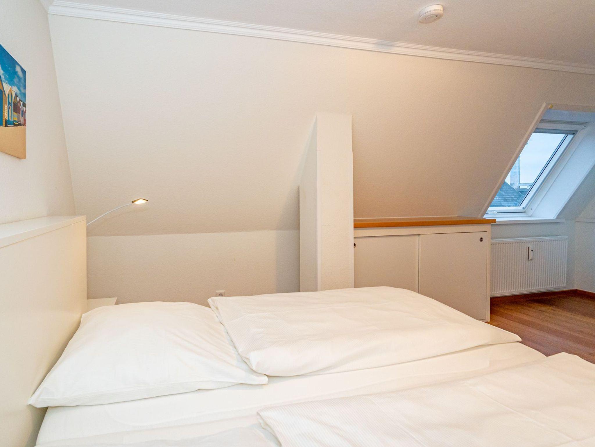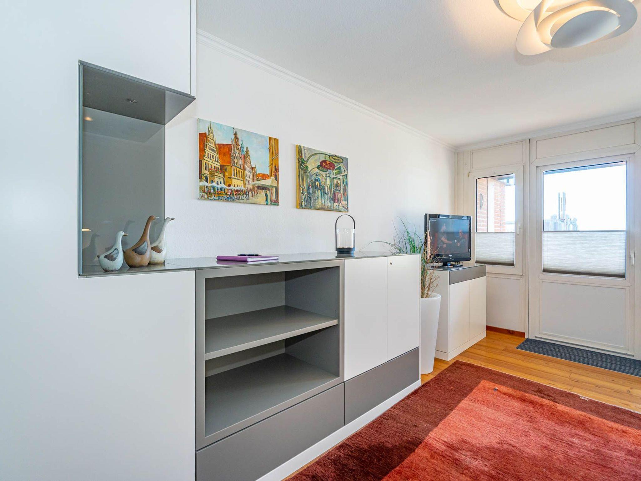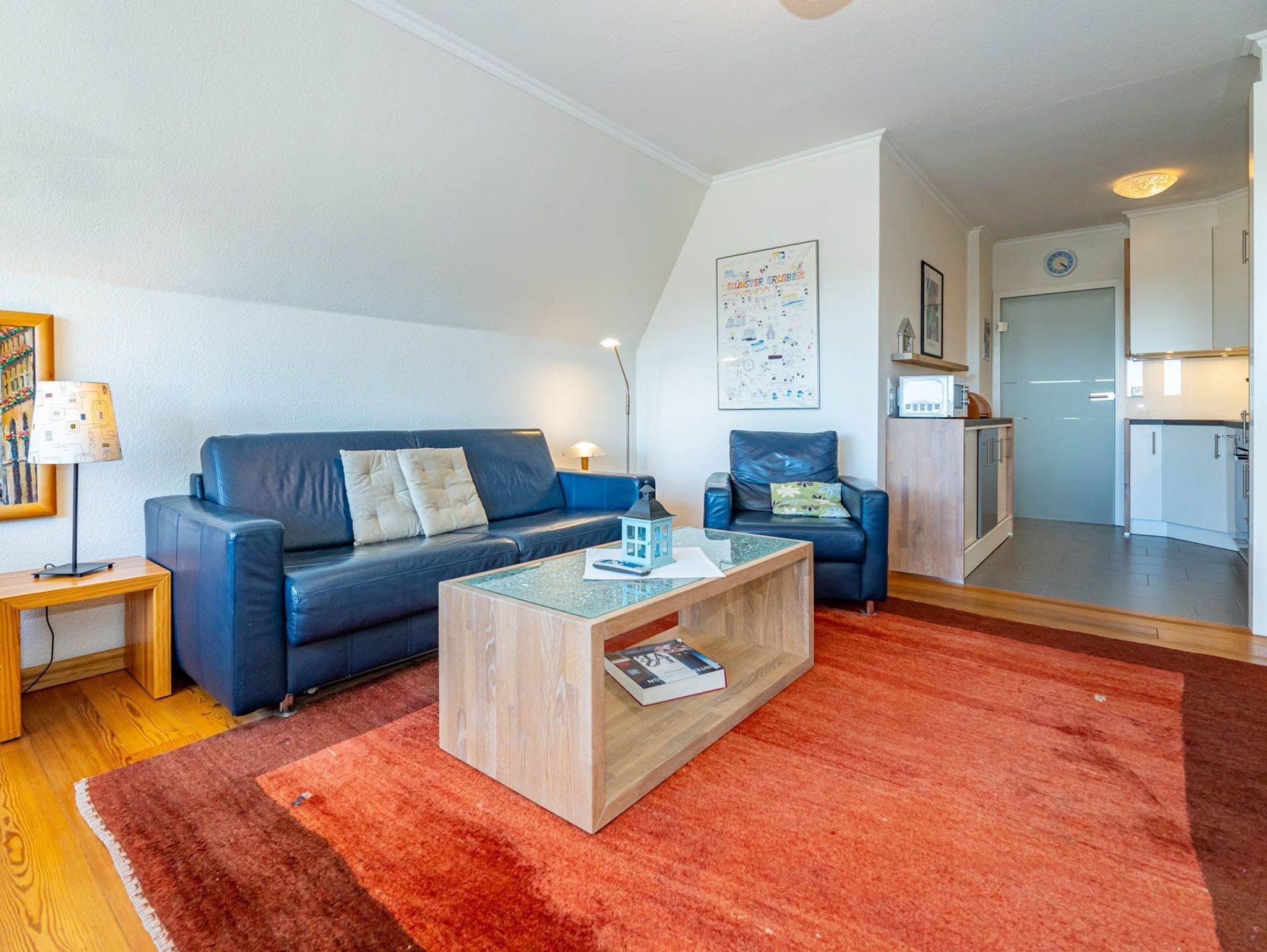 Der Wohn-/Essraum ist mit einer ansprechenden Ledergarnitur (Couch +1 großzügiger Sessel) sowie offener Einbauküche mit hochwertigen Miele-Einbaugeräten wie Geschirrspüler, Herd mit Backofen, Cerankochfeld und separatem Essplatz ausgestattet, An Technik steht ein Kabel-Flachbild-TV und kostenfreier Internetzugang per W-Lan (ohne Gewähr) zur Verfügung. In der Küche gehören Kaffeemaschine, Wasserkocher und Toaster zur Grundausstattung. Von der Diele mit Garderobe, die nahtlos in das Wohn-/Esszimmer übergeht, hat man Zugang zu dem geräumigen und modernen Badezimmer mit bodentiefer Dusche, Waschtisch, Handtuchtrockner, WC und Fenster. Im Appartement befindet sich ein Master-Schlafzimmer mit Doppelbett (gute Einzelmatratzen, Liegefläche jeweils 0,90 x 2,00 m) mit begehbarem Kleiderschrank sowie ein kleines Schlafzimmer mit feststehendem Einzelbett (Liegefläche 0,80 x 1,90 m) und ein Einzel-Hochbett. Das kleine Schlafzimmer erreicht man über das Doppelschlafzimmer (Durchgangszimmer).