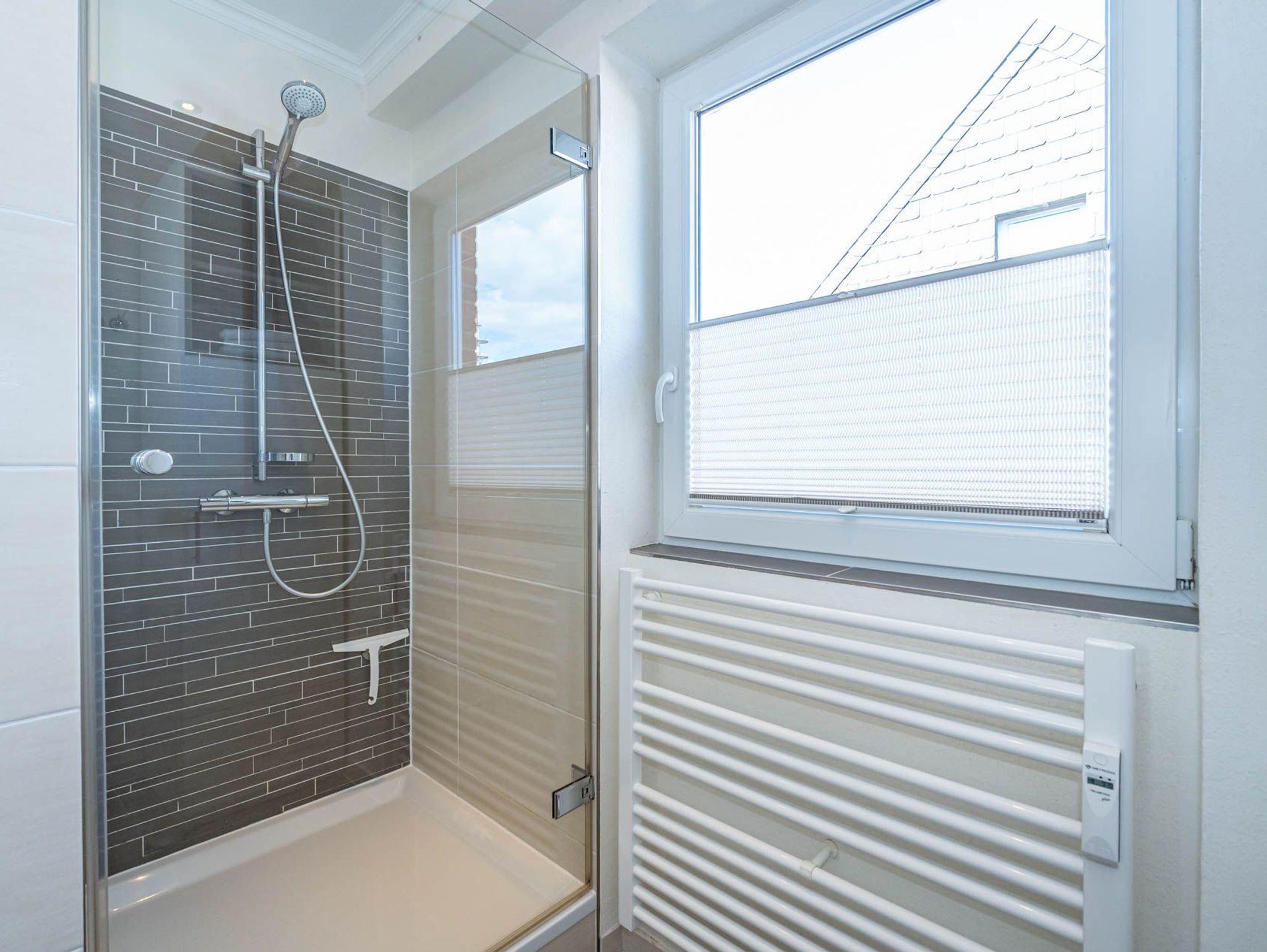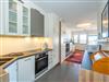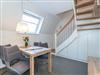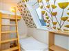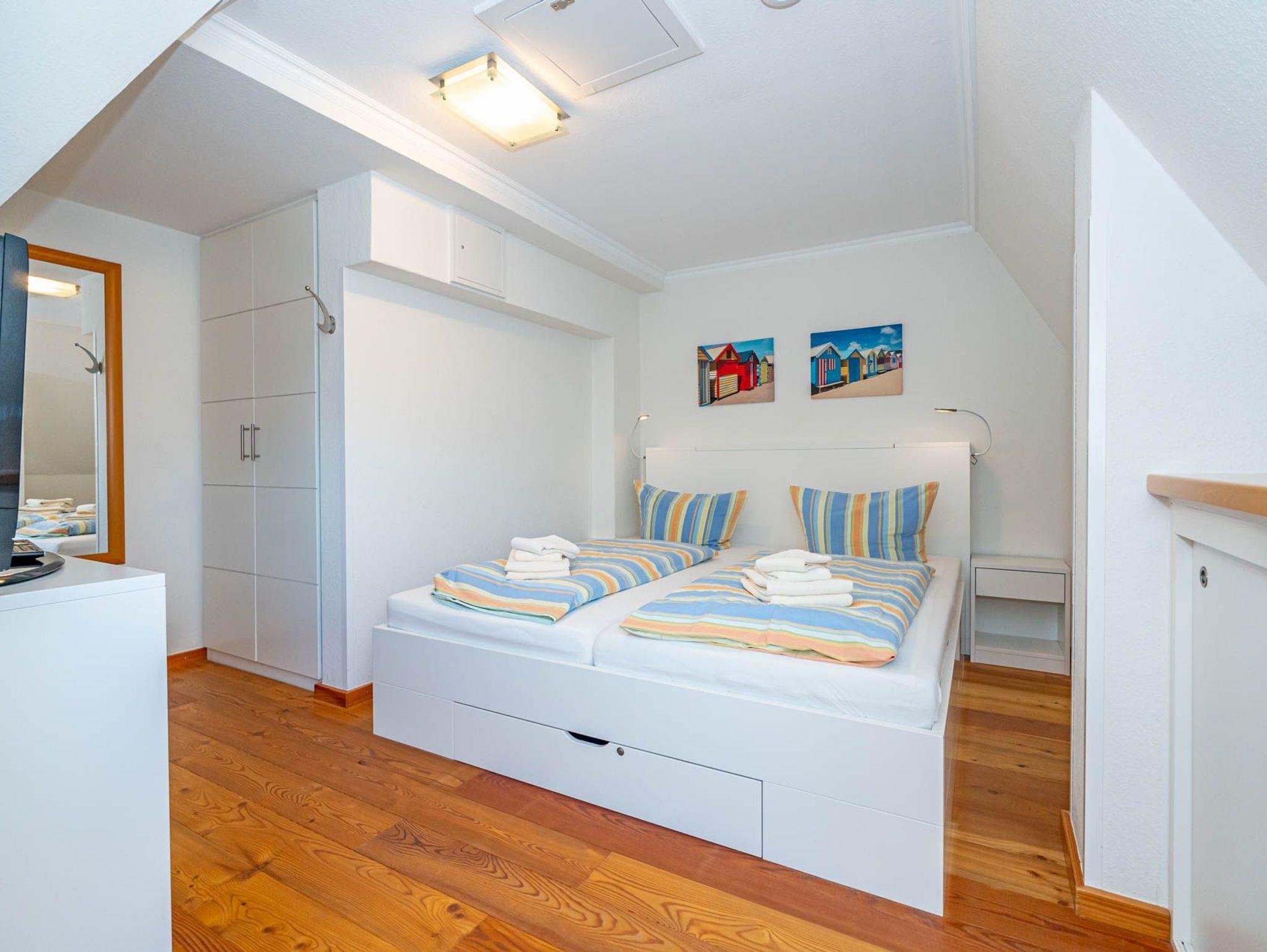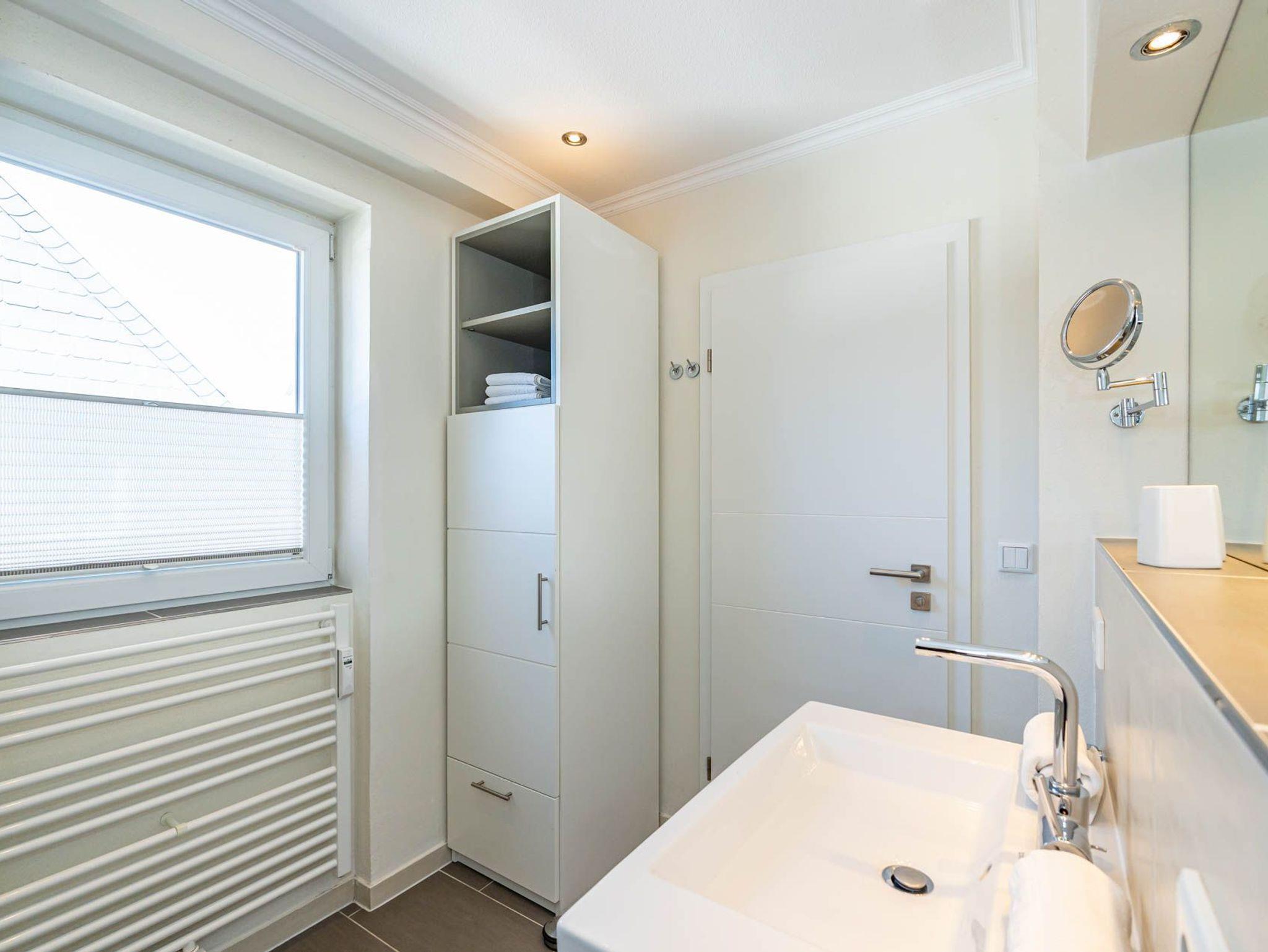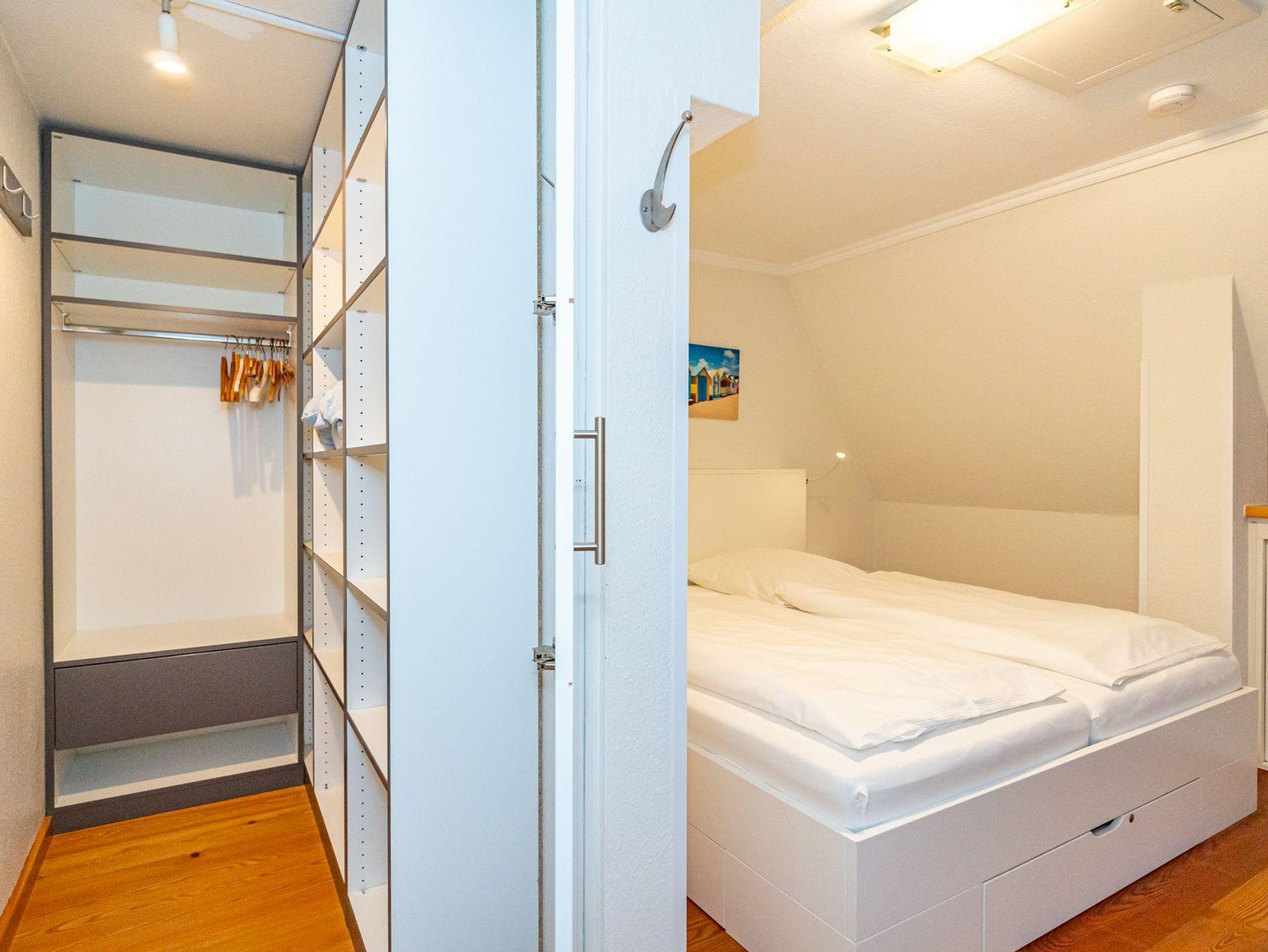 Der Wohn-/Essraum ist mit einer ansprechenden Ledergarnitur (Couch +1 großzügiger Sessel) sowie offener Einbauküche mit hochwertigen Miele-Einbaugeräten wie Geschirrspüler, Herd mit Backofen, Cerankochfeld und separatem Essplatz ausgestattet, An Technik steht ein Kabel-Flachbild-TV und kostenfreier Internetzugang per W-Lan (ohne Gewähr) zur Verfügung. In der Küche gehören Kaffeemaschine, Wasserkocher und Toaster zur Grundausstattung. Von der Diele mit Garderobe, die nahtlos in das Wohn-/Esszimmer übergeht, hat man Zugang zu dem geräumigen und modernen Badezimmer mit bodentiefer Dusche, Waschtisch, Handtuchtrockner, WC und Fenster. Im Appartement befindet sich ein Master-Schlafzimmer mit Doppelbett (gute Einzelmatratzen, Liegefläche jeweils 0,90 x 2,00 m) mit begehbarem Kleiderschrank sowie ein kleines Schlafzimmer mit feststehendem Einzelbett (Liegefläche 0,80 x 1,90 m) und ein Einzel-Hochbett. Das kleine Schlafzimmer erreicht man über das Doppelschlafzimmer (Durchgangszimmer).