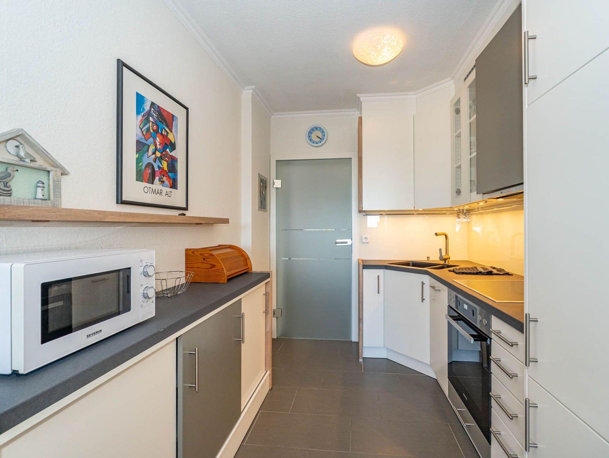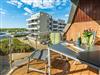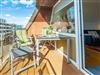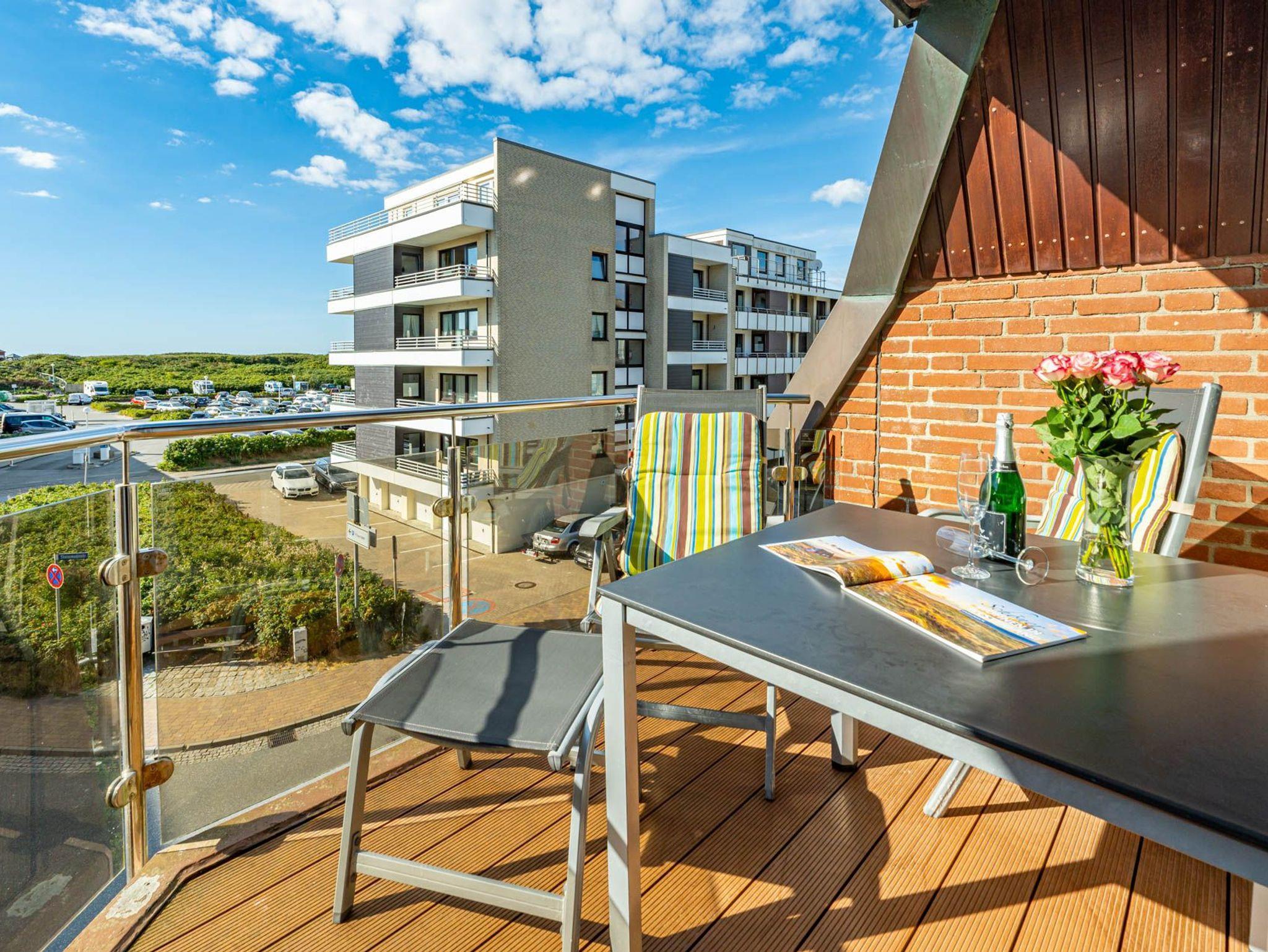 Der sonnige Westbalkon (mit Balkonmöbeln und Auflagen, Balkonbelag in WPC-Holz) lädt zum verweilen ein. Hier hat man Sonne von Mittags bis in die Abendstunden und einen kleinen (eingeschränkten) Meerblick.