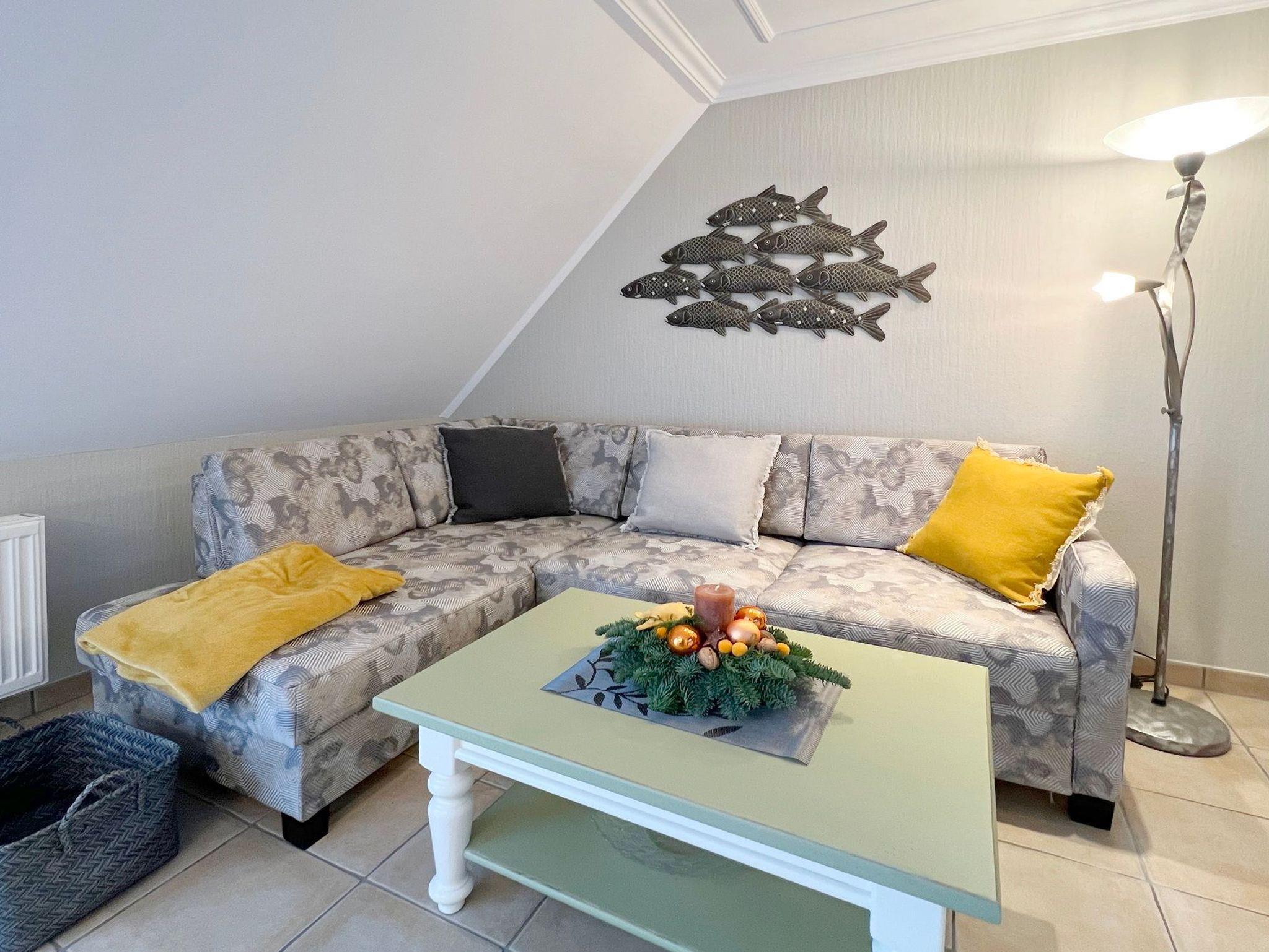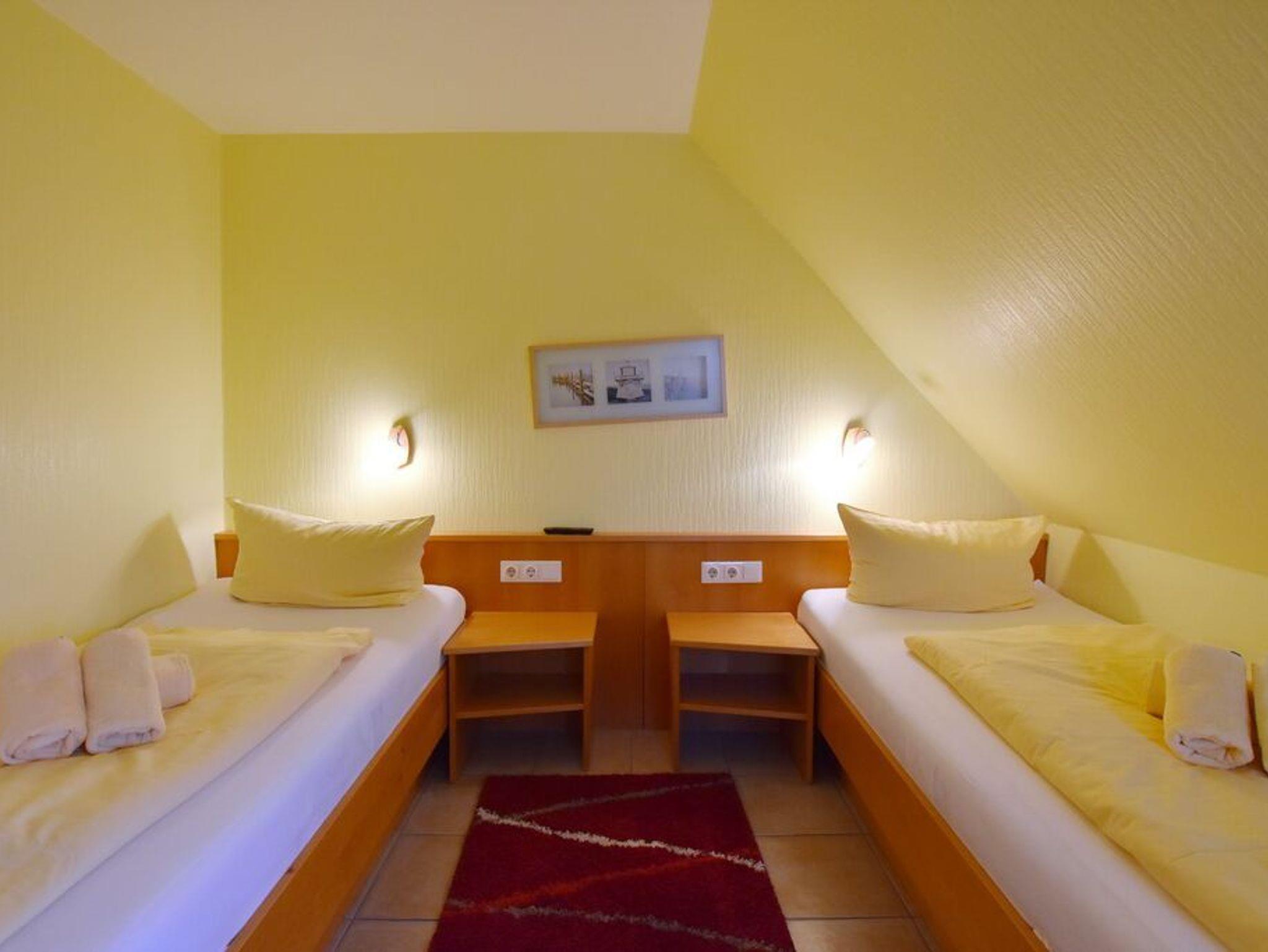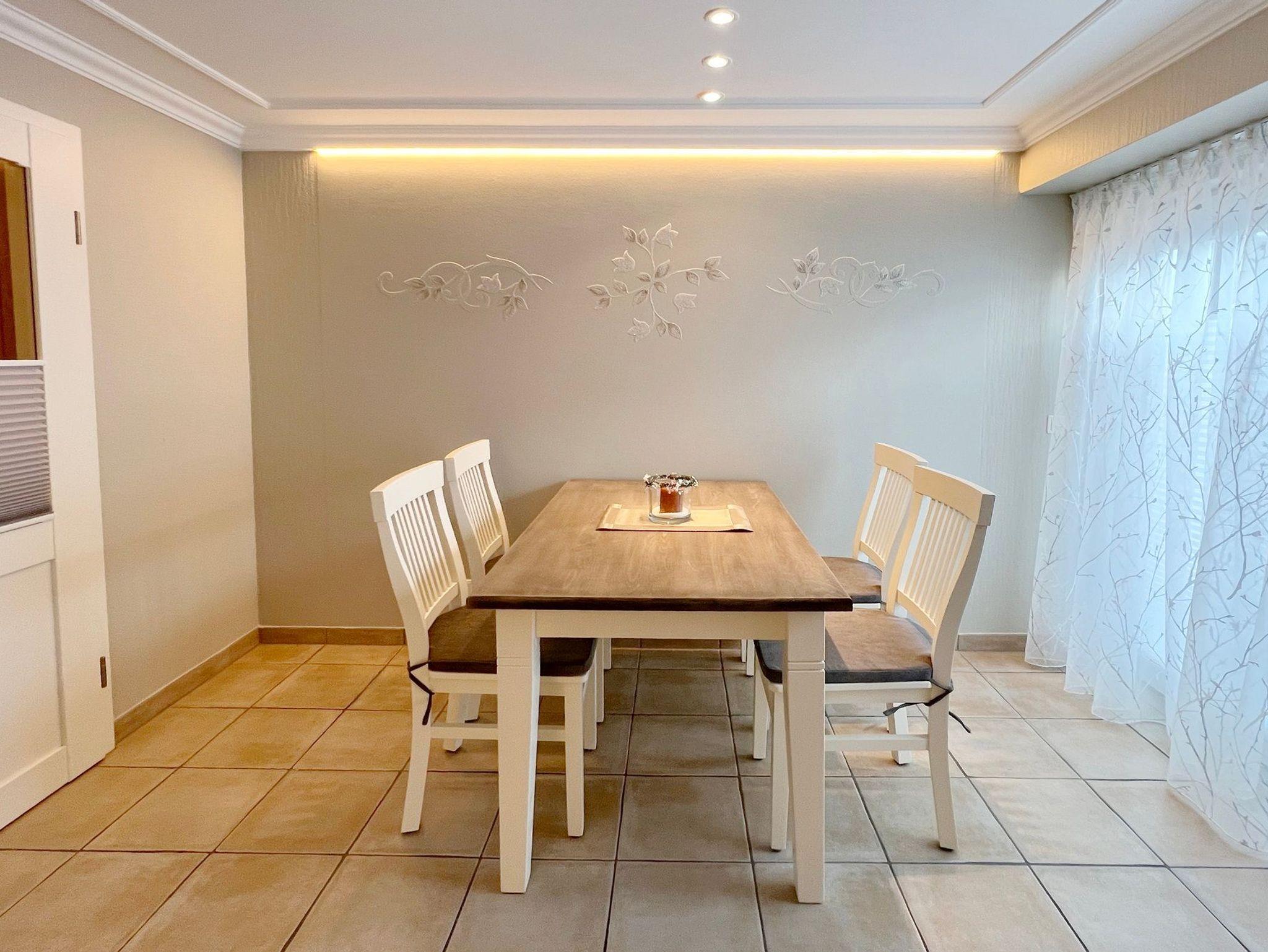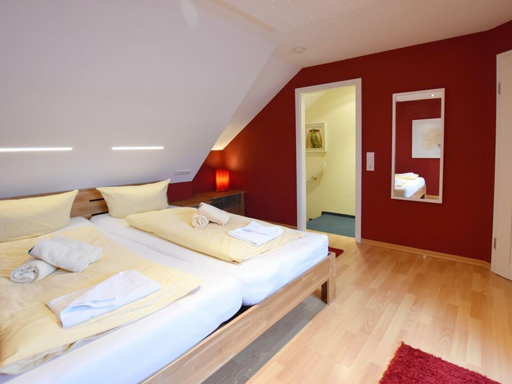 3 Zimmerwohnung mit Balkon (OG und DG), Wohnzimmer mit gemütlicher Sitzgruppe und Eßecke, offene Küche mit Cerankochfeld, und Geschirrspüler, Flatscreen-TV, 2 Schlafzimmer für je 2 Personen mit jeweils eigenem Badezimmer mit Dusche WC und Waschbecken, im UG befinden sich für die Gäste des Hauses Waschmaschine und Trockner gegen Gebühr. 1 PKW-Stellplatz. Gerne dürfen Sie hier ein gut erzogenes Haustier mitbringen. Dafür wird dann eine einmalige Haustiergebühr berechnet.