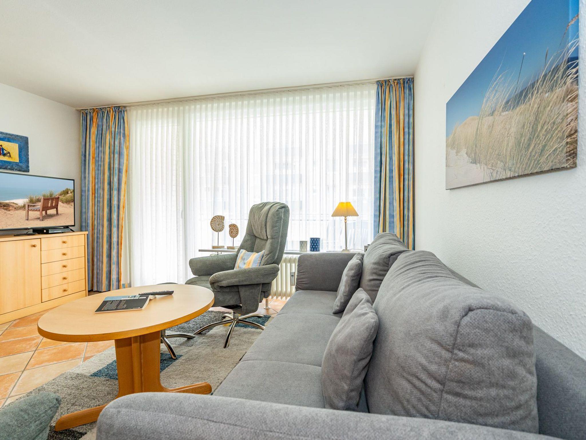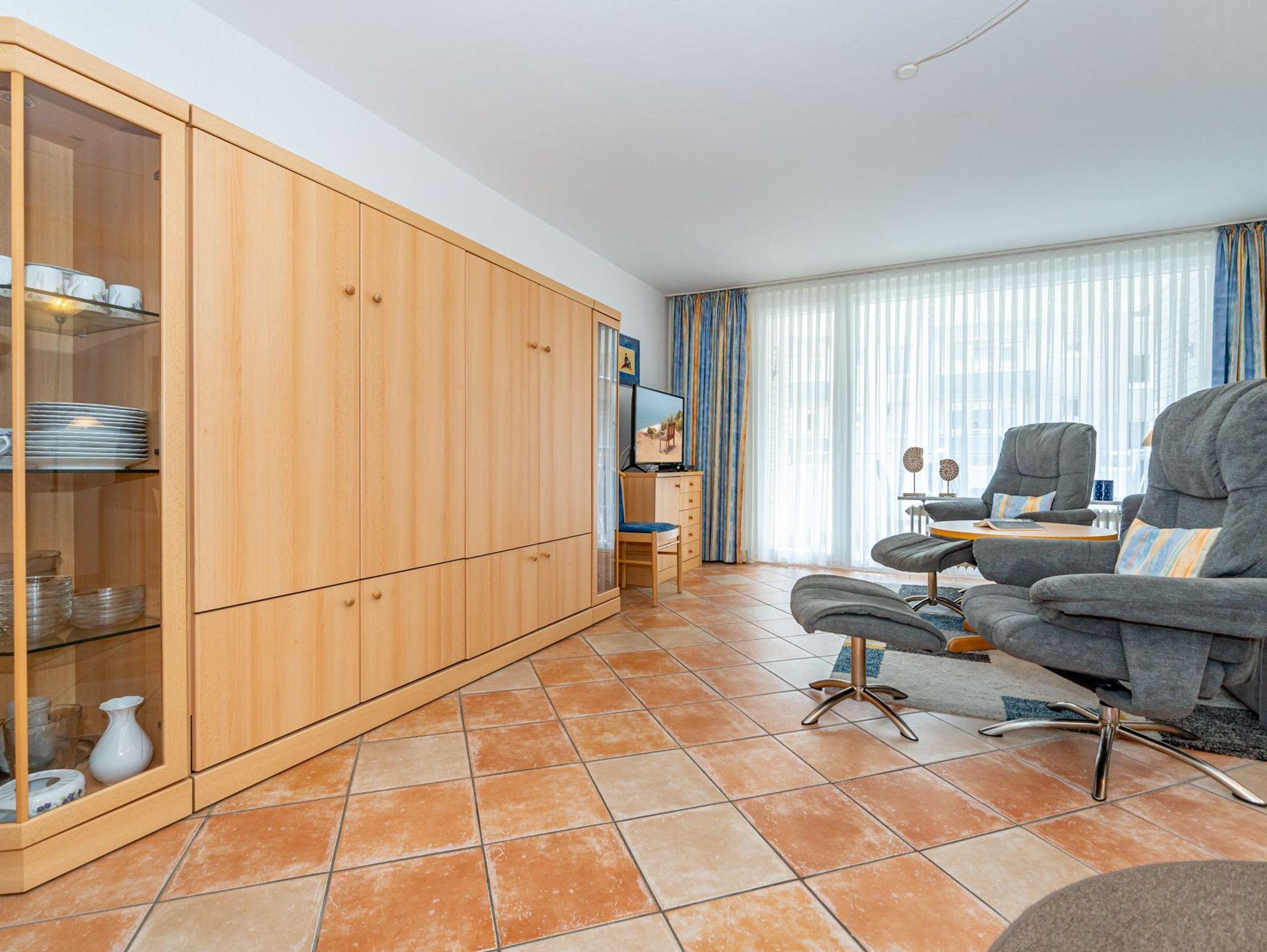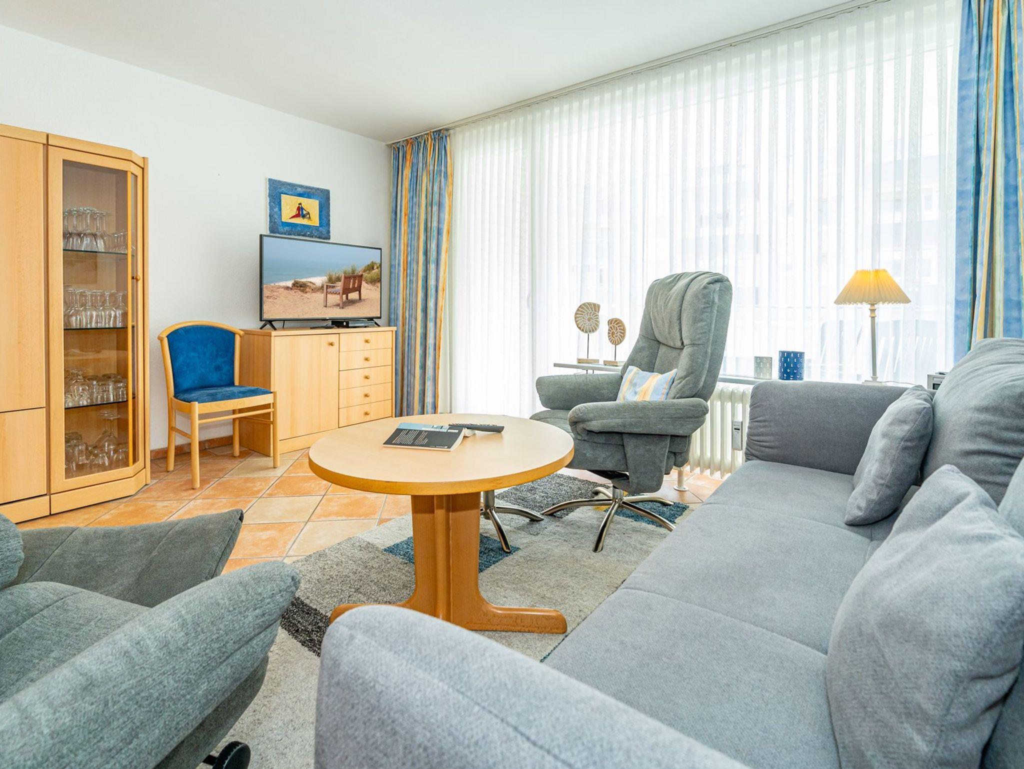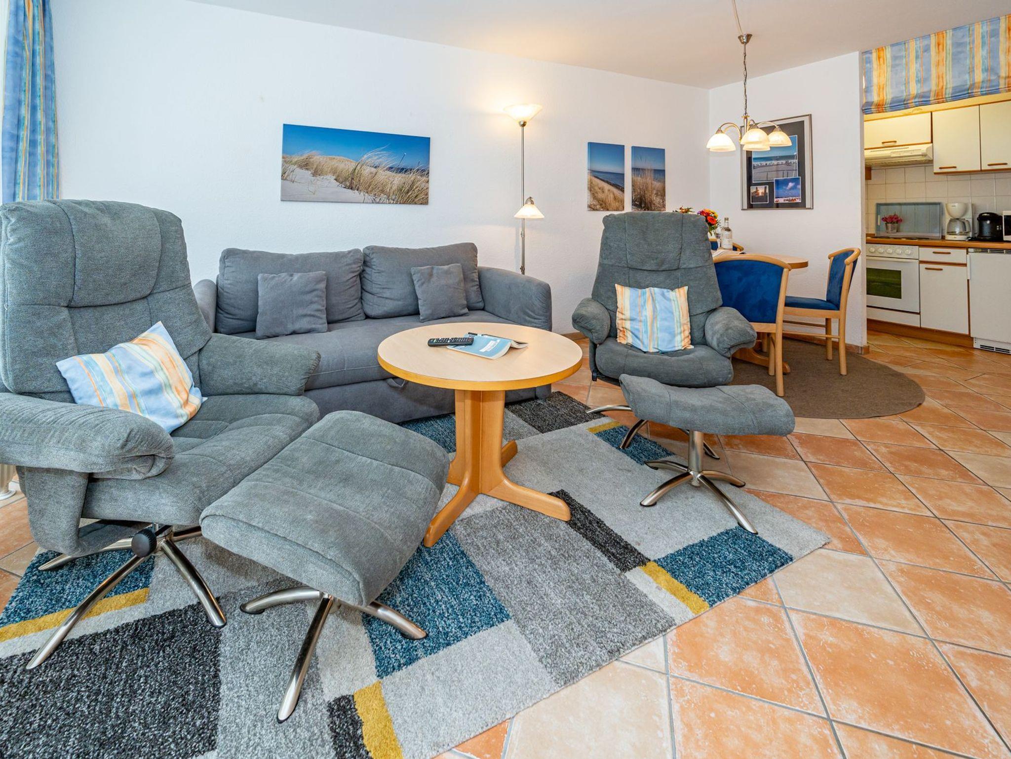 Der Wohnraum besteht aus einer bequemen Sitzgarnitur (2-Sitzer-Couch, 2 Sessel), einem Essplatz, einem Doppelschrankbett (einzeln ausklappbar), Flachbild-TV (HD-Ready mit digitalem Empfang mit ca. 60-100 Radio- und Fernsehprogrammen), DVD-Player, Radio/CD, kostenlose Flatrate ins deutsche Festnetz, W-Lan.