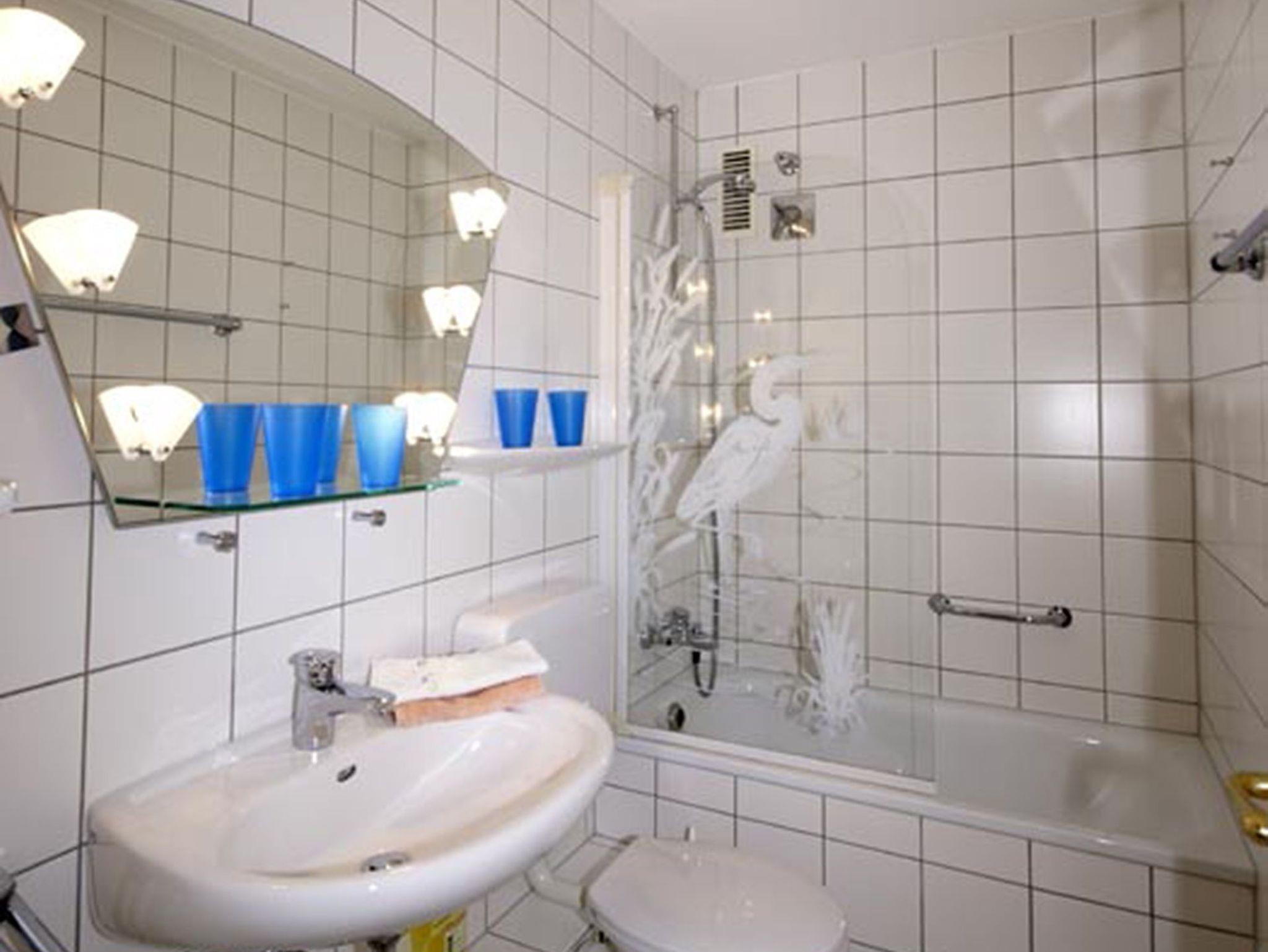 Im Bad befinden sich eine Wanne mit Duschvorrichtung, ein WC, ein Waschtisch und ein Fön.