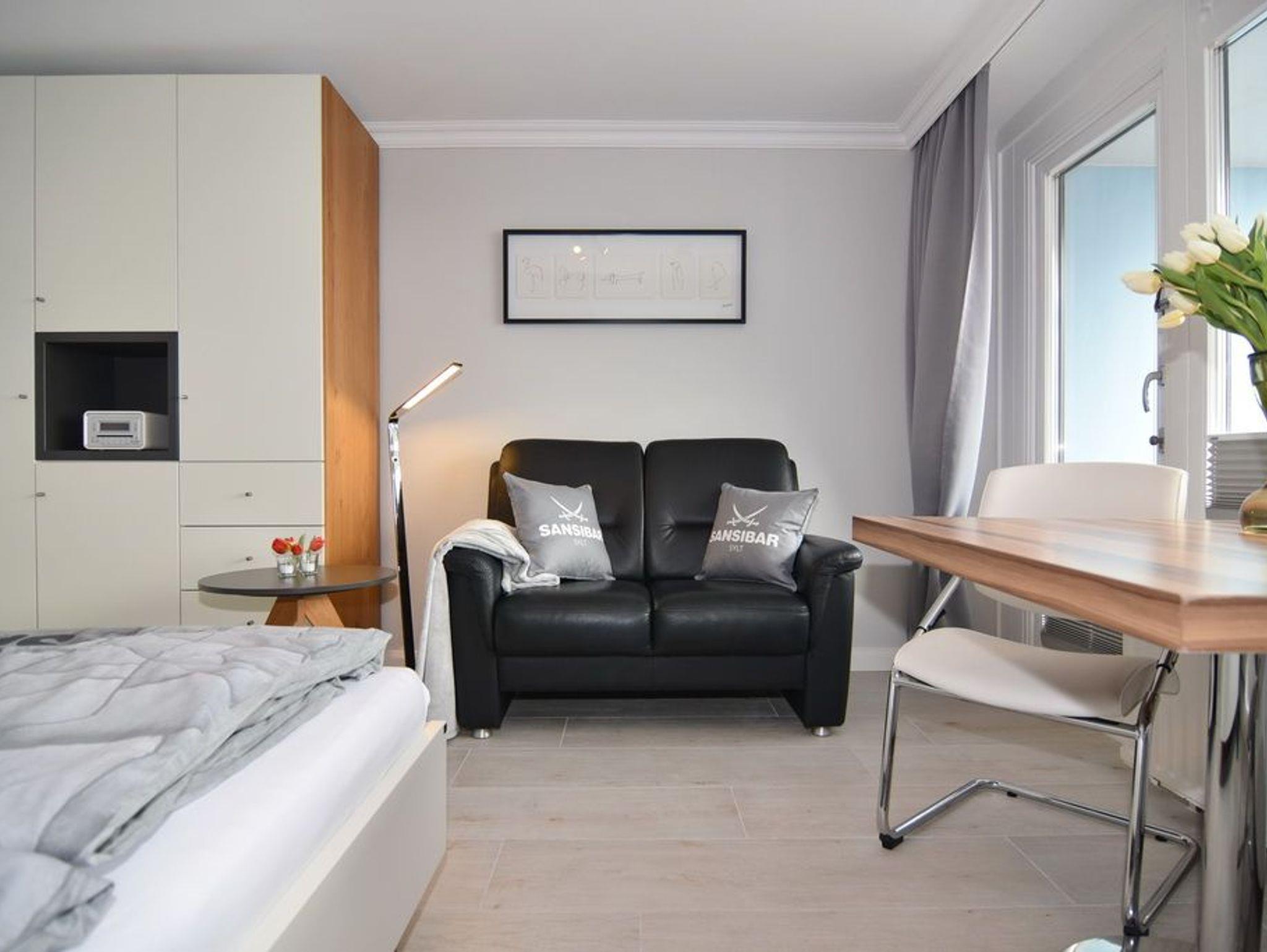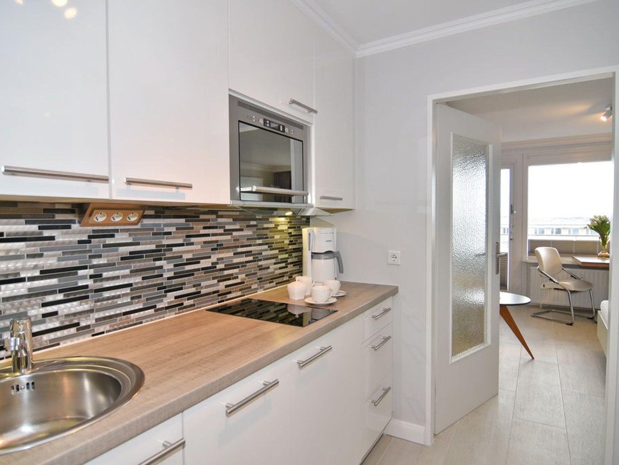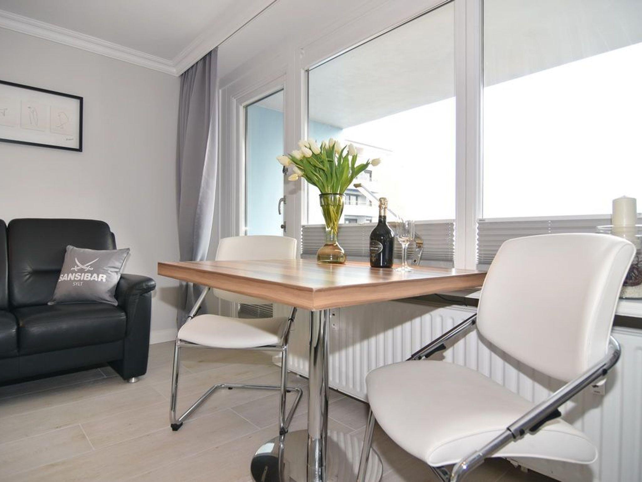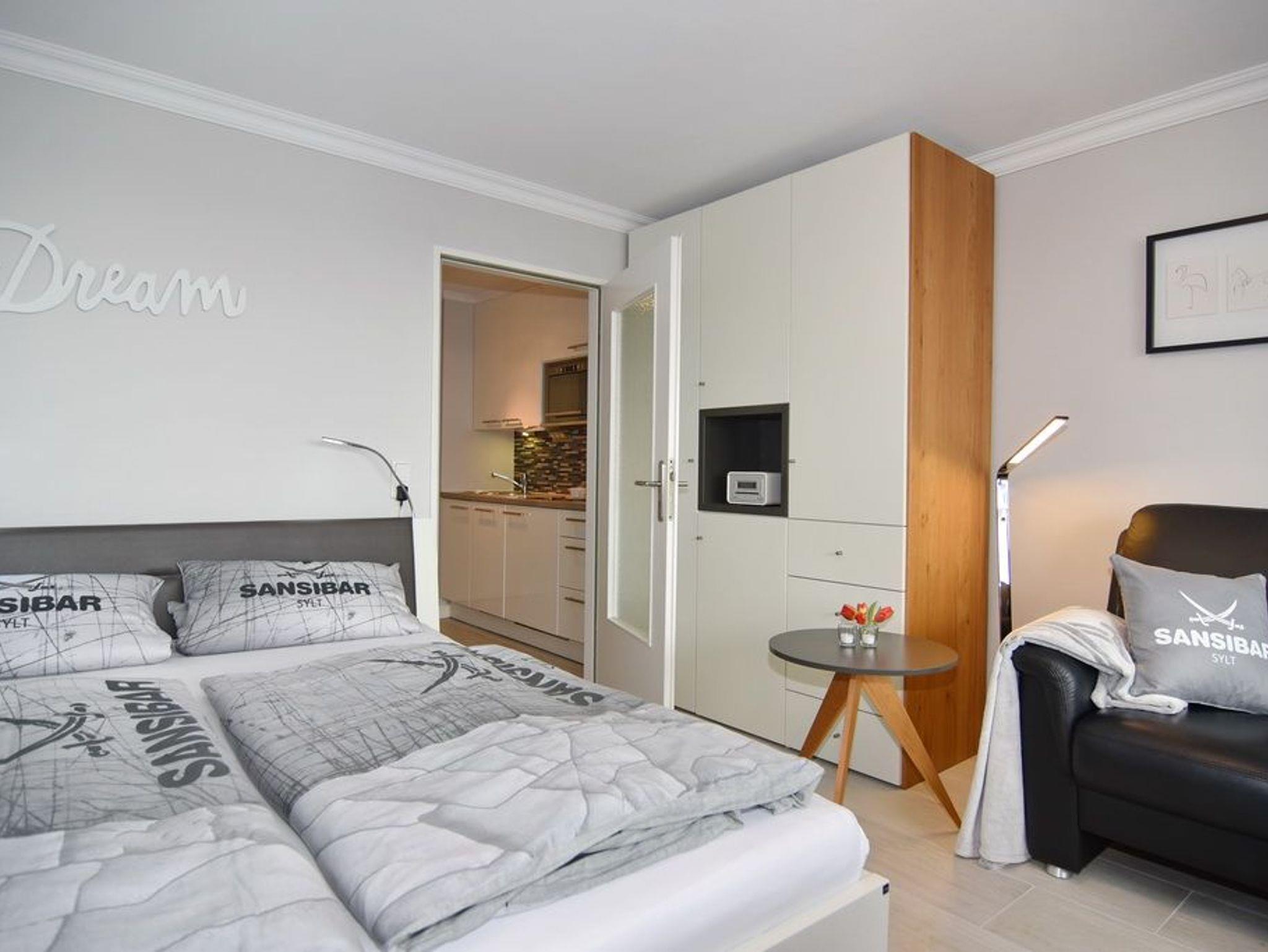 Attraktive 1-Zimmer-Ferienwohnung im 5. OG des Haus Metropol. (Nichtraucher) Wohn-/ Schlafraum mit Doppelbett (2 Matratzen á 80 cm), Essplatz am Fenster, 2-Sitzer-Couch, Flat-TV, Radio, DVD und Blu Ray Player. W-Lan (ohne Gewähr). Moderne Küchenzeile mit Mikrowelle und Geschirrspüler im Flurbereich, Duschbad/WC. Ostbalkon mit Blick über Westerland. Tierhaltung ist nicht gestattet. Das Appartement ist mit Parkett ausgelegt. Bettwäsche und Handtücher sind zur Anreise aufgezogen. Ein PKW-Stellplatz kann kostenpflichtig zugebucht werden.