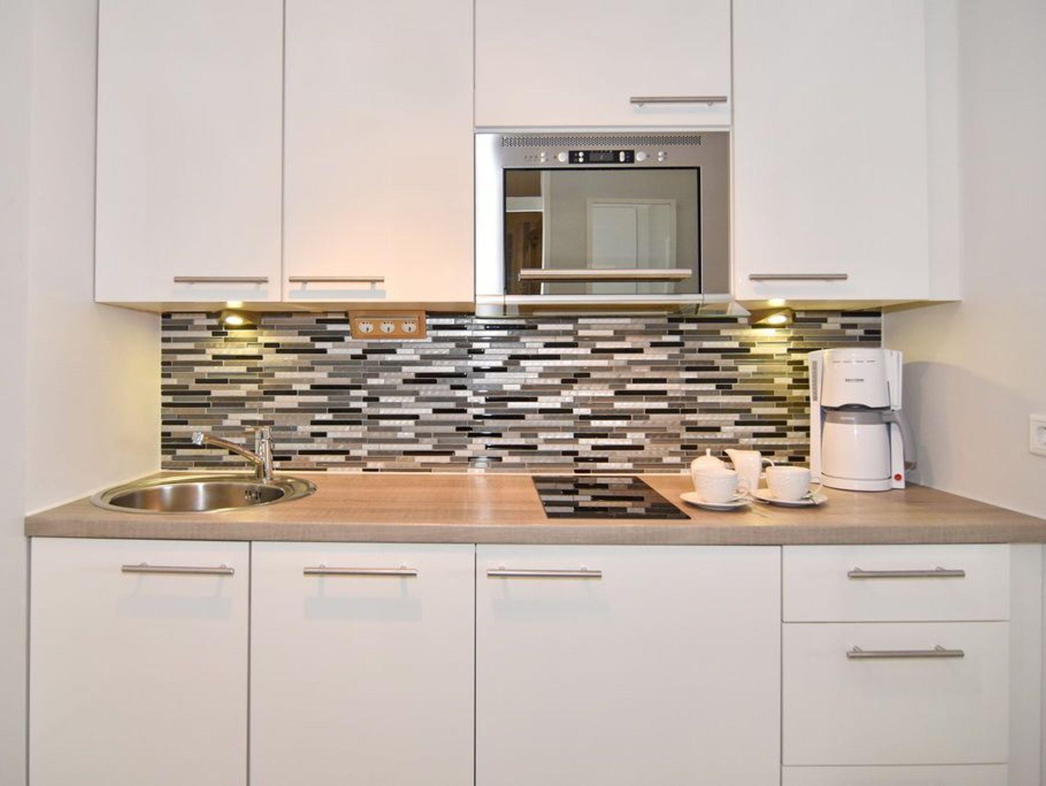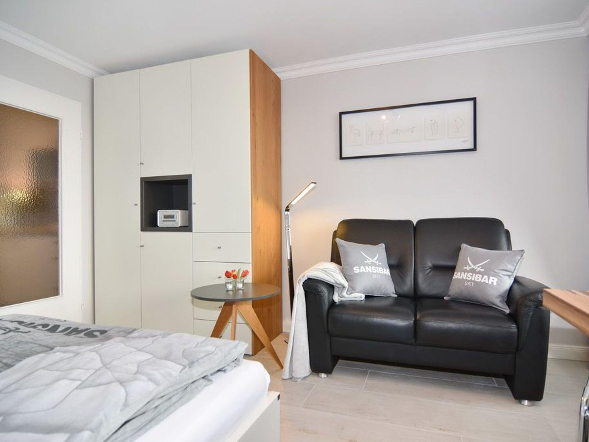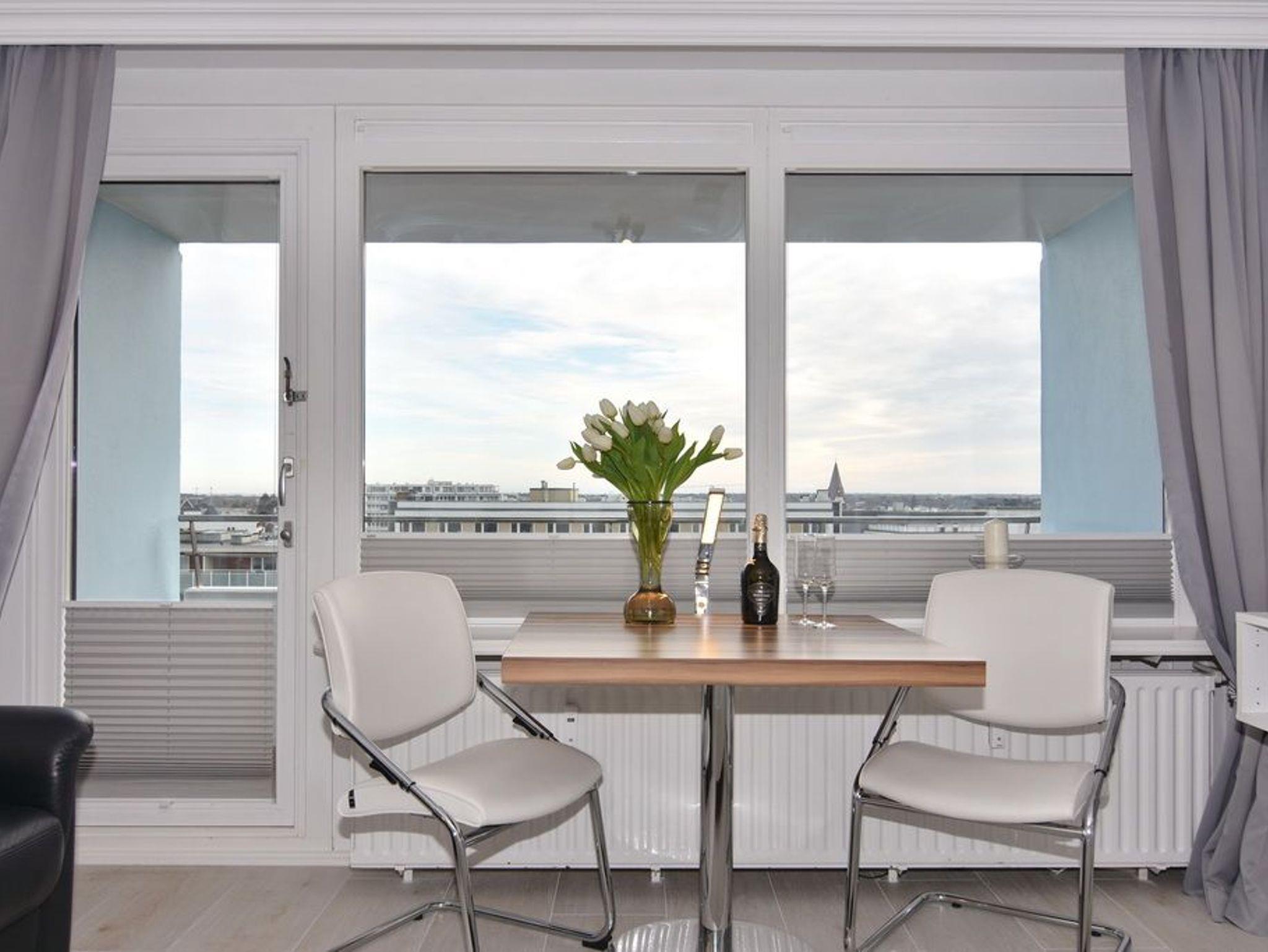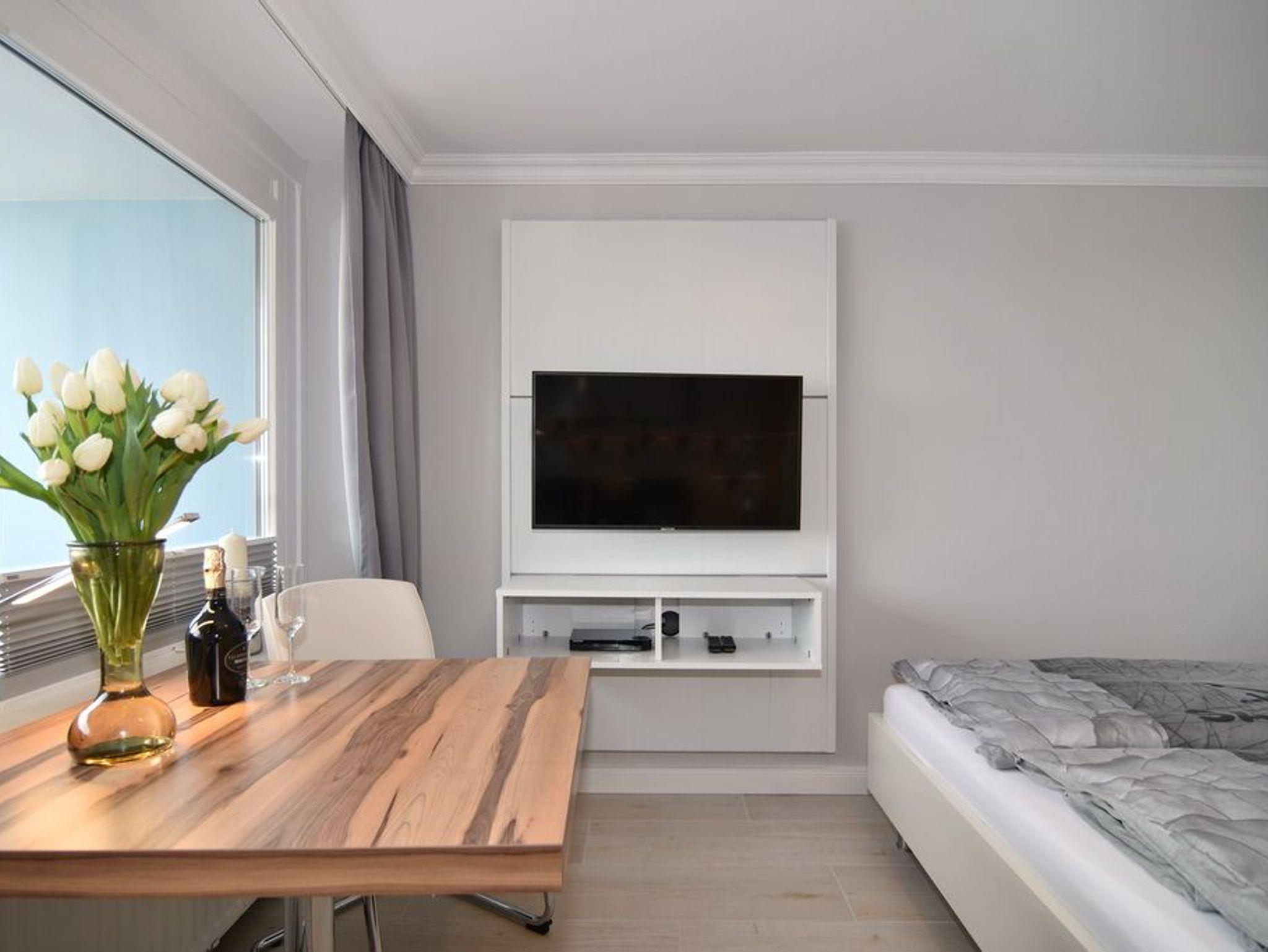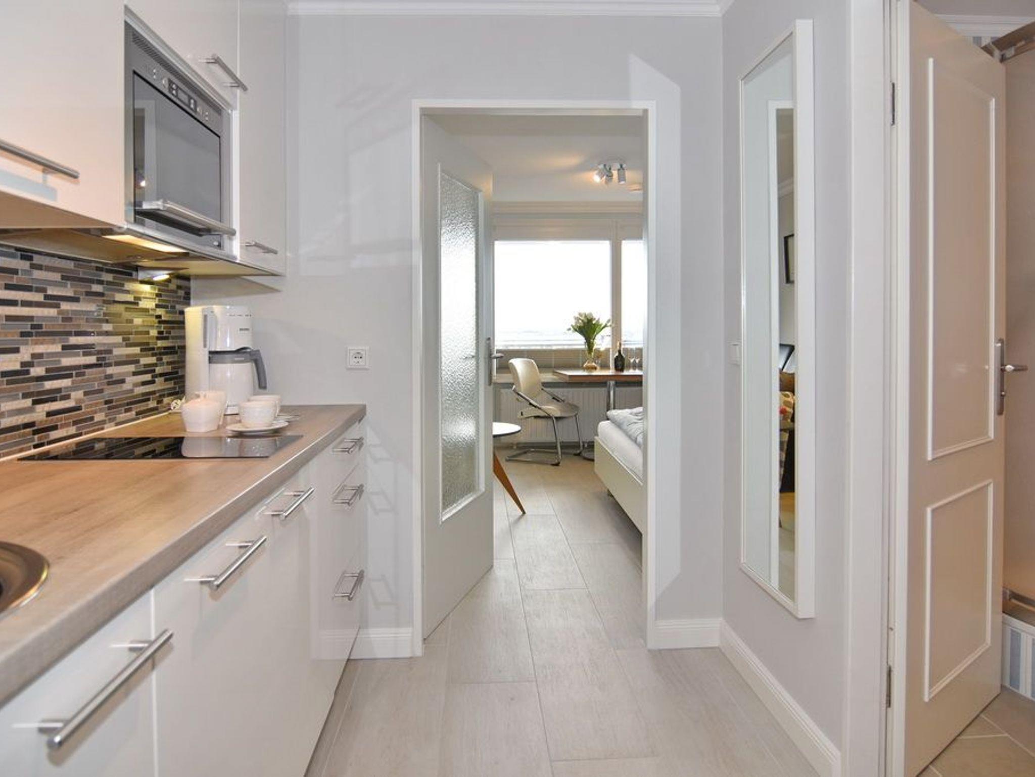 Attraktive 1-Zimmer-Ferienwohnung im 5. OG des Haus Metropol. (Nichtraucher) Wohn-/ Schlafraum mit Doppelbett (2 Matratzen á 80 cm), Essplatz am Fenster, 2-Sitzer-Couch, Flat-TV, Radio, DVD und Blu Ray Player. W-Lan (ohne Gewähr). Moderne Küchenzeile mit Mikrowelle und Geschirrspüler im Flurbereich, Duschbad/WC. Ostbalkon mit Blick über Westerland. Tierhaltung ist nicht gestattet. Das Appartement ist mit Parkett ausgelegt. Bettwäsche und Handtücher sind zur Anreise aufgezogen. Ein PKW-Stellplatz kann kostenpflichtig zugebucht werden.